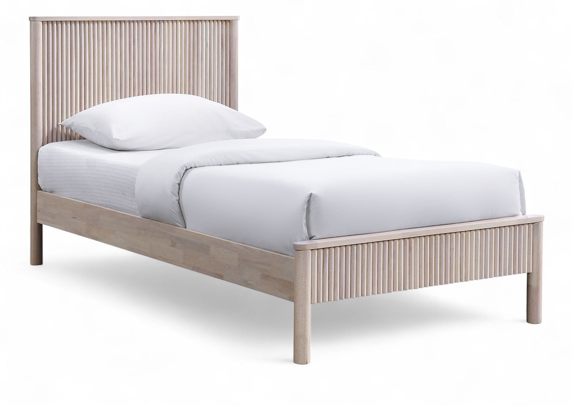 The sturdy Kivo solid wood bed in a rich finish brings timeless warmth to your bedroom. Vertical slatted detailing across the headboard and footboard adds a striking mid-century touch while keeping the look clean and modern. Built from solid wood, this piece blends durability with understated sophistication for a bed that anchors the room with style.