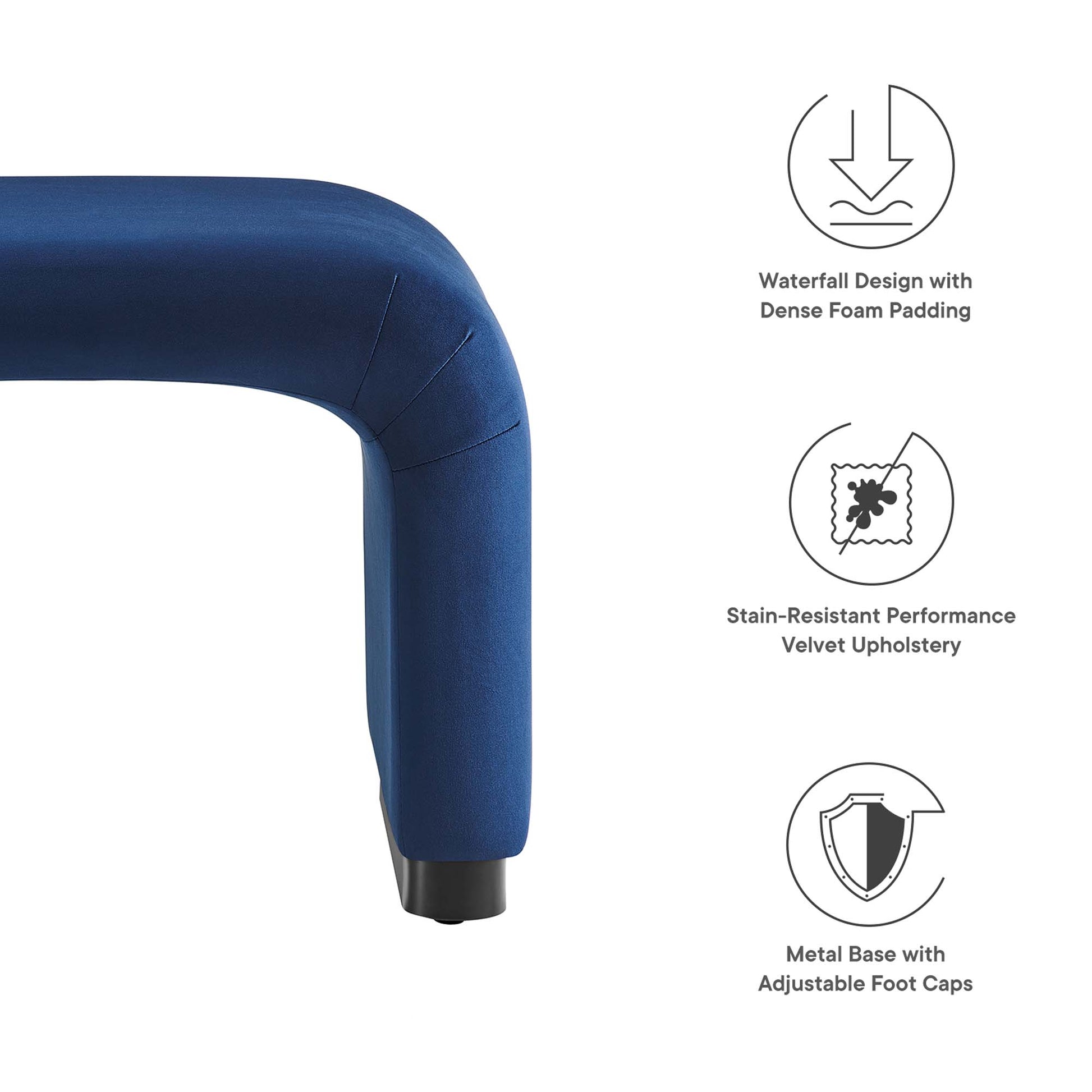 Let the Koda Performance Velvet Stool redefine your space with its style and adaptability. Crafted with a sturdy plywood frame, this backless stool exudes a soft and flowing silhouette. Koda features stain-resistant performance velvet upholstery and a unique waterfall design. This multifunctional piece serves as both a chic stool and a fashionable side table, effortlessly blending classic design with a touch of contemporary allure. The dense foam padding ensures a comfortable experience, whether as extra seating, a stylish surface, or a statement piece in your living room, lounge, or hallway. The Koda Upholstered Stool stands elegantly on a solid metal base with non-marking adjustable foot caps, ensuring stability while protecting your flooring. Assembly Required. Weight Capacity: 331 lbs.