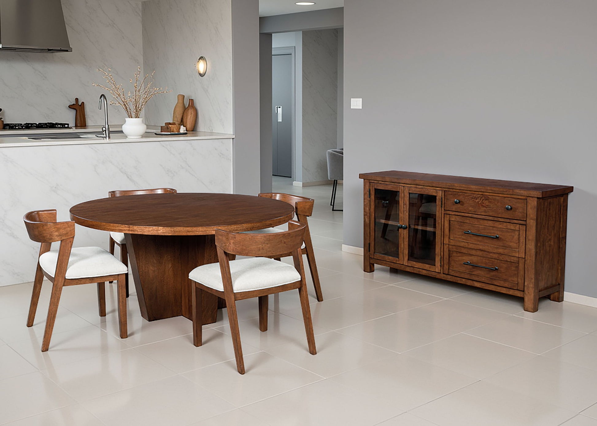Add exceptional modern farmhouse appeal to your eating and gathering space with this round dining table. A warm brown wood-tone finish enhances the rich natural beauty. With eye-catching architectural geometry and a bold, chunky silhouette, this versatile piece offers a casually delicious design that’s right at home for dining or when friends stop by.