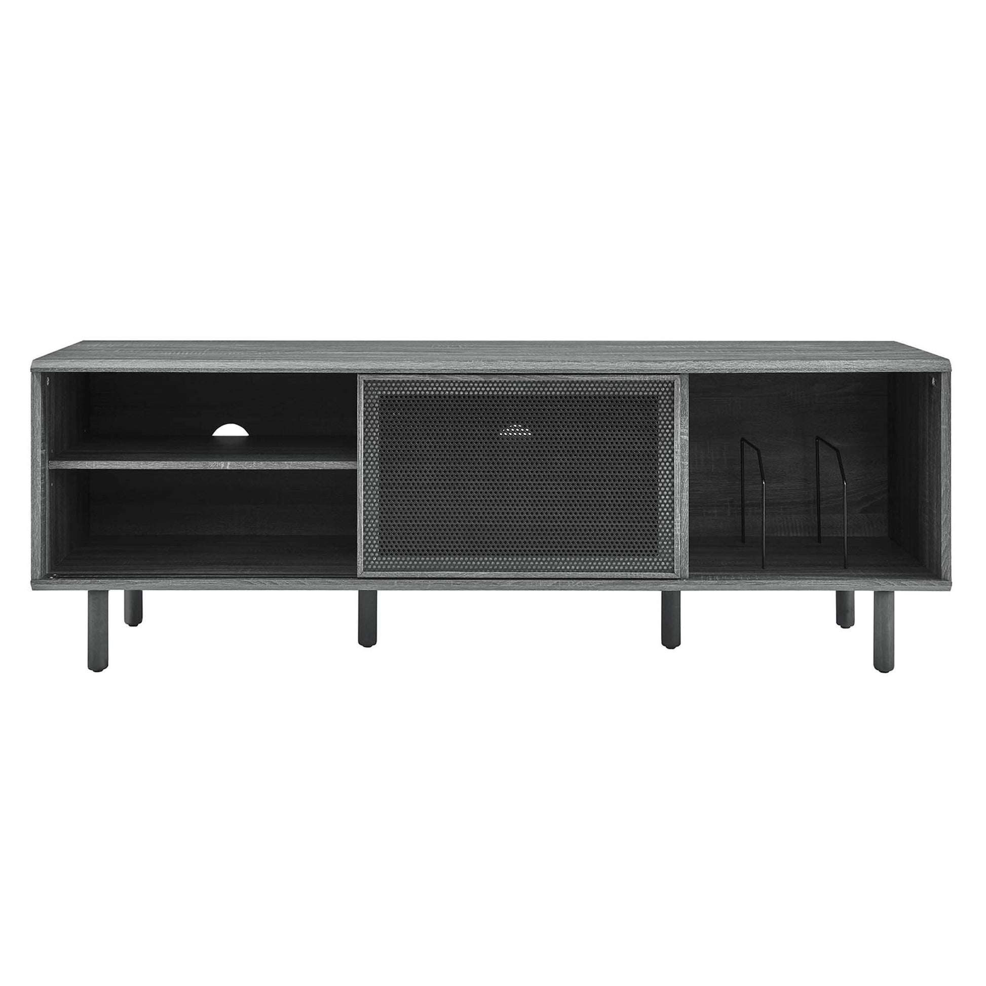 Bring urban flare to your living space with the modern design of the Kurtis 67" TV and Vinyl Record Display Stand. Featuring sliding metal mesh doors, this entertainment center brings industrial design to the living room, bedroom, home office, or lounge area. This media stand is crafted from MDF and particleboard with a natural wood grain design. Offering ample storage space for all your media essentials, this TV console features an open shelving area concealed by mesh sliding doors with cable management holes that keep things organized and allow for flow through ventilation. Display your vinyl record collection with the metal dividers on this versatile display stand. Resting on sturdy wood legs with non-marking foot pads to protect flooring, this low-profile TV stand accommodates flat screen TVs up to 65 inches. Assembly required. Weight Capacity: 200 lbs.