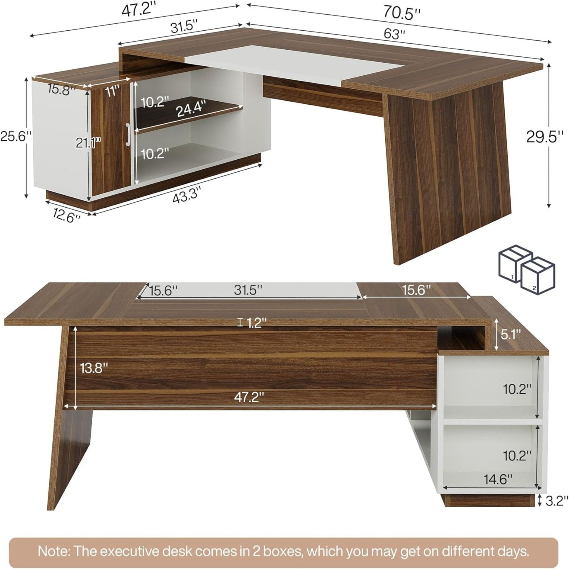 L-Shaped Executive Desk With Storage Cabinet And Shelves For Home Office - White / Walnut