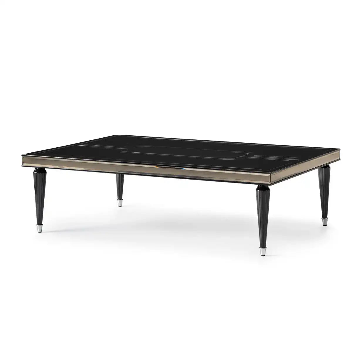 Finished in a striking reflective black hue, this modern table is adorned with an engraved glass top and beveled mirrored edges that effortlessly catch the eye. Enhance your living space with the sophisticated charm of this stunning cocktail table, designed to create an ambiance of refined elegance and contemporary flair.