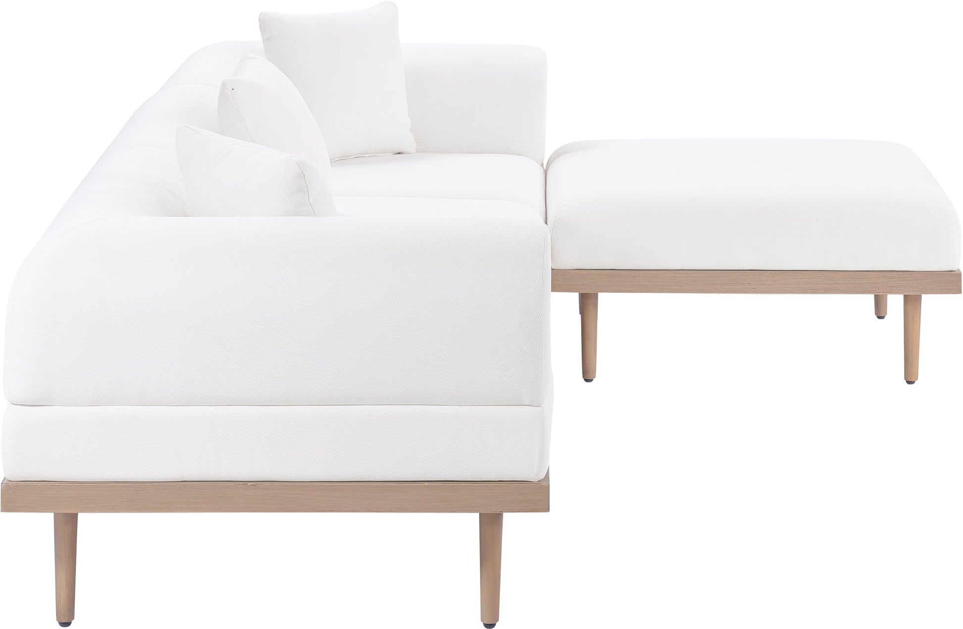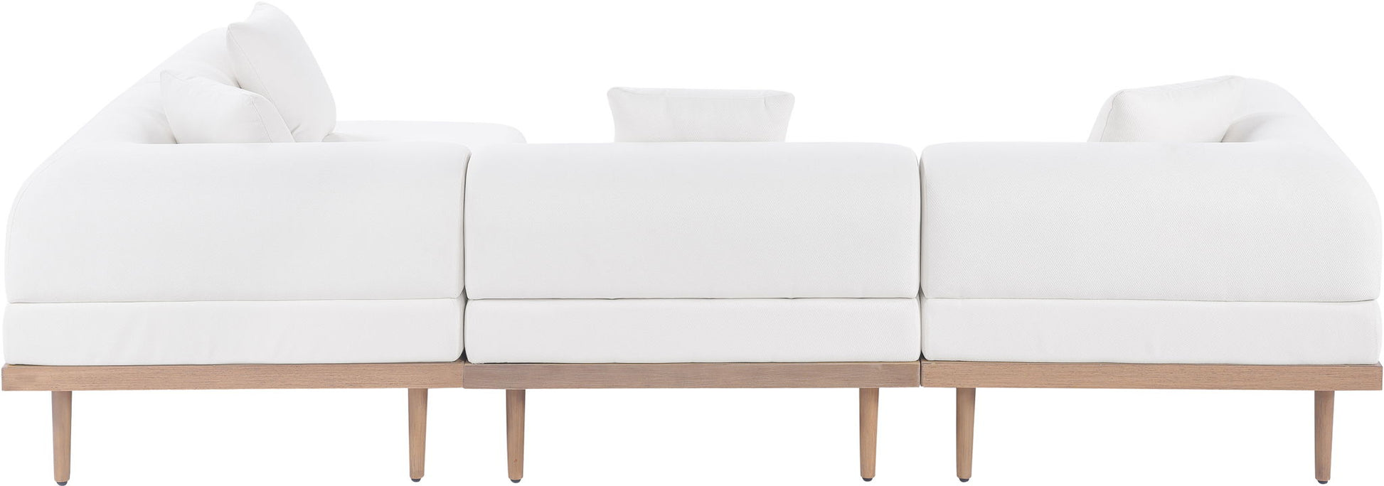 Sleek lines and soft water-resistant fabric bring contemporary style to the Laguna outdoor patio modular sectional. Crafted with a natural teak finish aluminum frame and quick-dry foam, it's built for ultimate outdoor relaxation. Rearrange or add to the set for endless configurations, creating a versatile lounging experience tailored to your space.