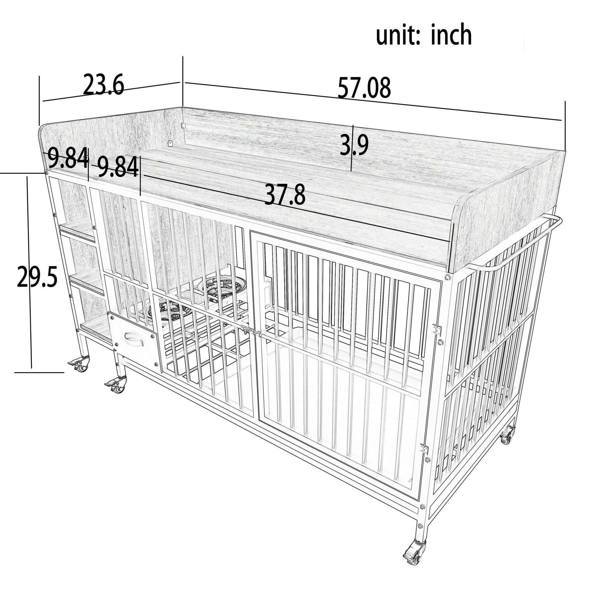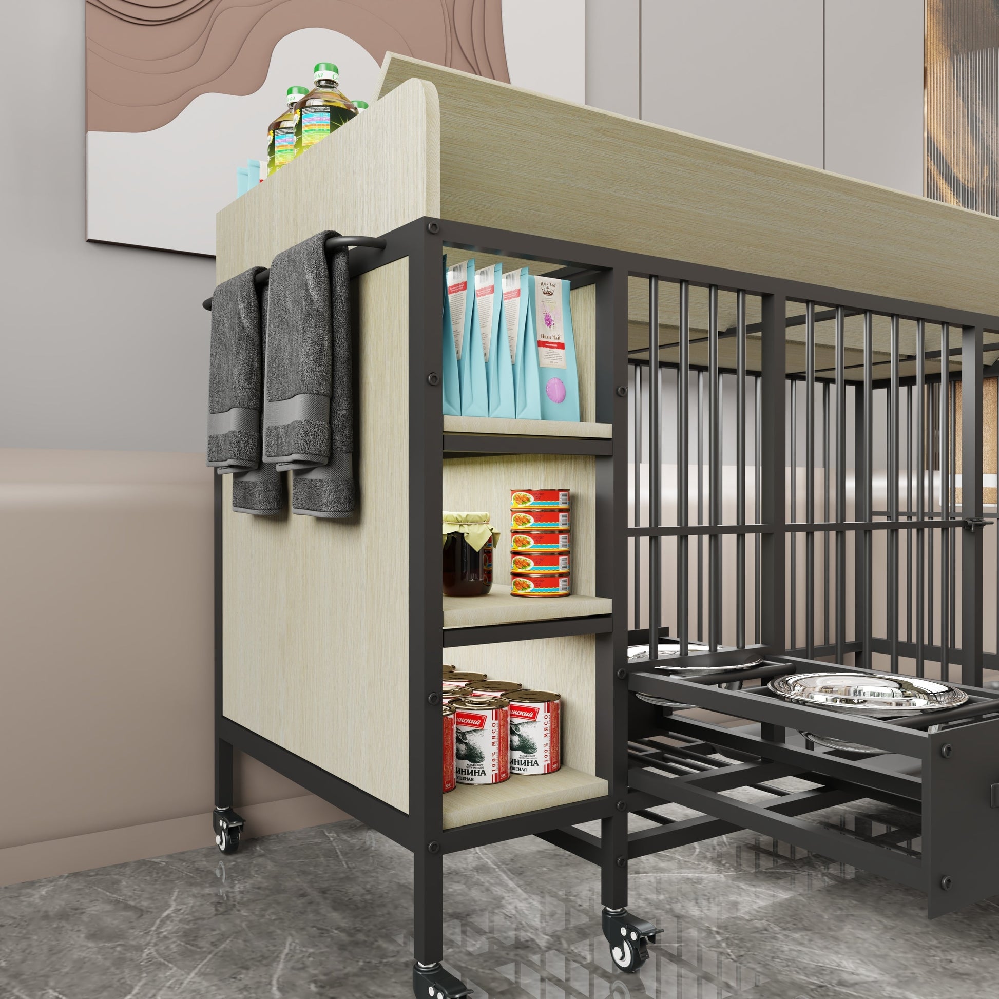 - Includes a storage cabinet and a large compartment on top for pet supplies and food