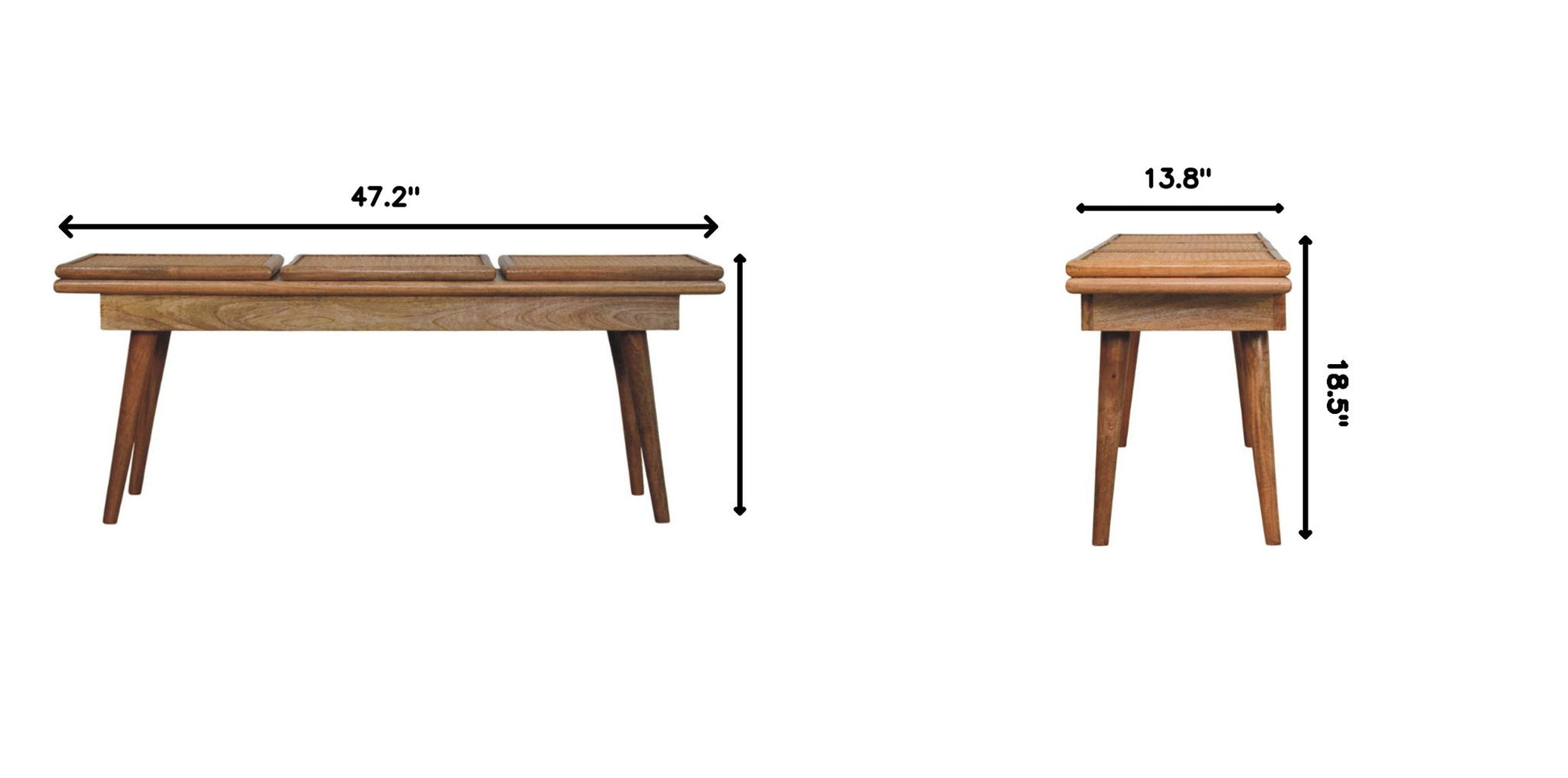 - Bench Larissa Triple Accent Oak-ish Cane Bench Artisan Furniture - Introducing the Larissa Triple Accent Bench, a blend of timeless elegance and functional design. Crafted from 100% solid mango wood in a warm oak-ish finish, this three-seater bench features a distinctive tri-panel top with intricate rattan detailing, adding texture and natural charm. Supported by sturdy Nordic-style legs, it combines durability with minimalist aesthetics. Perfect for entryways, living rooms, or bedrooms, the Larissa Triple Accent Bench offers versatile seating while enhancing your space with a refined, rustic appeal. Whether used as a functional seat or a stylish accent, this bench is a statement of craftsmanship and design excellence.