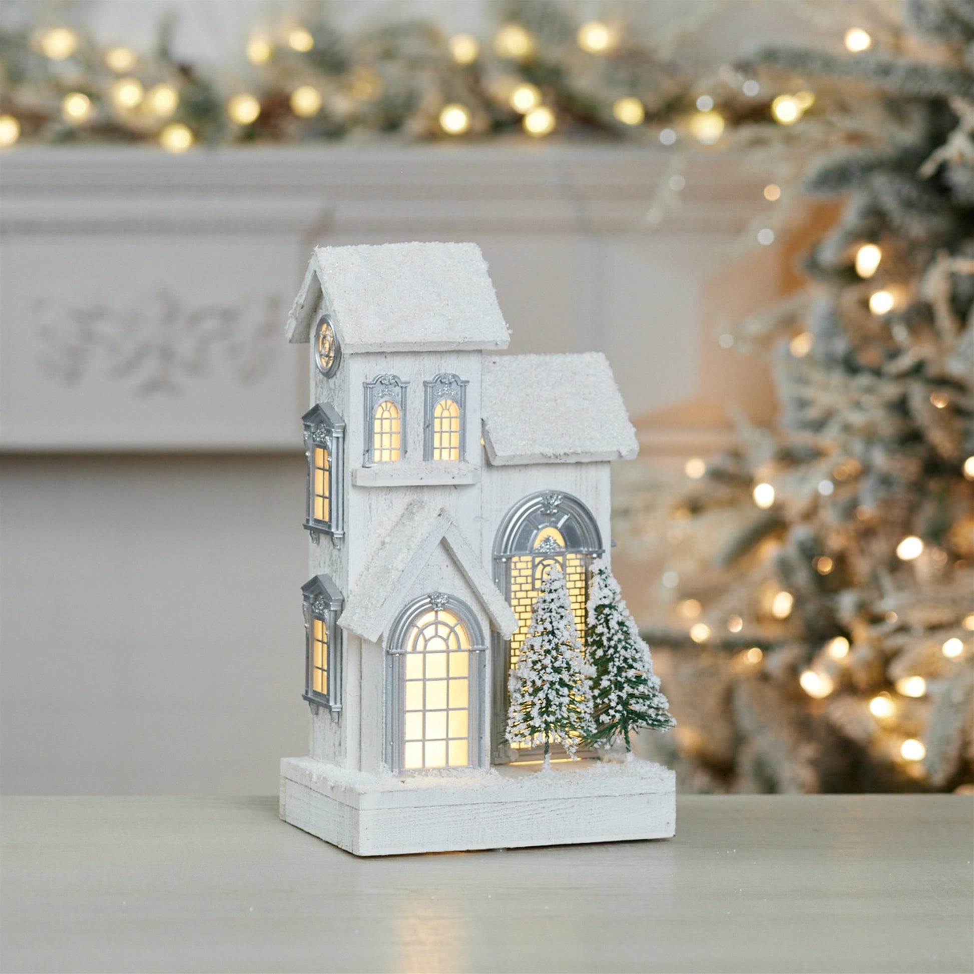 Add a touch of winter charm to your holiday décor with the LED Flocked Wooden House. Designed in wintry white and silver tones, this classic wooden house features arched windows and snowy pine tree accents, bringing a cozy seasonal feel to your space. The built-in LED lights create a soft, inviting glow, making it a beautiful focal point for mantels, tabletops, or festive displays. Battery-operated for convenience, it also includes a USB cord option, allowing for flexible placement in any holiday setting.