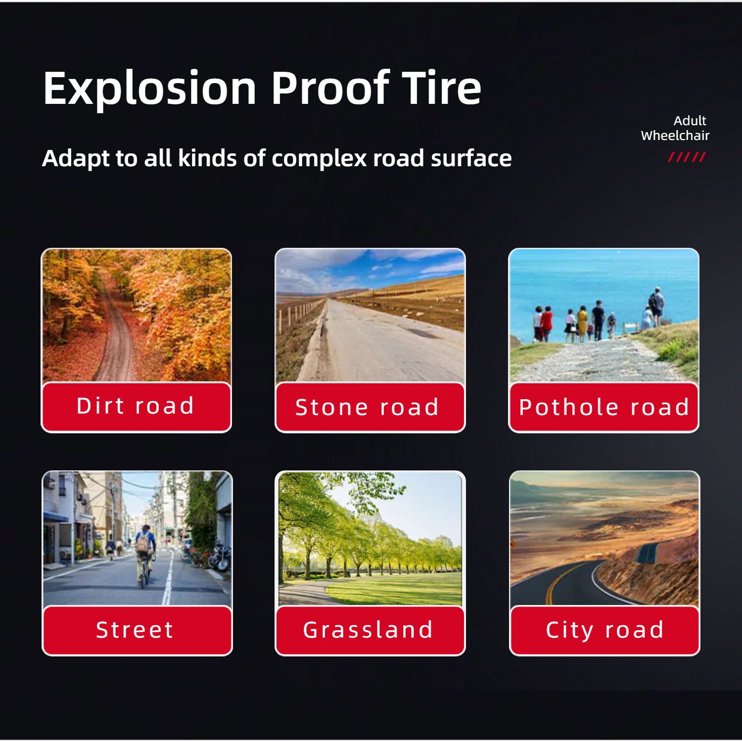 - All-terrain Use : This foldable wheelchair boasts 24" non-inflatable PU tires and dual brakes for smooth,stable mobility.The anti-backflip device and adjustable seat belts prioritize safety for adults with limited mobility.