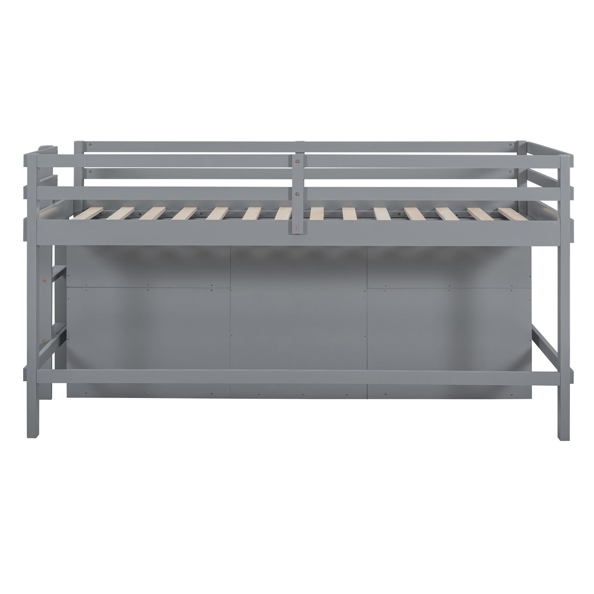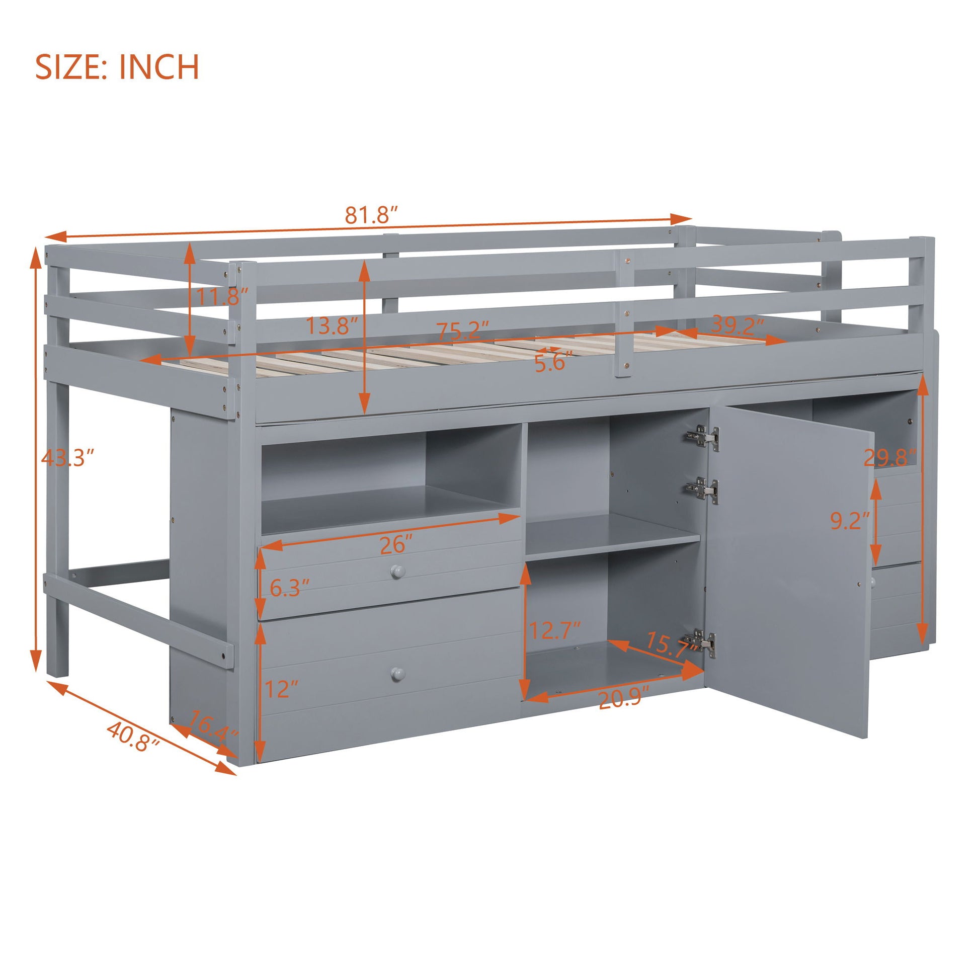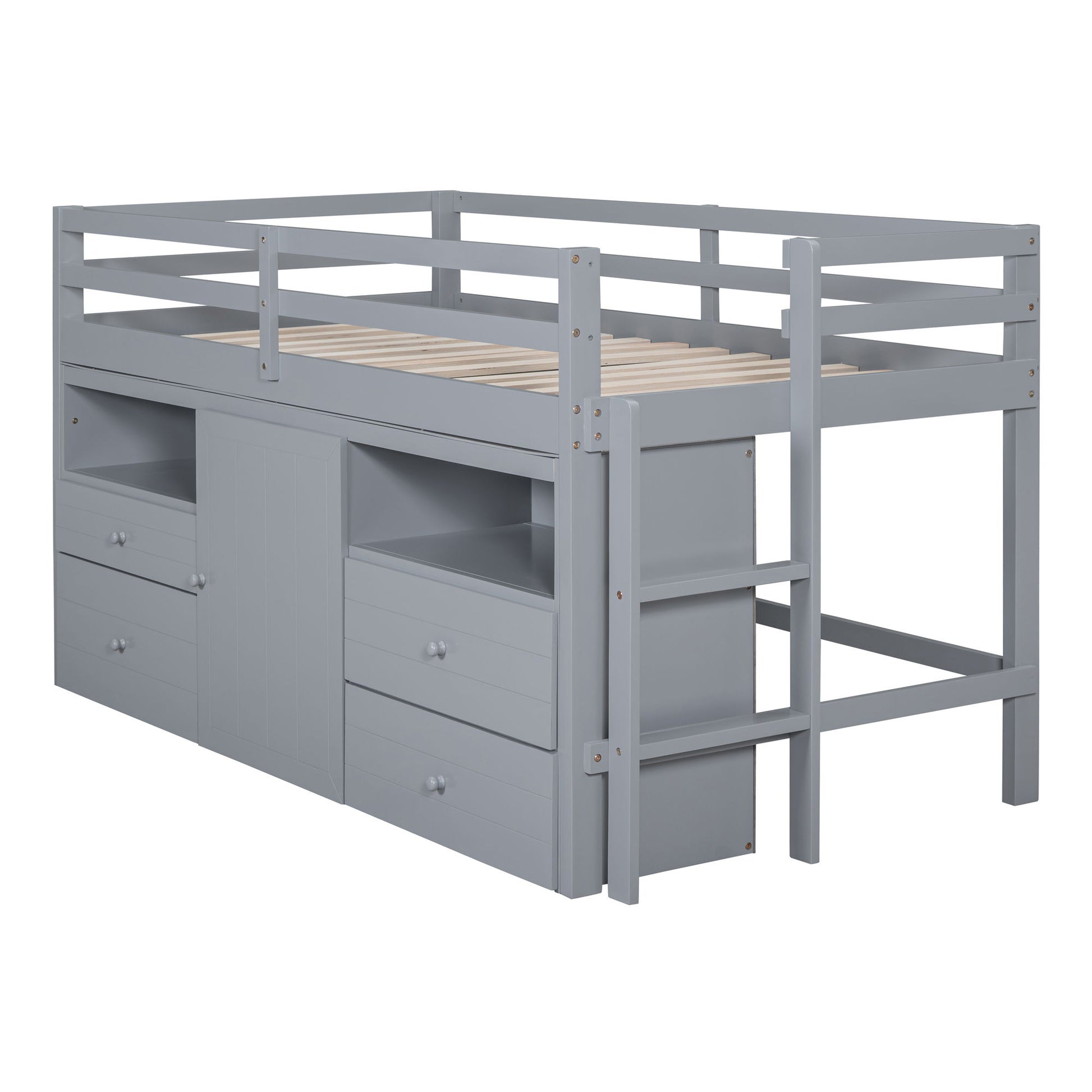 Twin Size Loft Bed With 4 Drawers, Underneath Cabinet And Shelves - Gray
