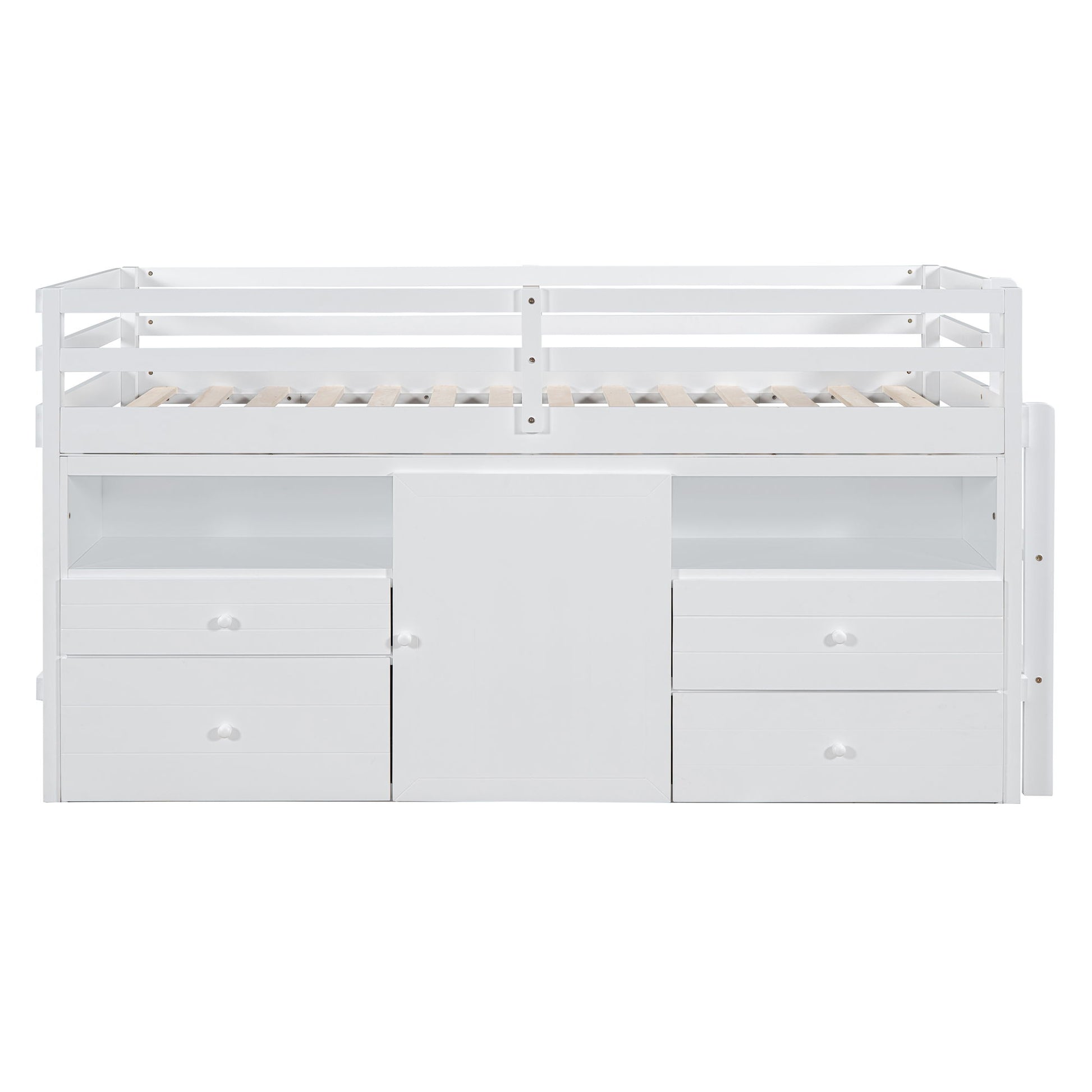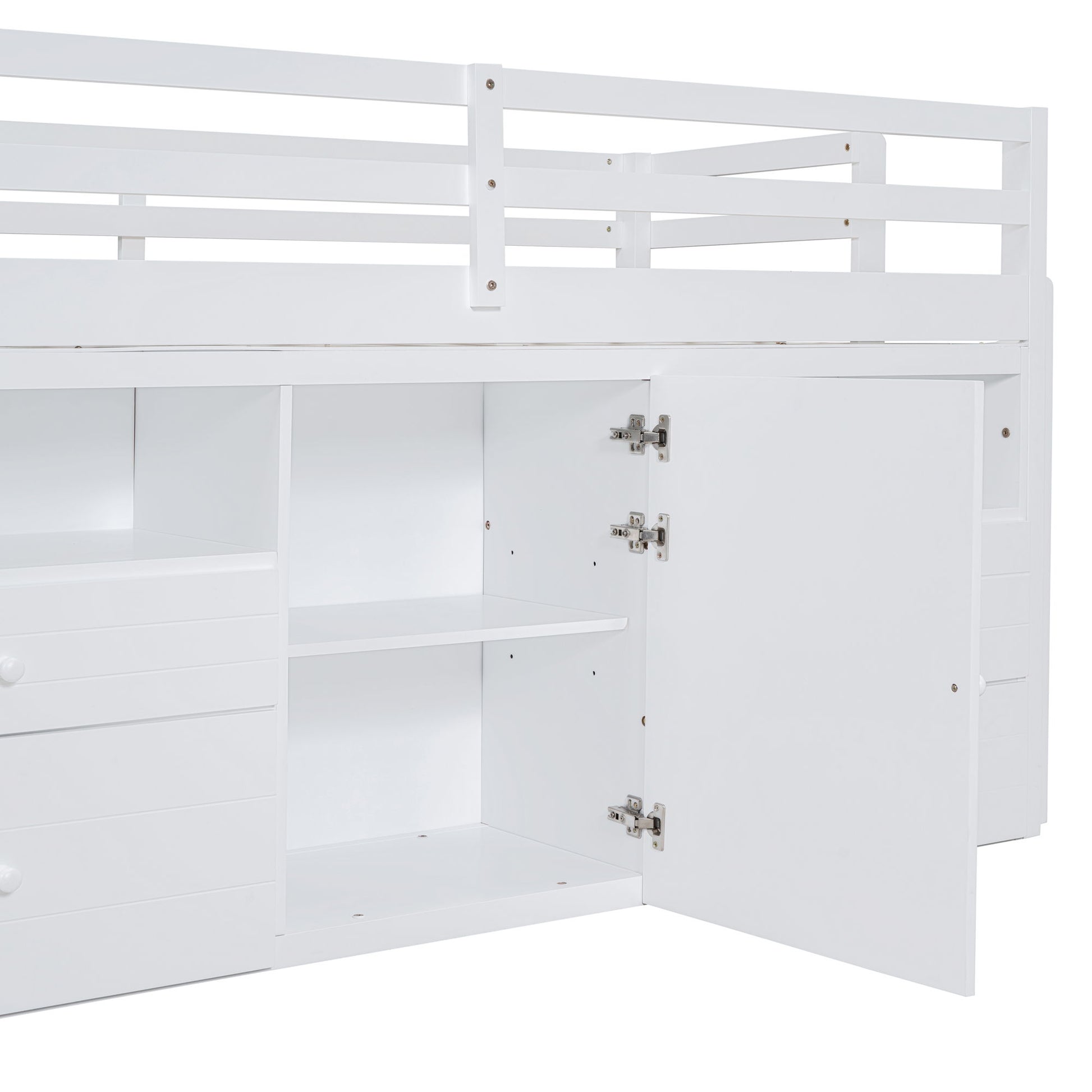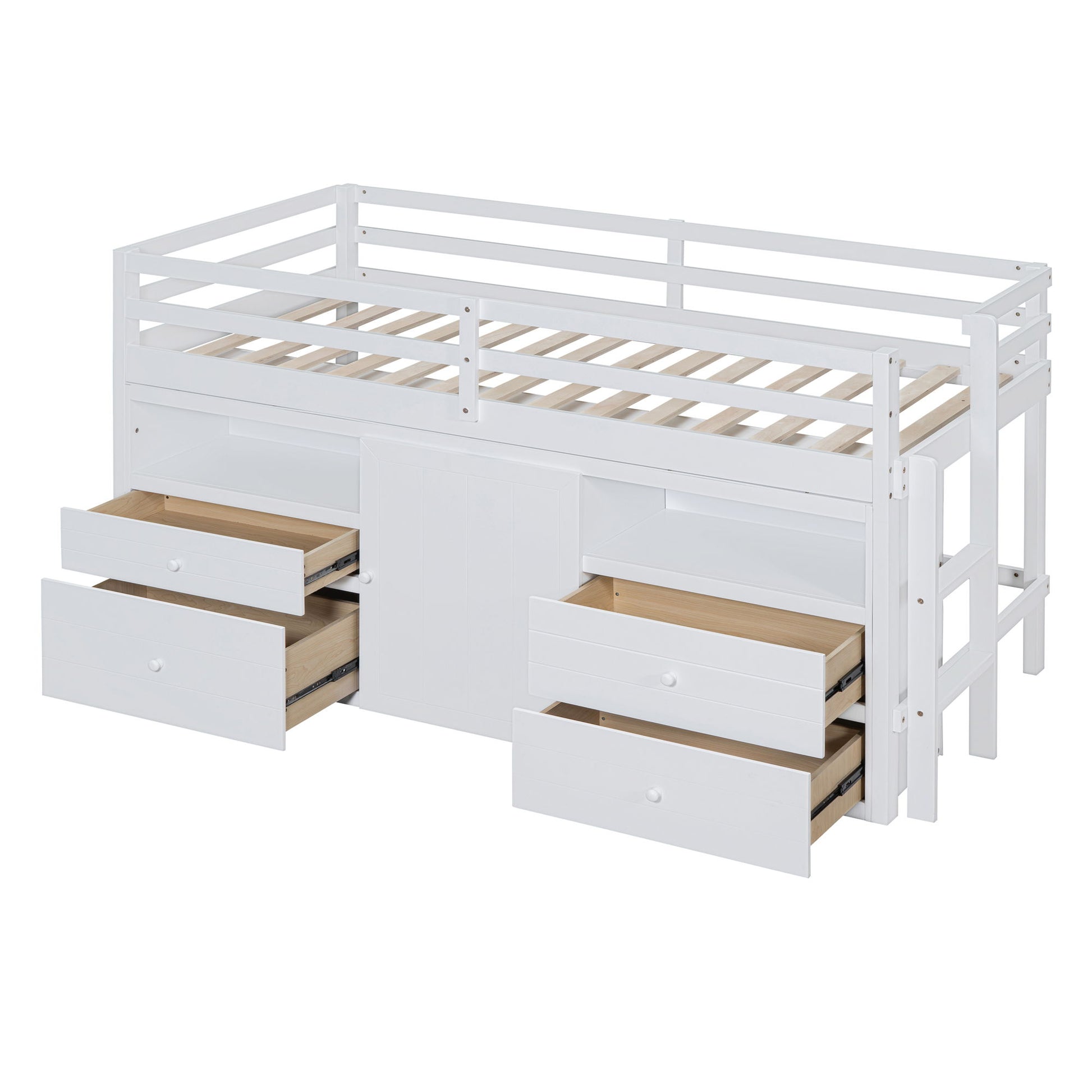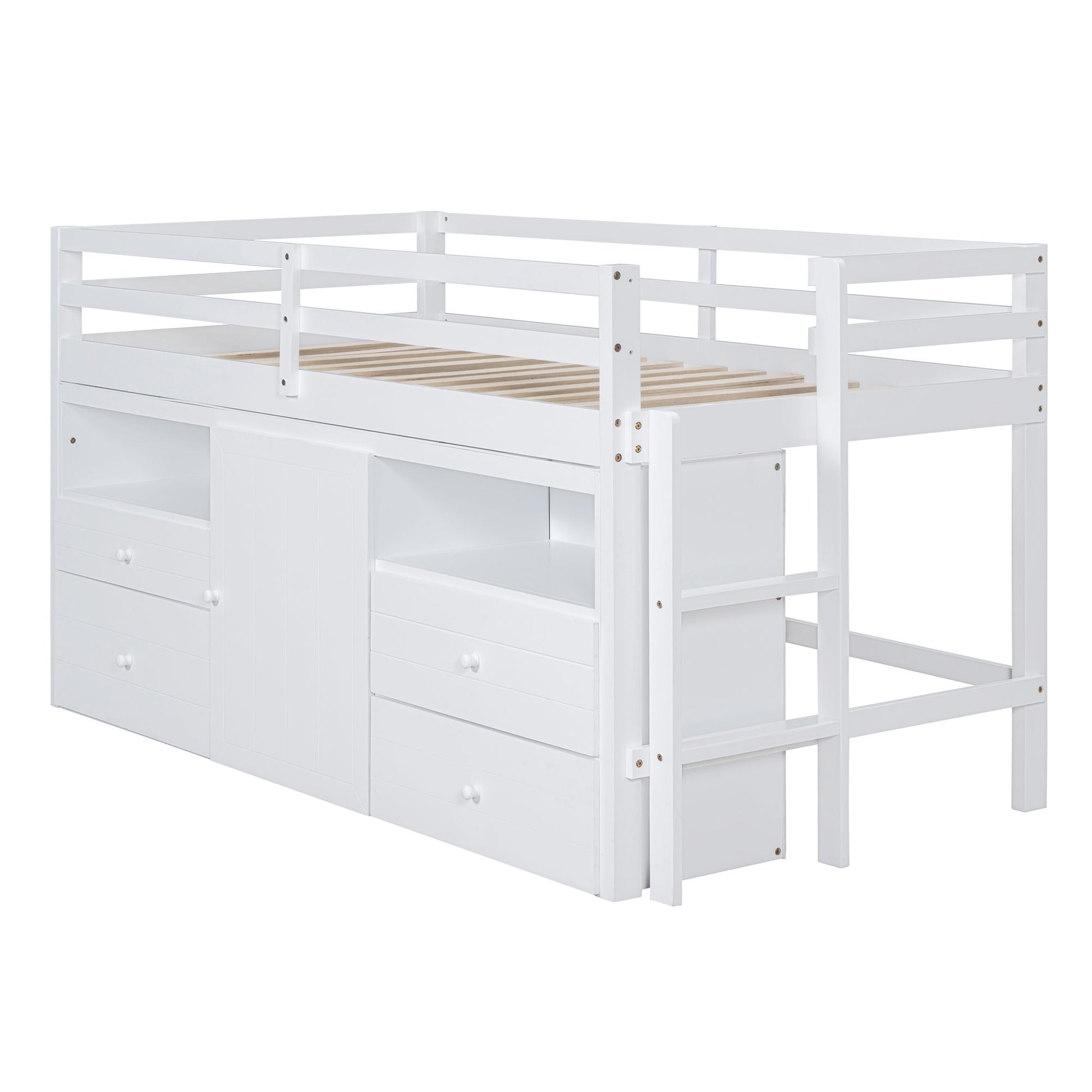 Twin Size Loft Bed With 4 Drawers, Underneath Cabinet And Shelves - White