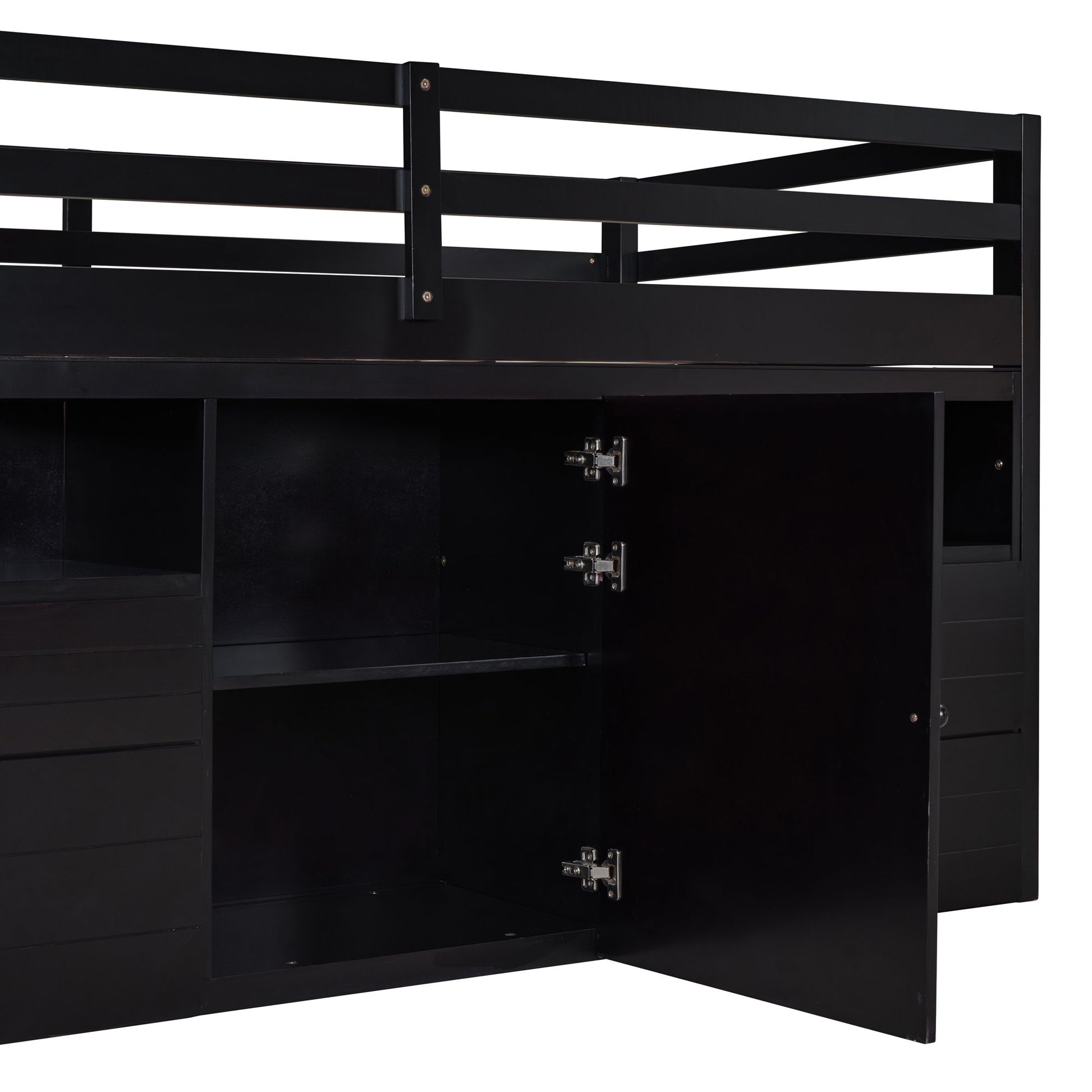 Twin Size Loft Bed With 4 Drawers, Underneath Cabinet And Shelves - Espresso