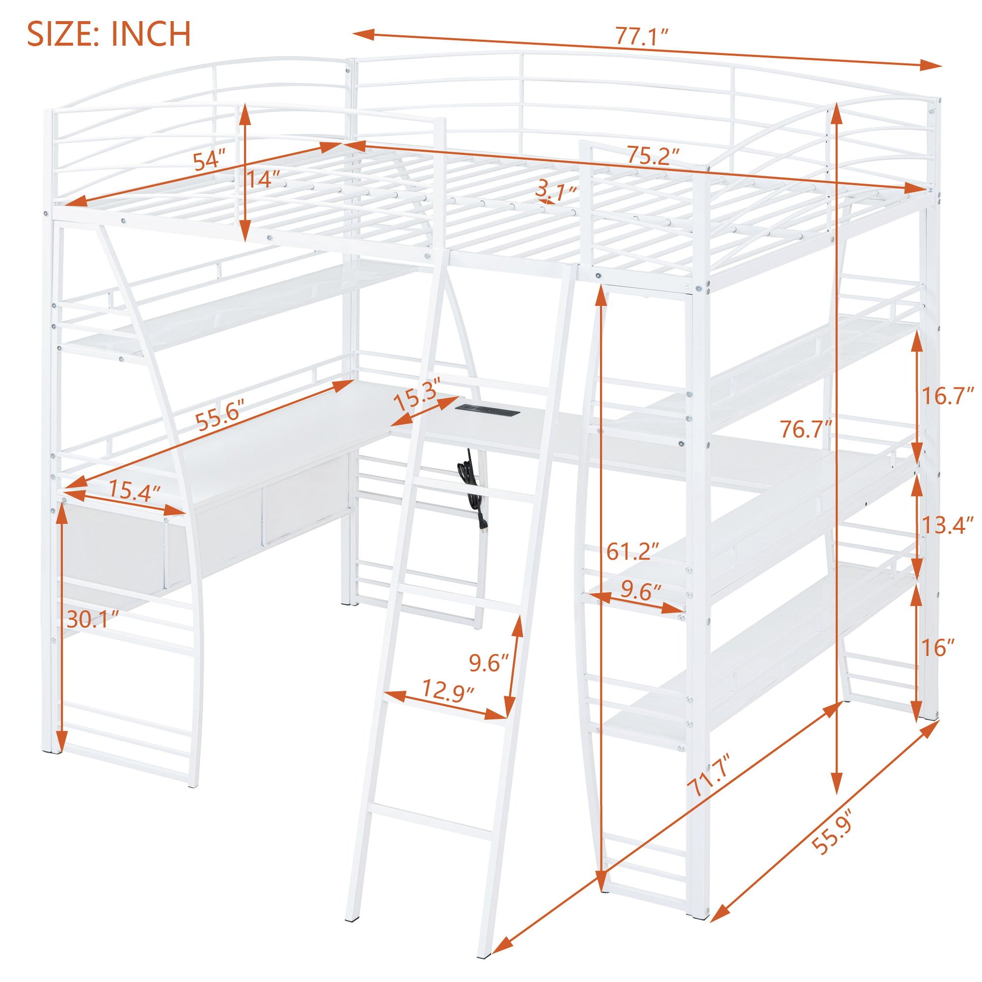 Loft Bed With 4 Layers Of Shelves And L-Shaped Desk, Stylish Metal Frame Bed With A Set Of Sockets, USB Ports And And Wireless Charging