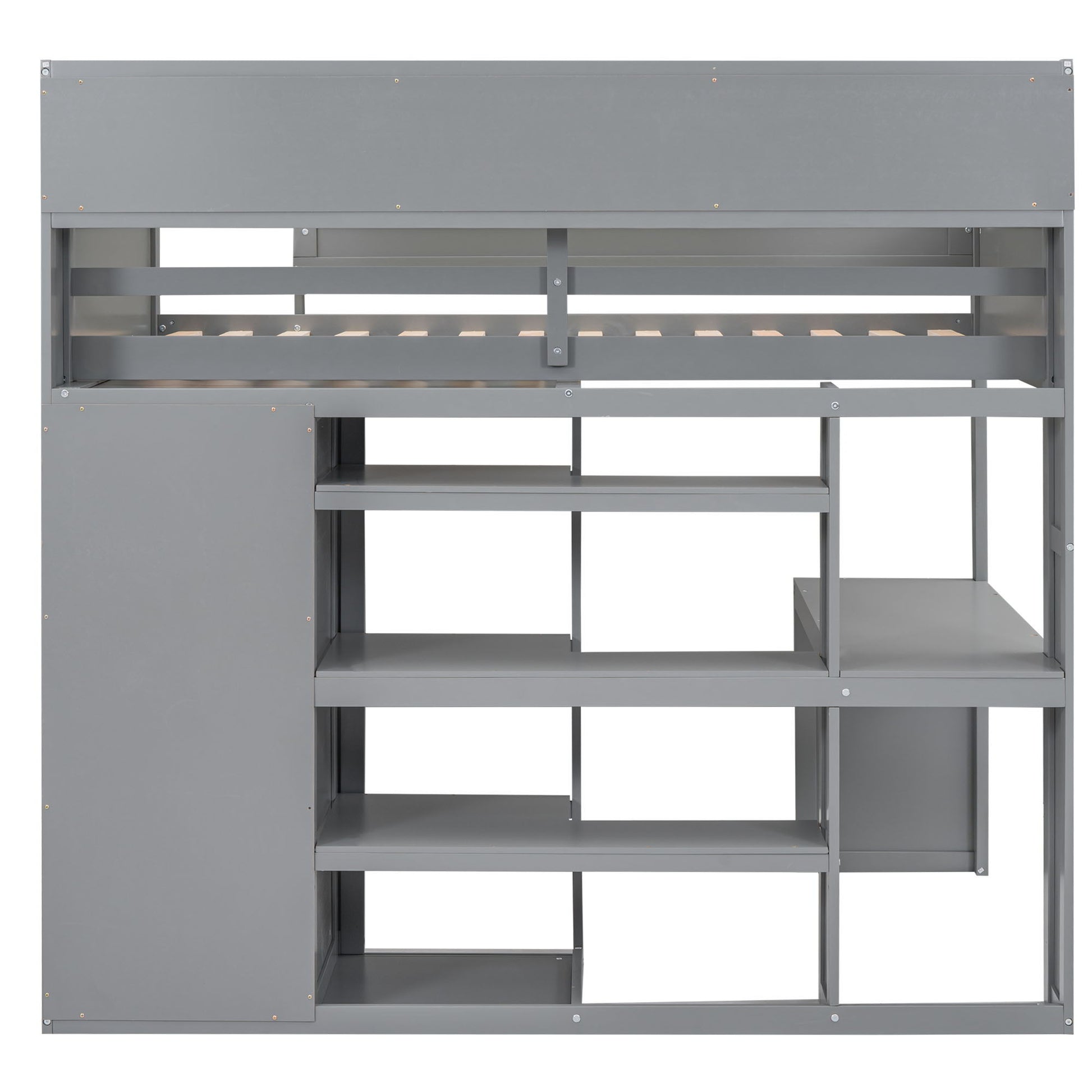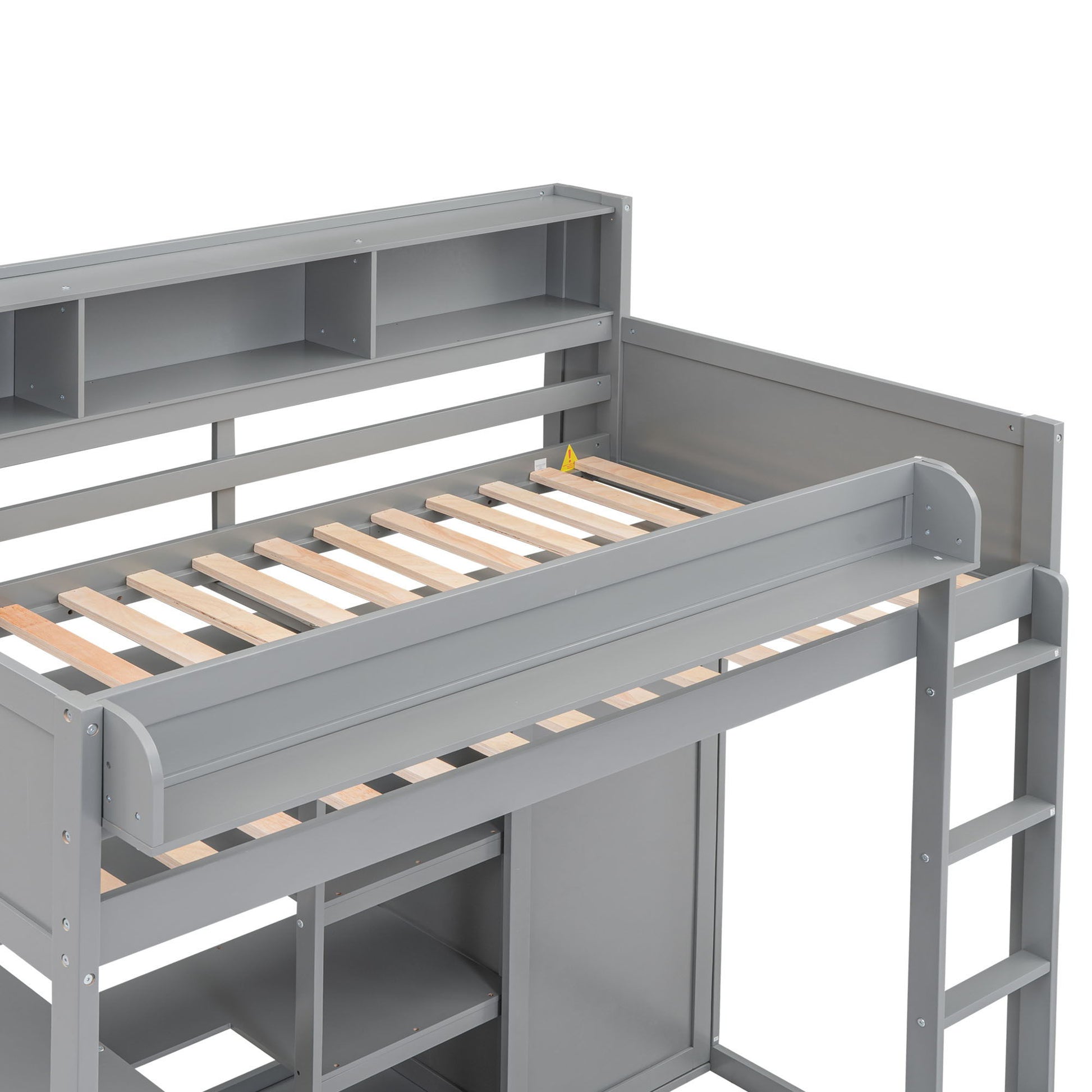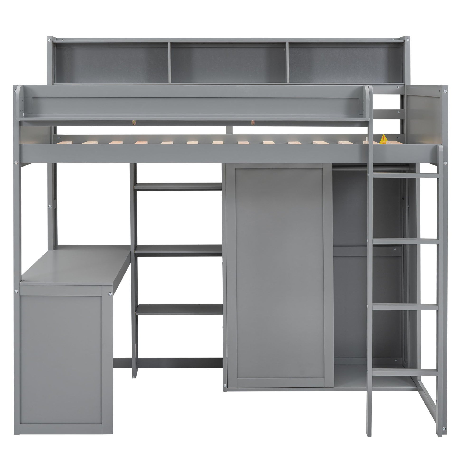 Twin Size Loft Bed With Built In Desk, Storage Shelves, And Wardrobe - Gray