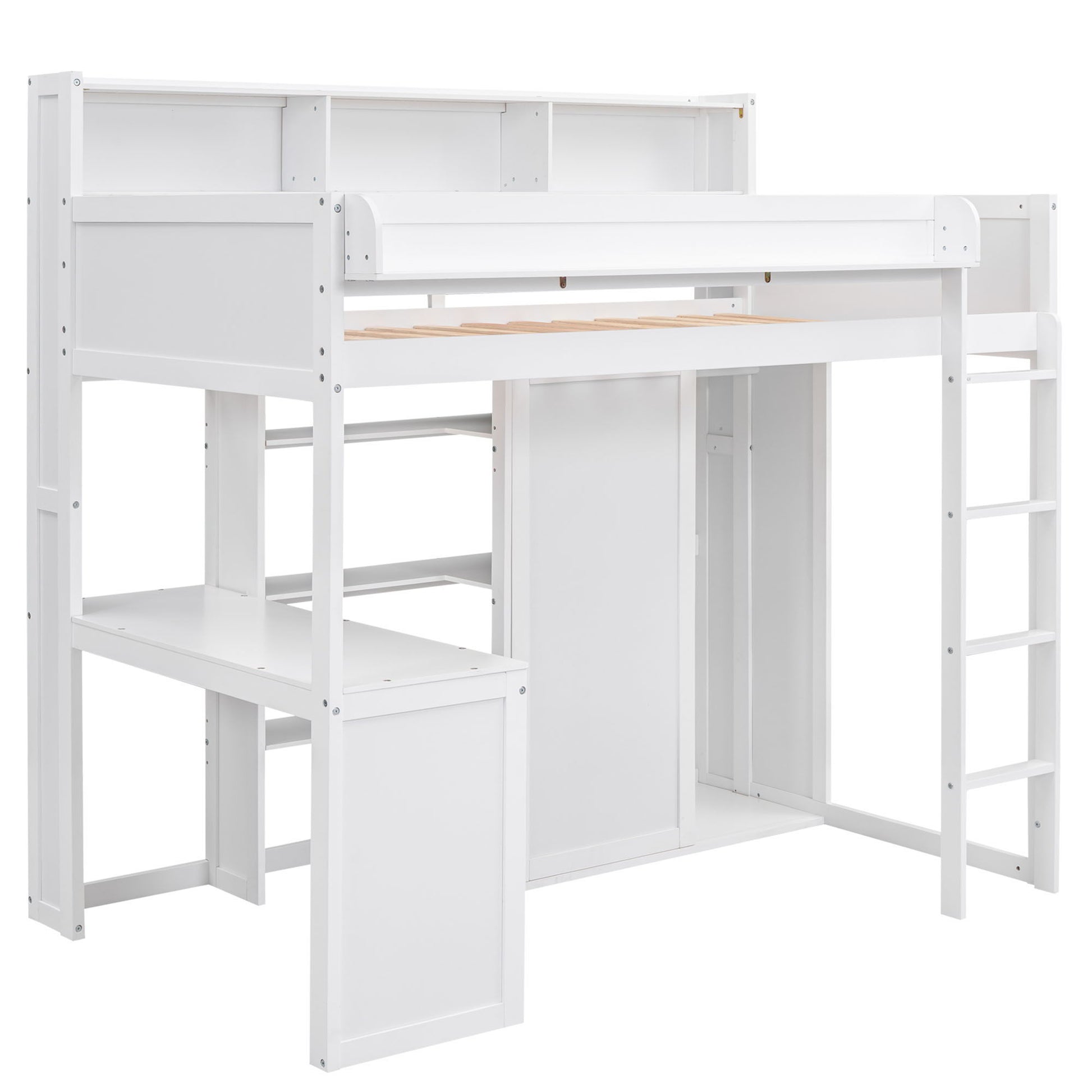 Twin Size Loft Bed With Built In Desk, Storage Shelves, And Wardrobe - White