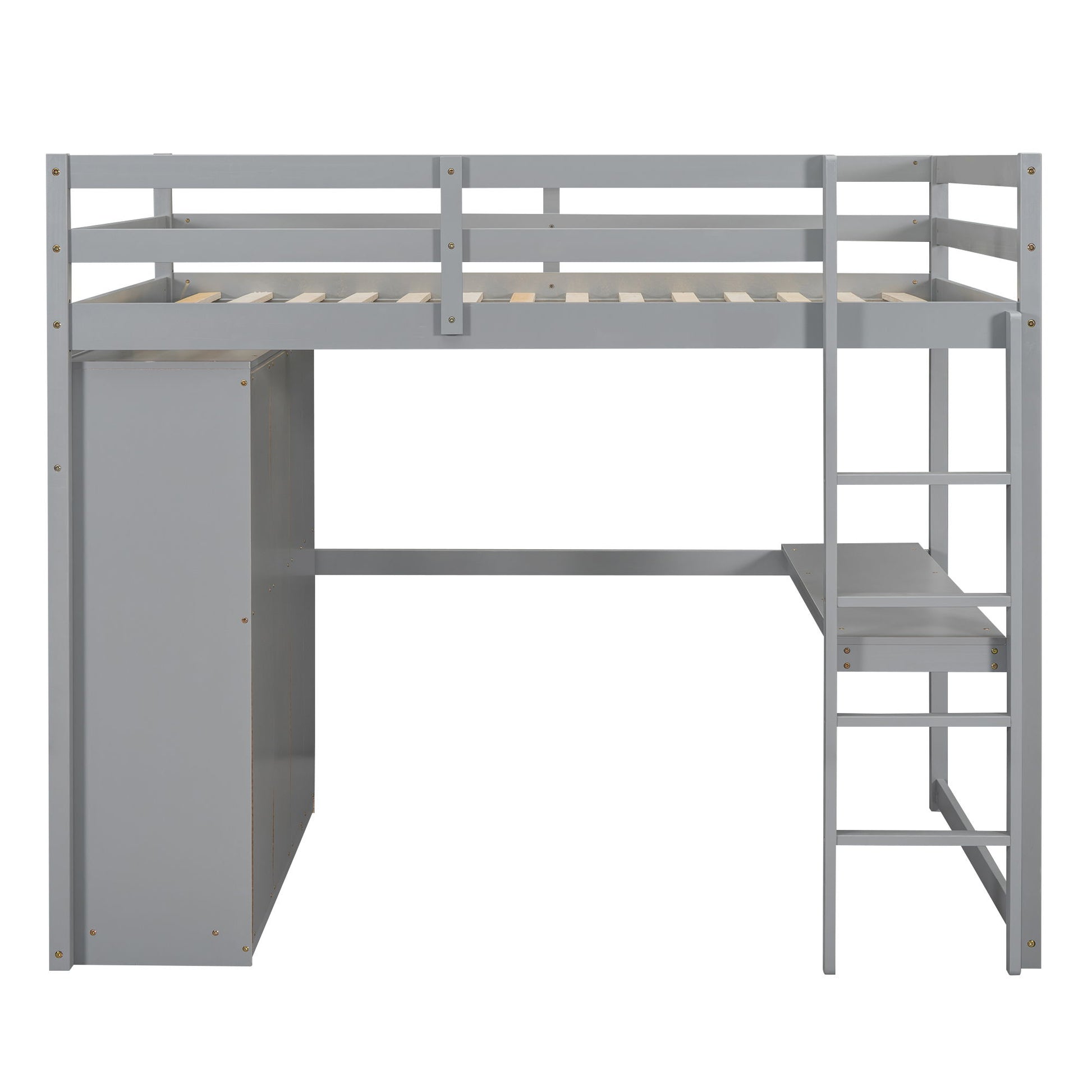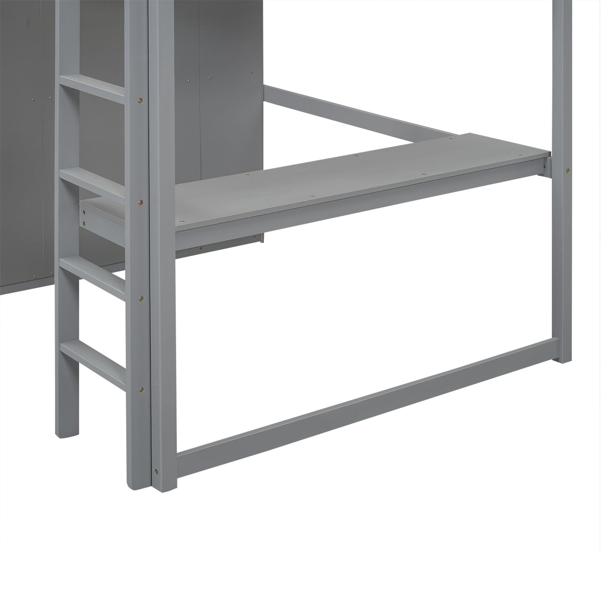 Full Size Loft Bed & Built In Wardrobe, Desk, Shelves, And Drawers - Gray