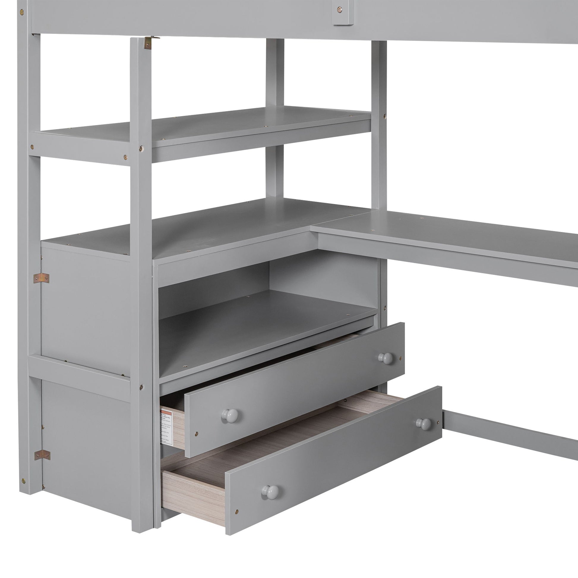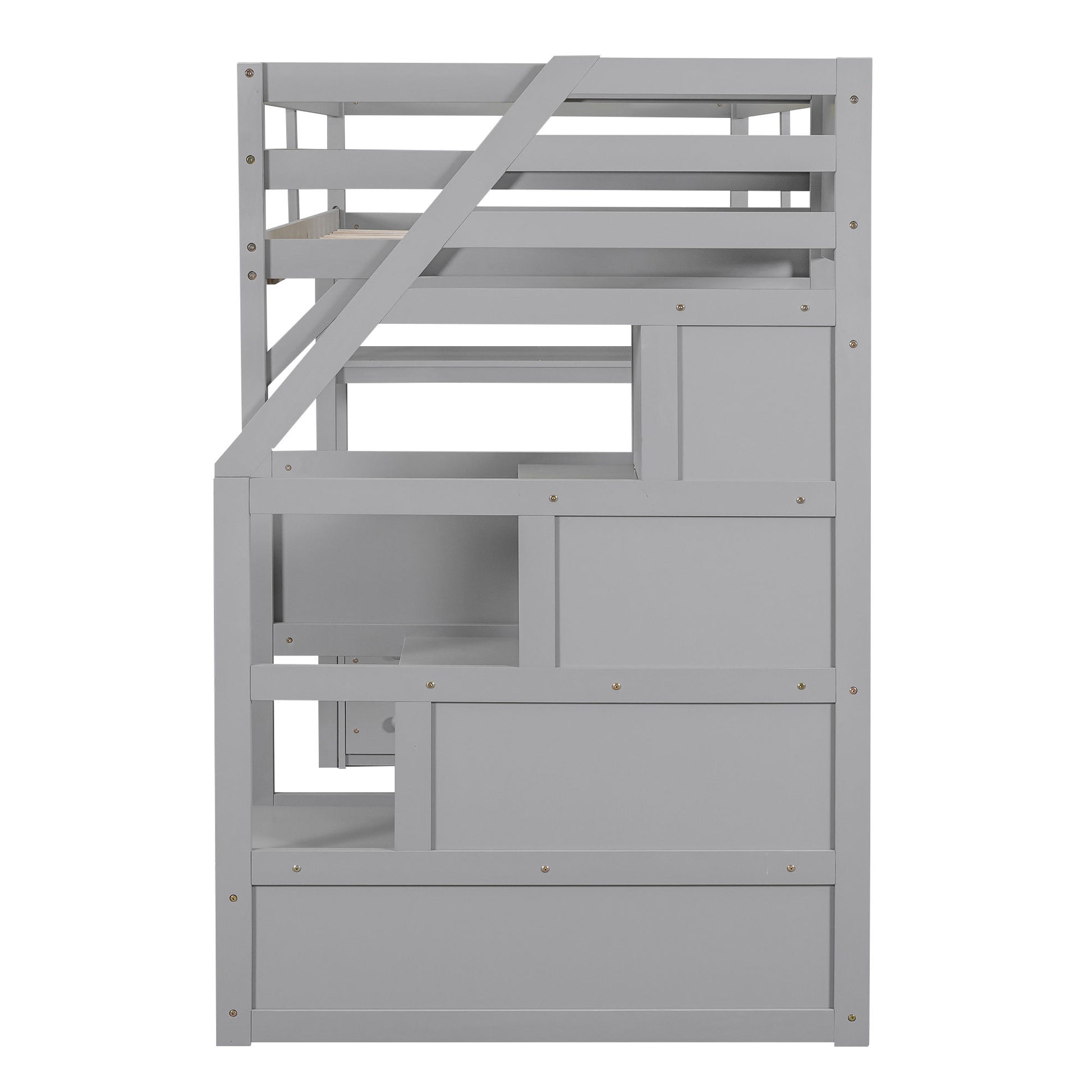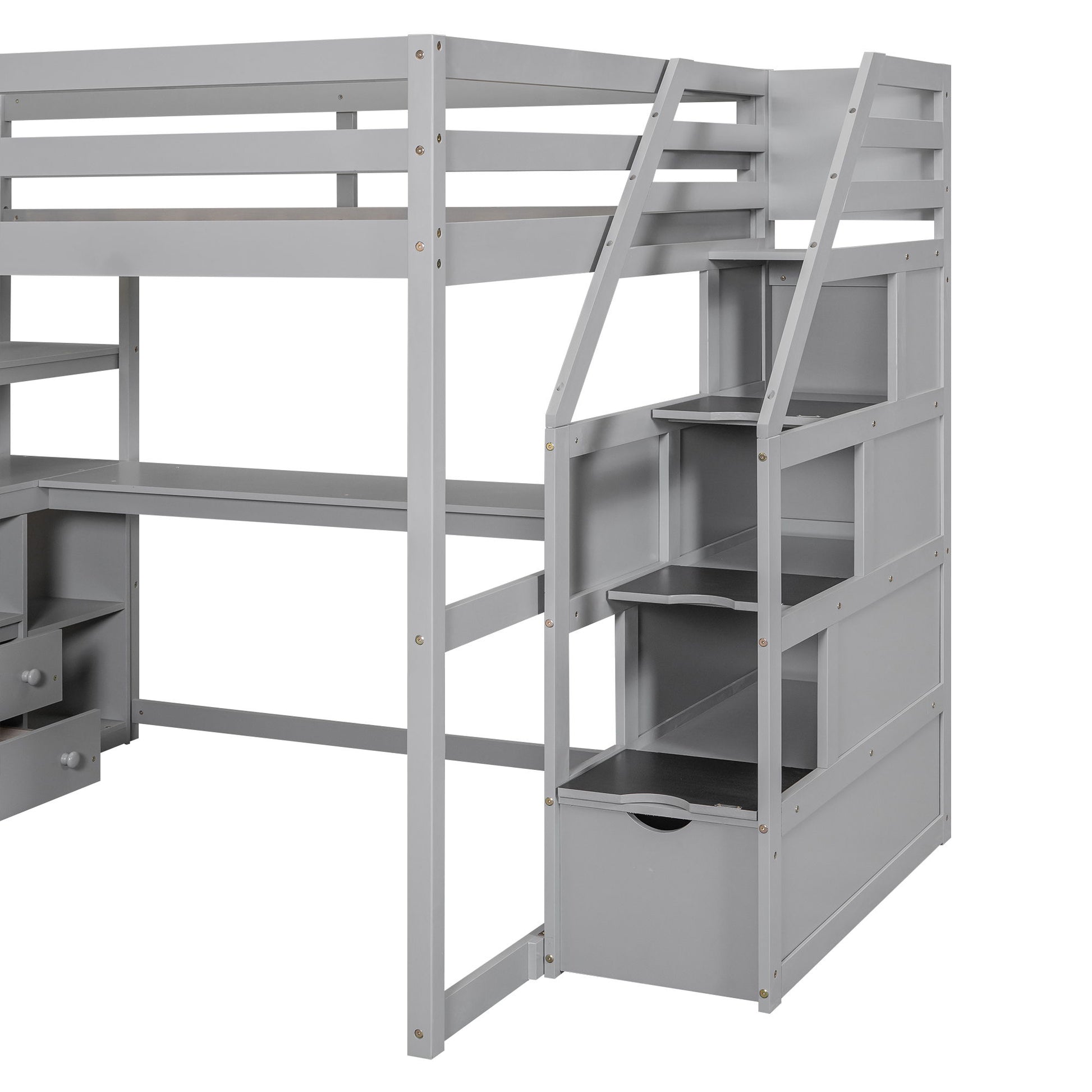 Full Size Loft Bed With Desk, Shelves, 2 Drawers, Storage Staircase - Gray