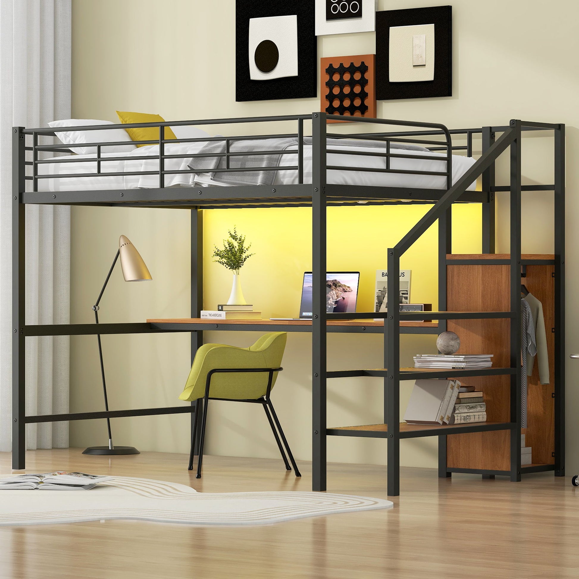 Full Size Loft Bed & Desk, Storage Staircase, Small Wardrobe And LED Light - Black