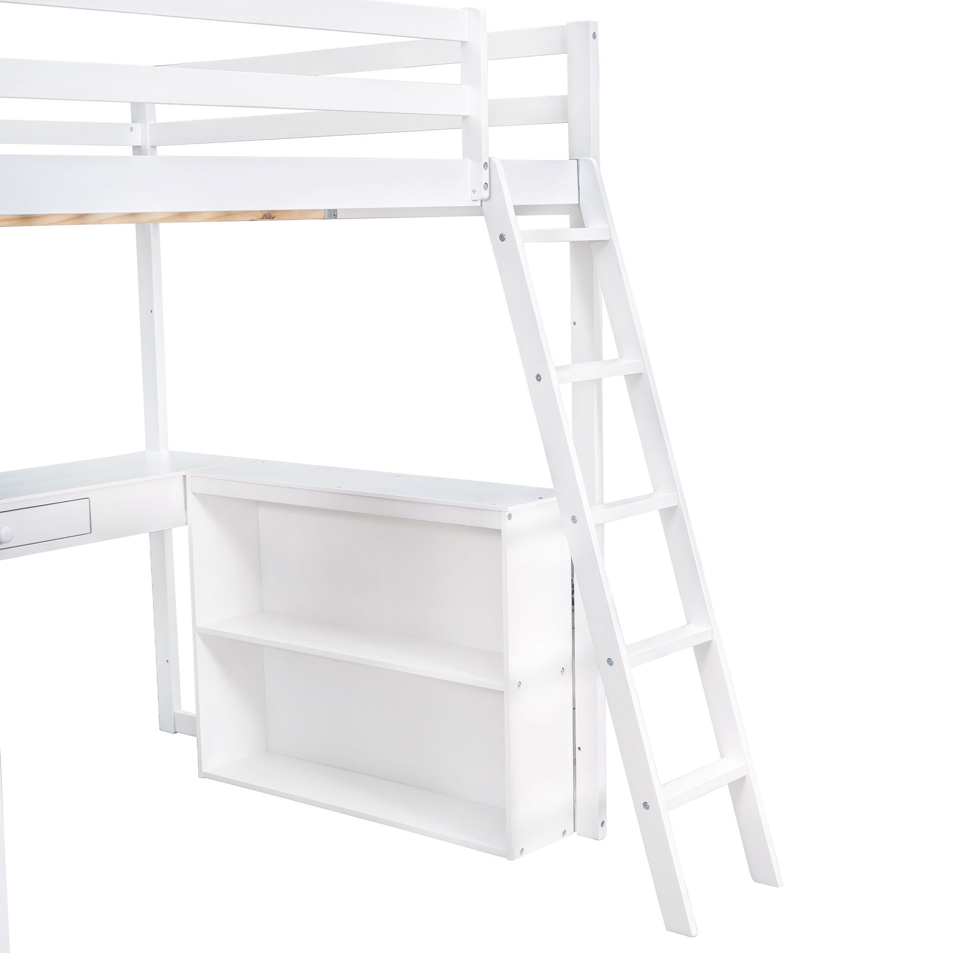Full Size Loft Bed With Ladder, Shelves, And Desk - White