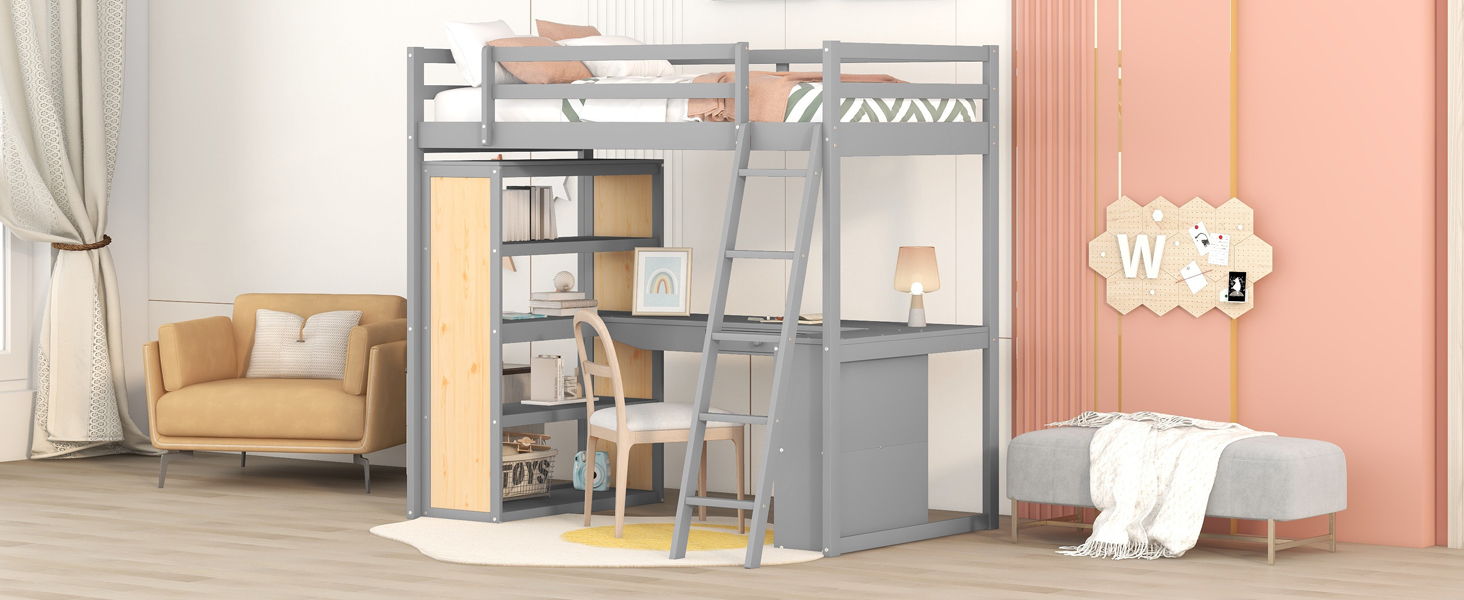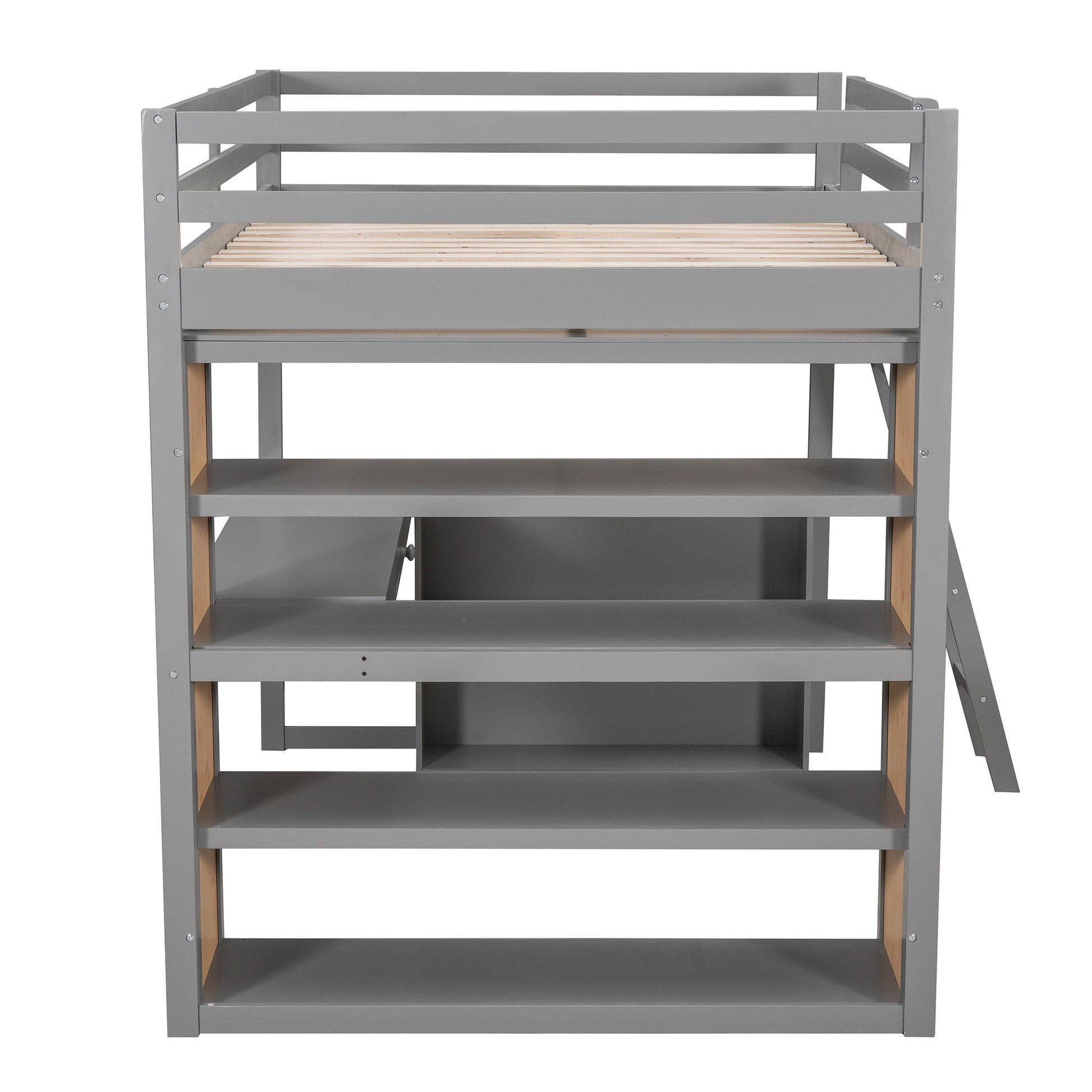 Full Size Loft Bed With Ladder, Shelves, And Desk - Gray