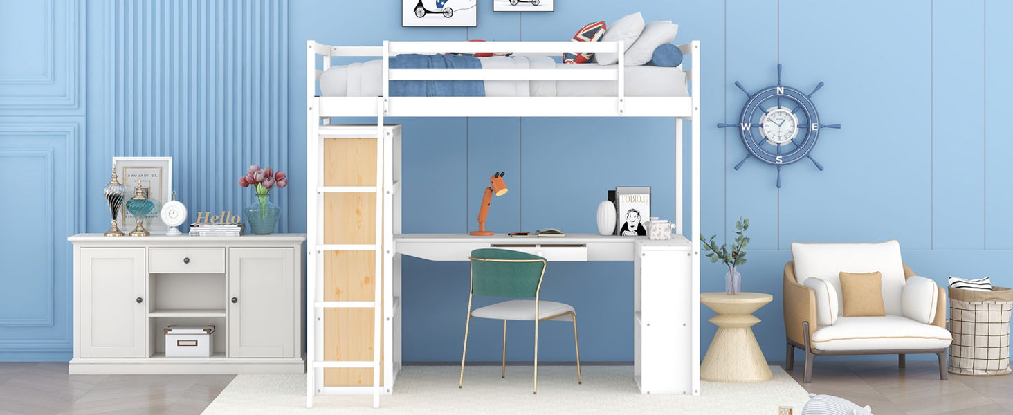 Solid Construction: This multi-functional loft bed is crafted from a solid pine wood frame, with commercial-grade MDF board for quality control and durability. The guardrails are securely attached for added safety.