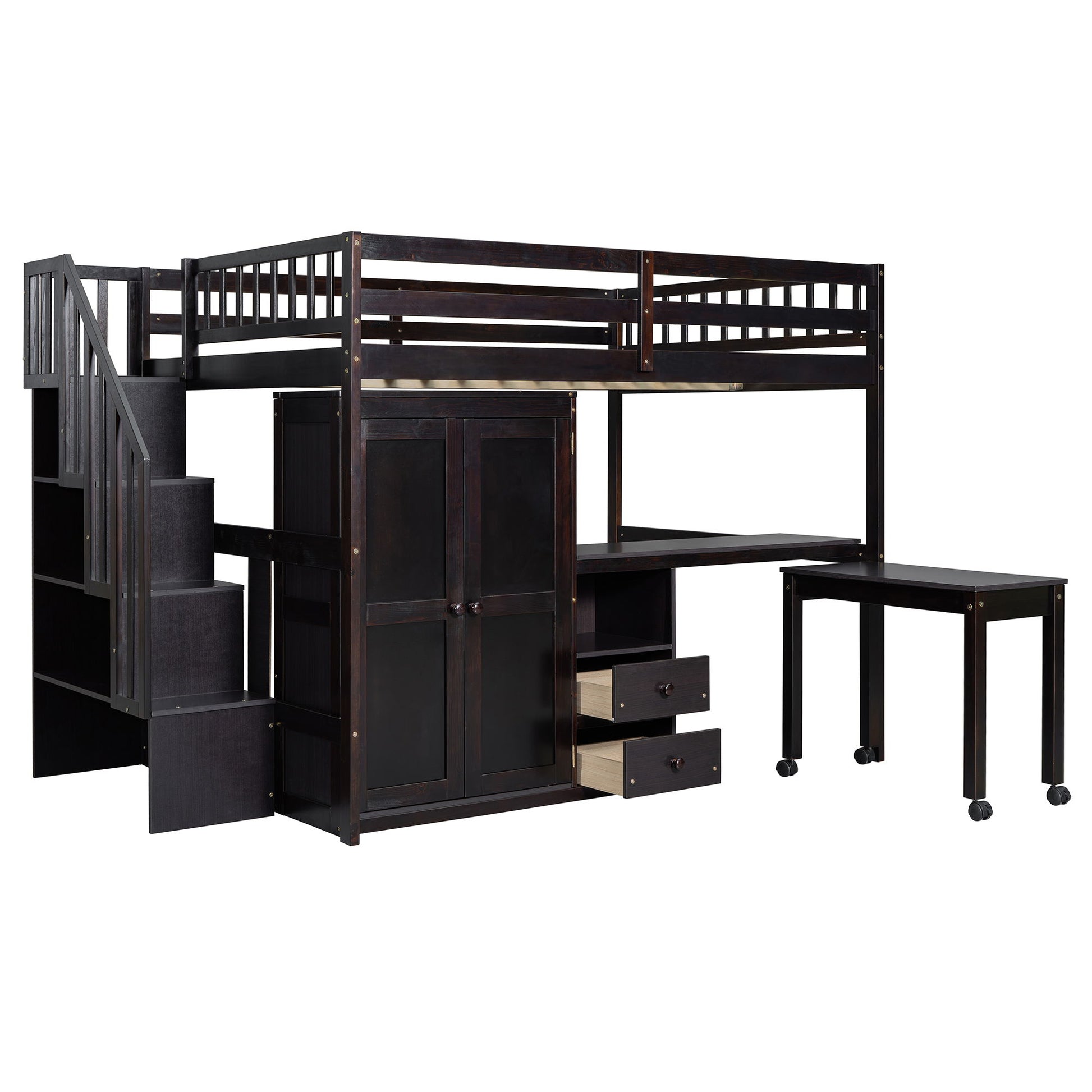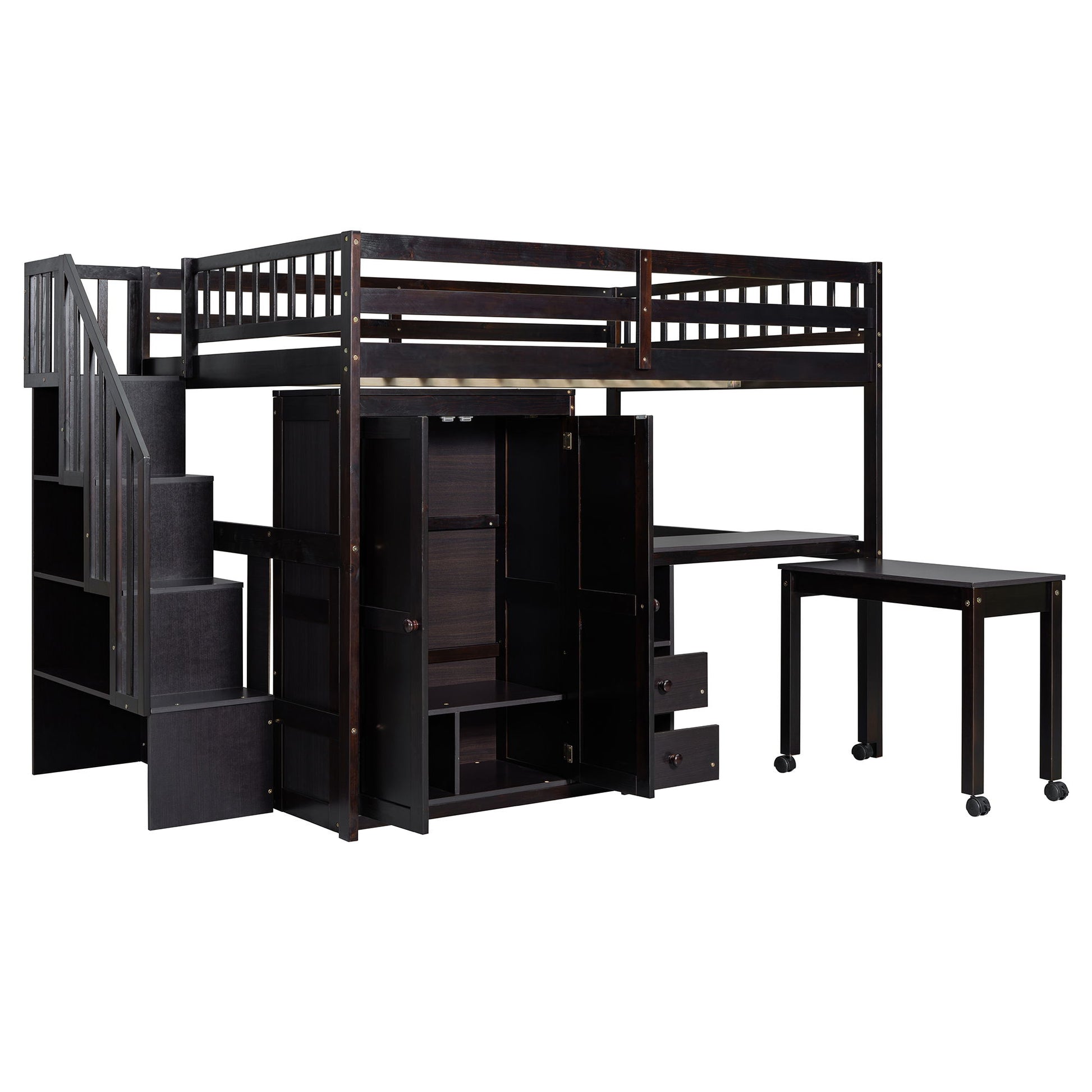 Full Size Loft Bed With Stairs, Bookshelf, Drawers, Desk & Wardrobe, Space Saving Multifunctional Furniture - Espresso