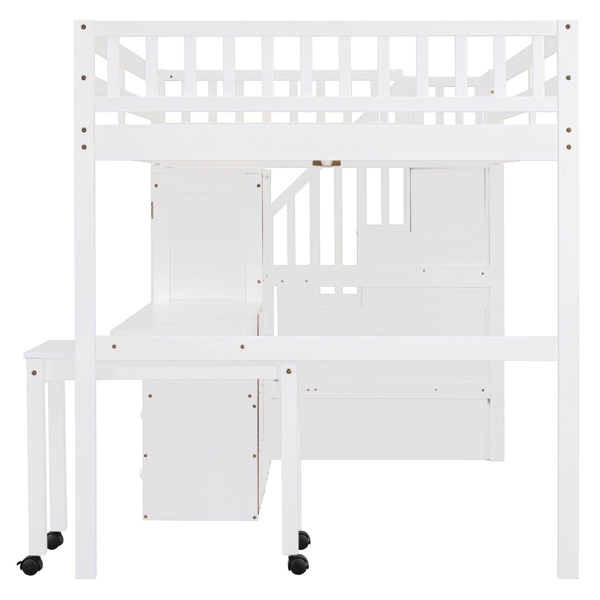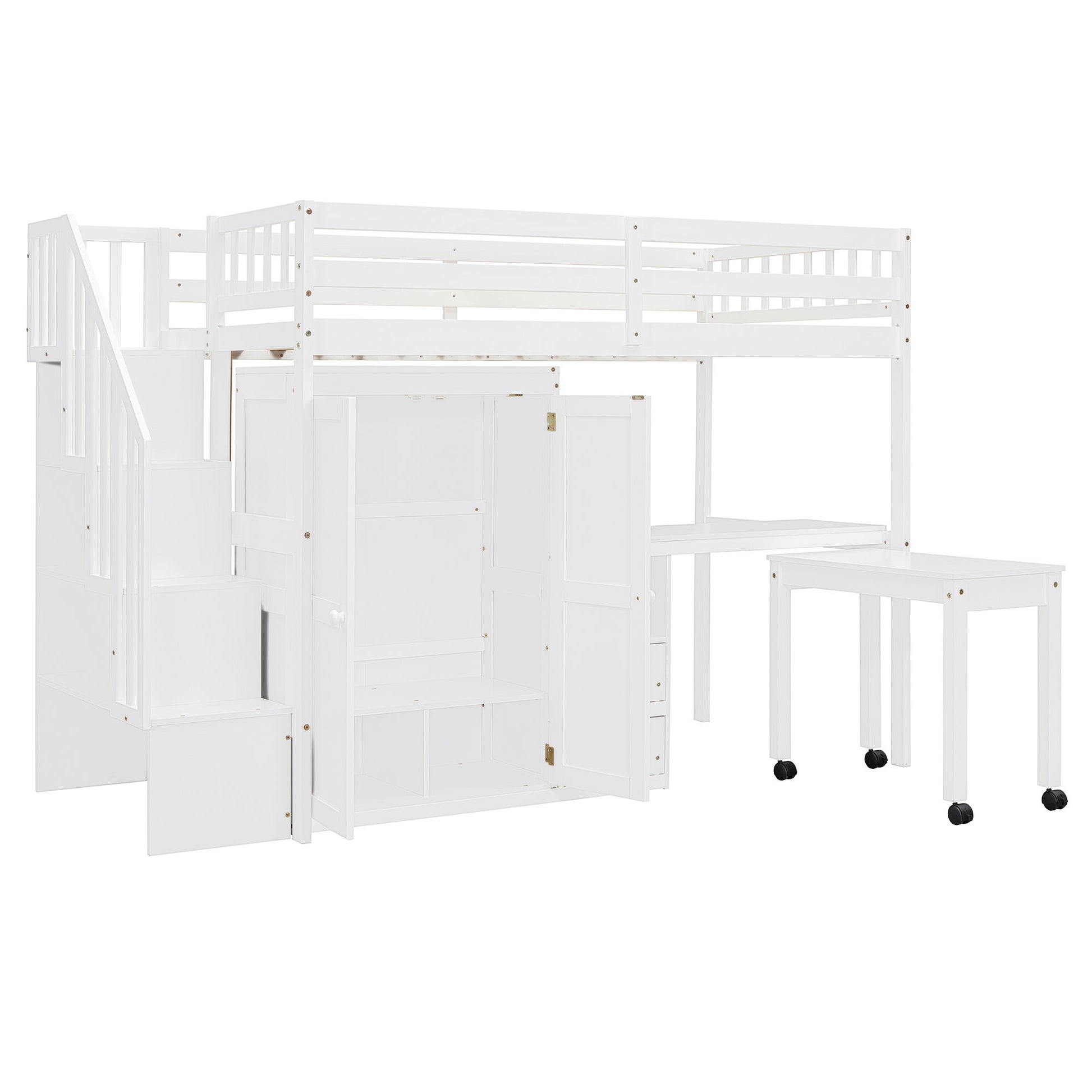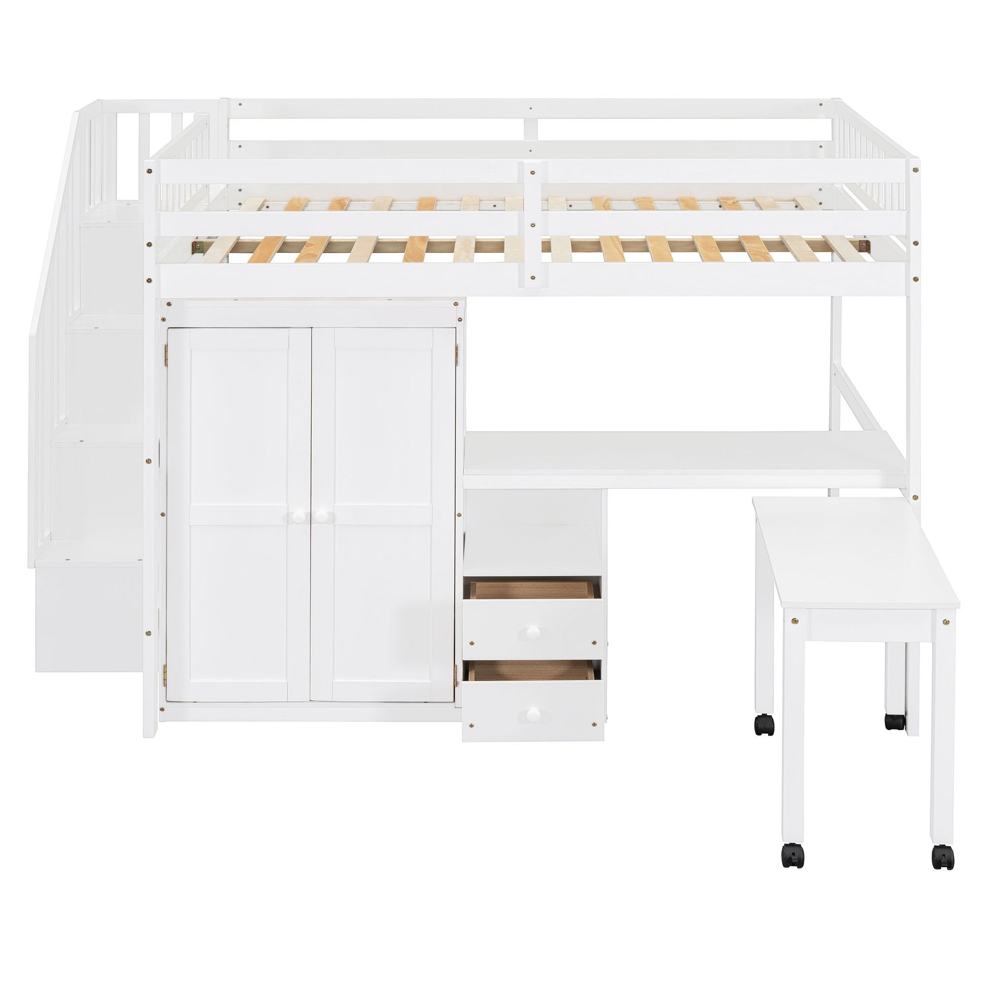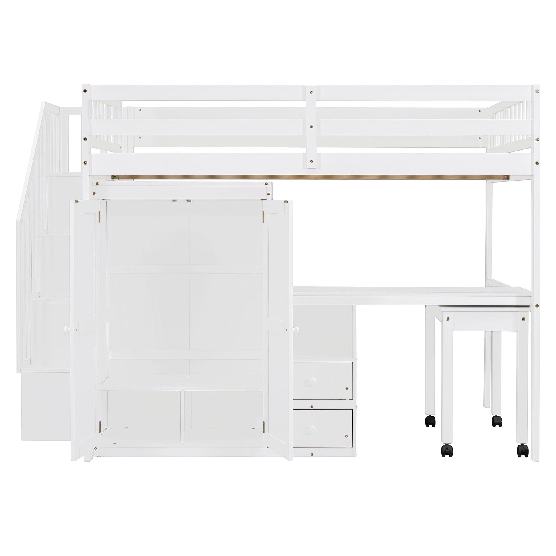 Full Size Loft Bed With Stairs, Bookshelf, Drawers, Desk & Wardrobe, Space Saving Multifunctional Furniture - White
