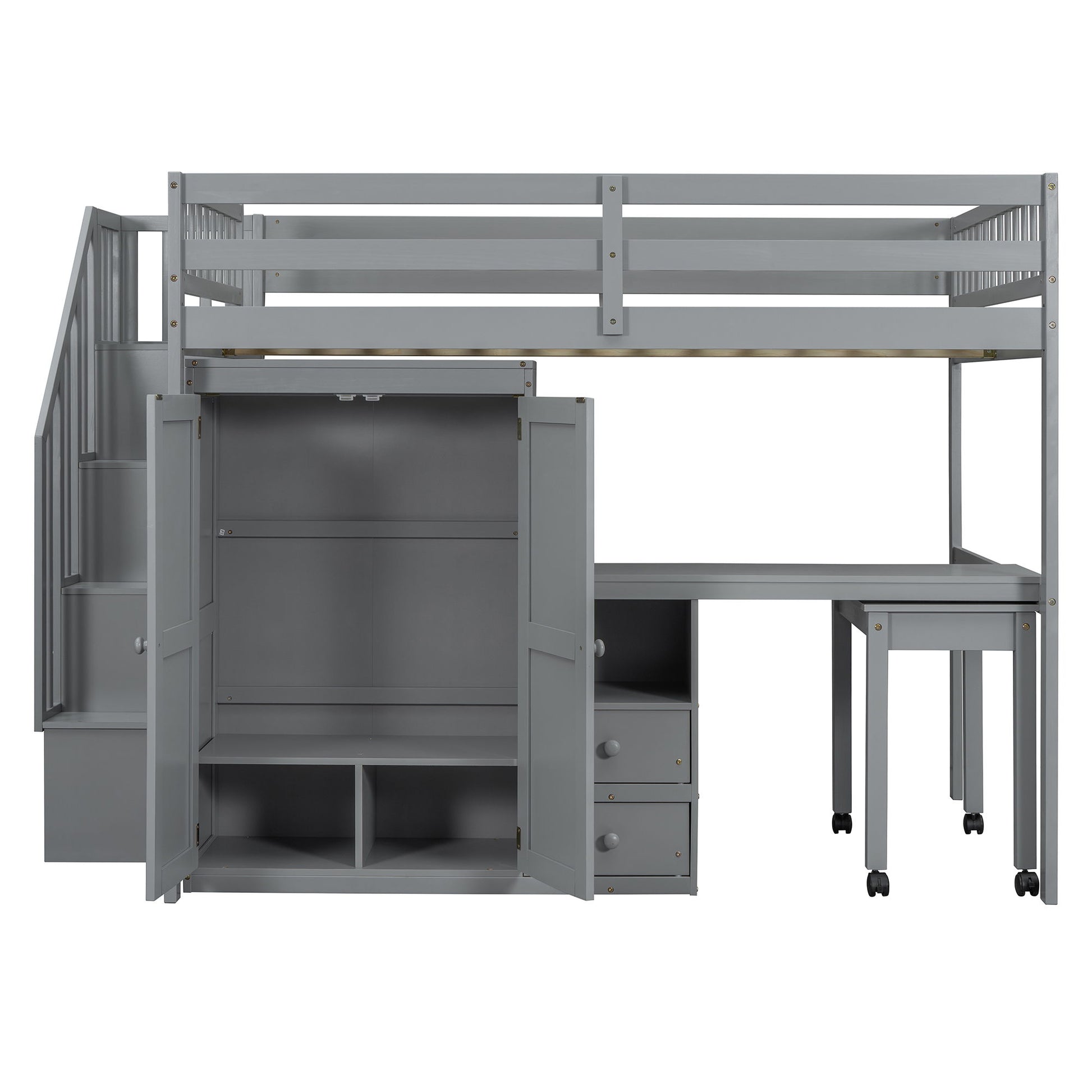 Twin Size Loft Bed With Stairs, Bookshelf, Drawers, Desk & Wardrobe, Space Saving Multifunctional Furniture - Gray