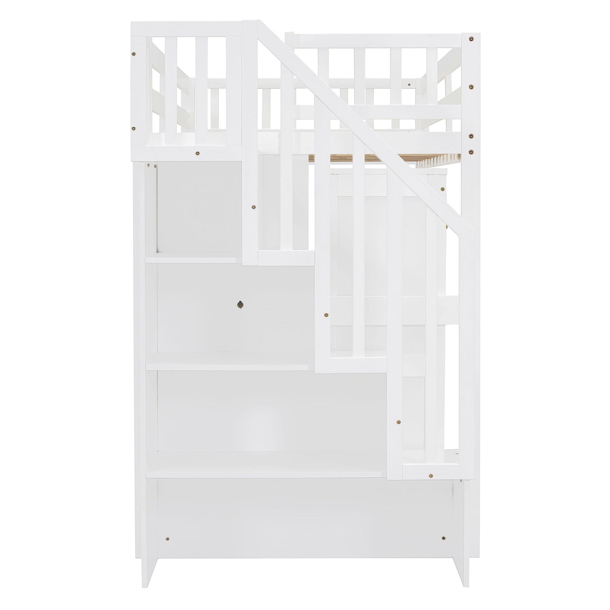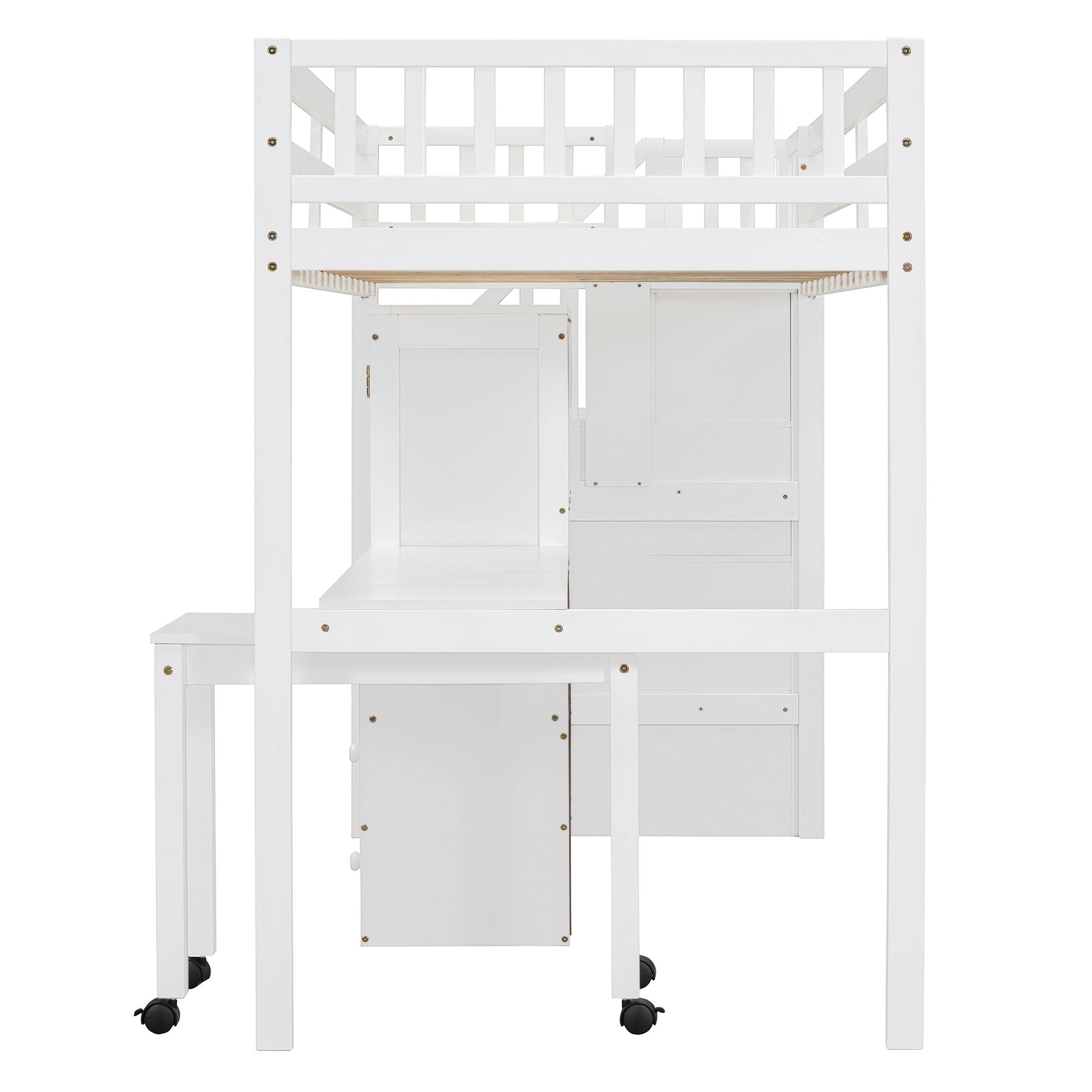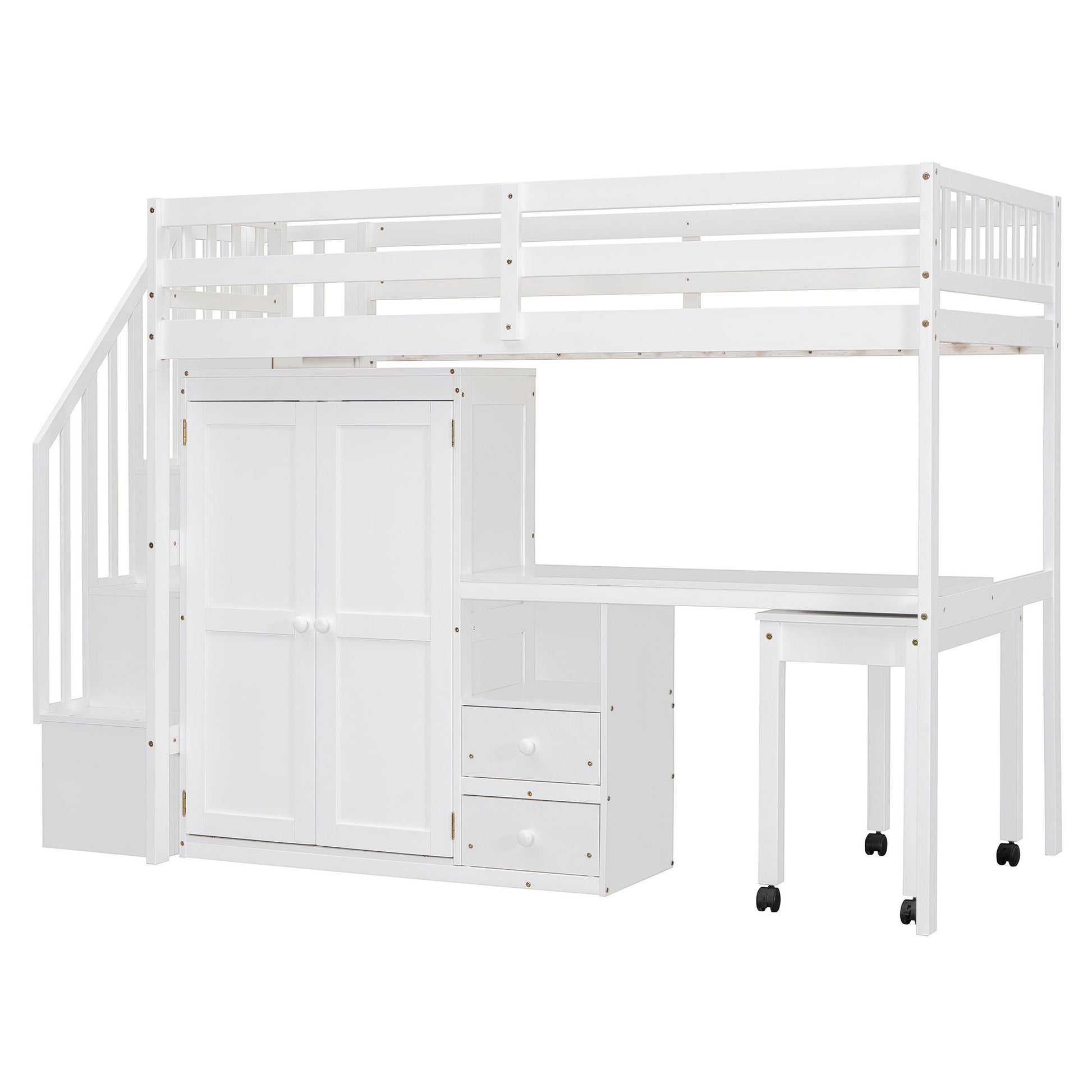 Twin Size Loft Bed With Stairs, Bookshelf, Drawers, Desk & Wardrobe, Space Saving Multifunctional Furniture - White