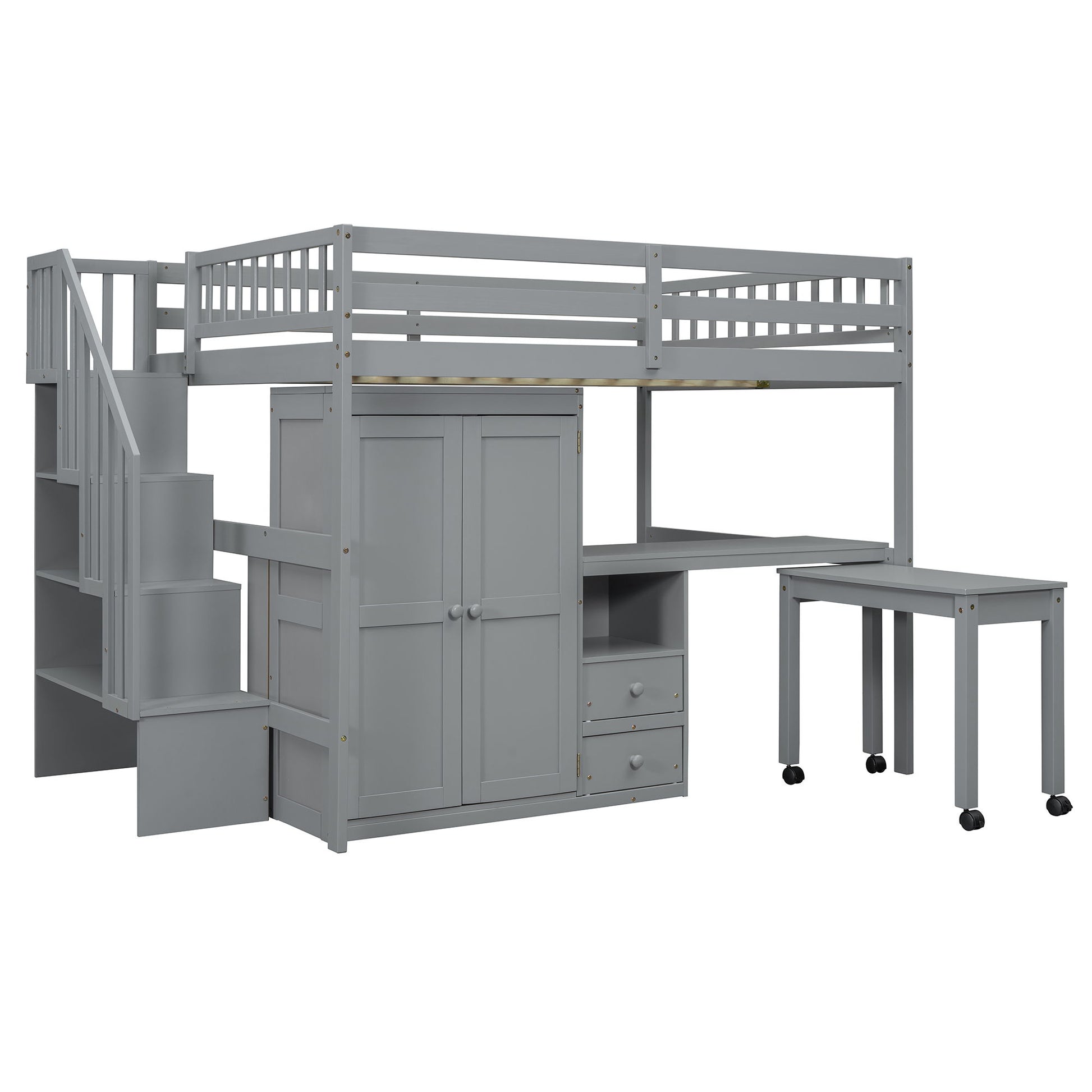 Full Size Loft Bed With Stairs, Bookshelf, Drawers, Desk & Wardrobe, Space Saving Multifunctional Furniture - Gray