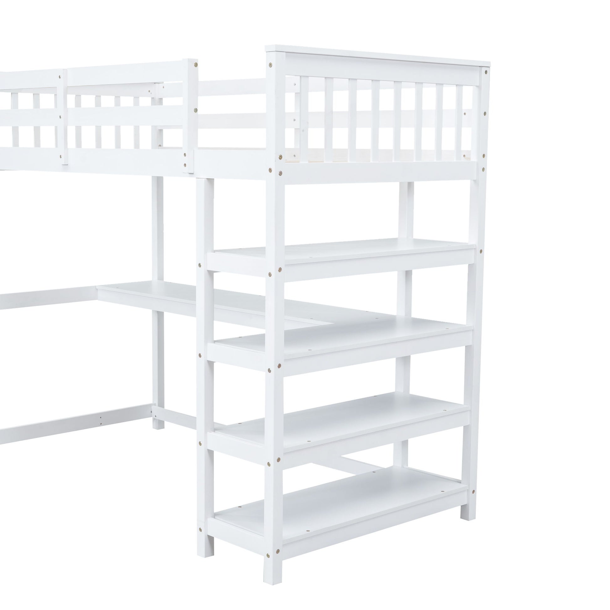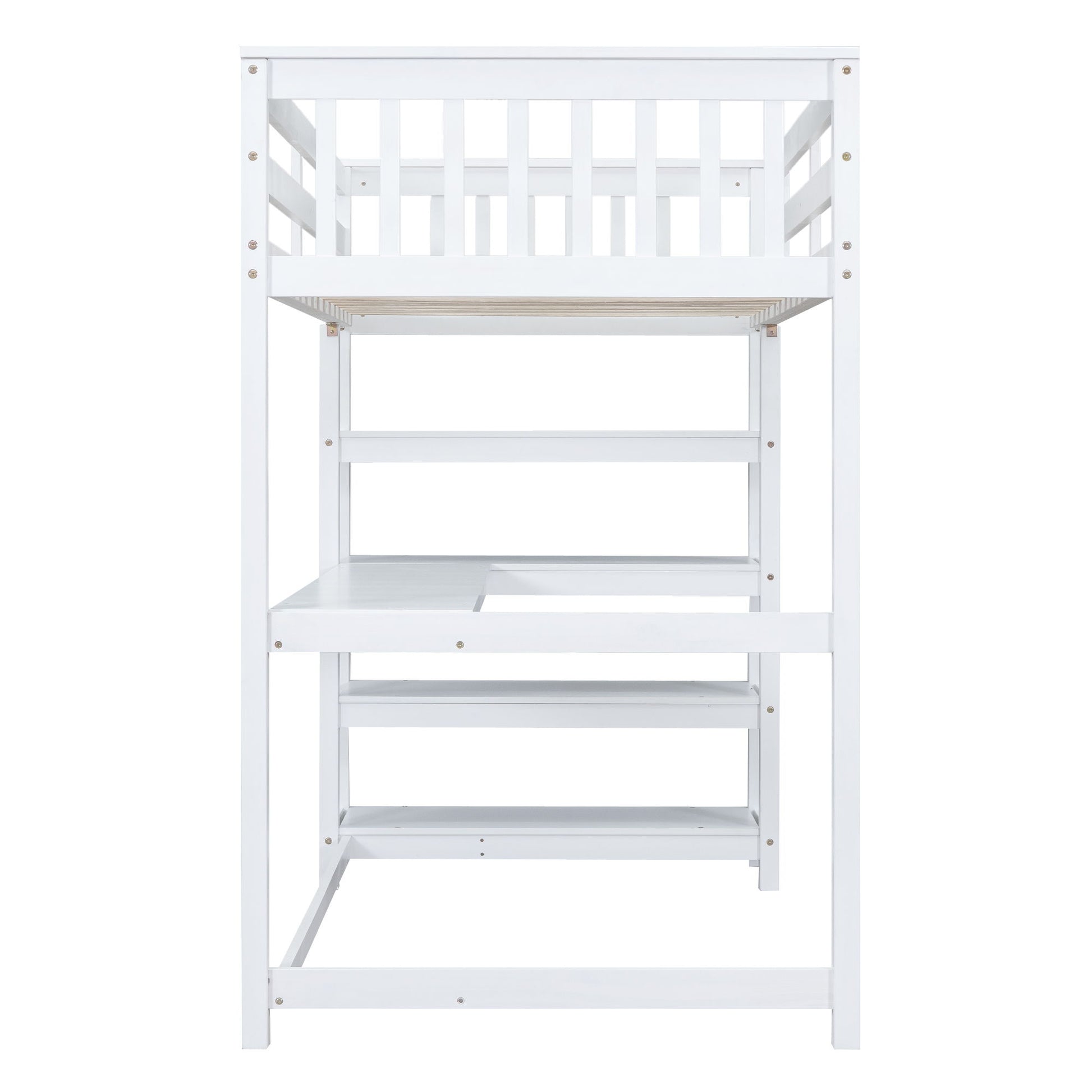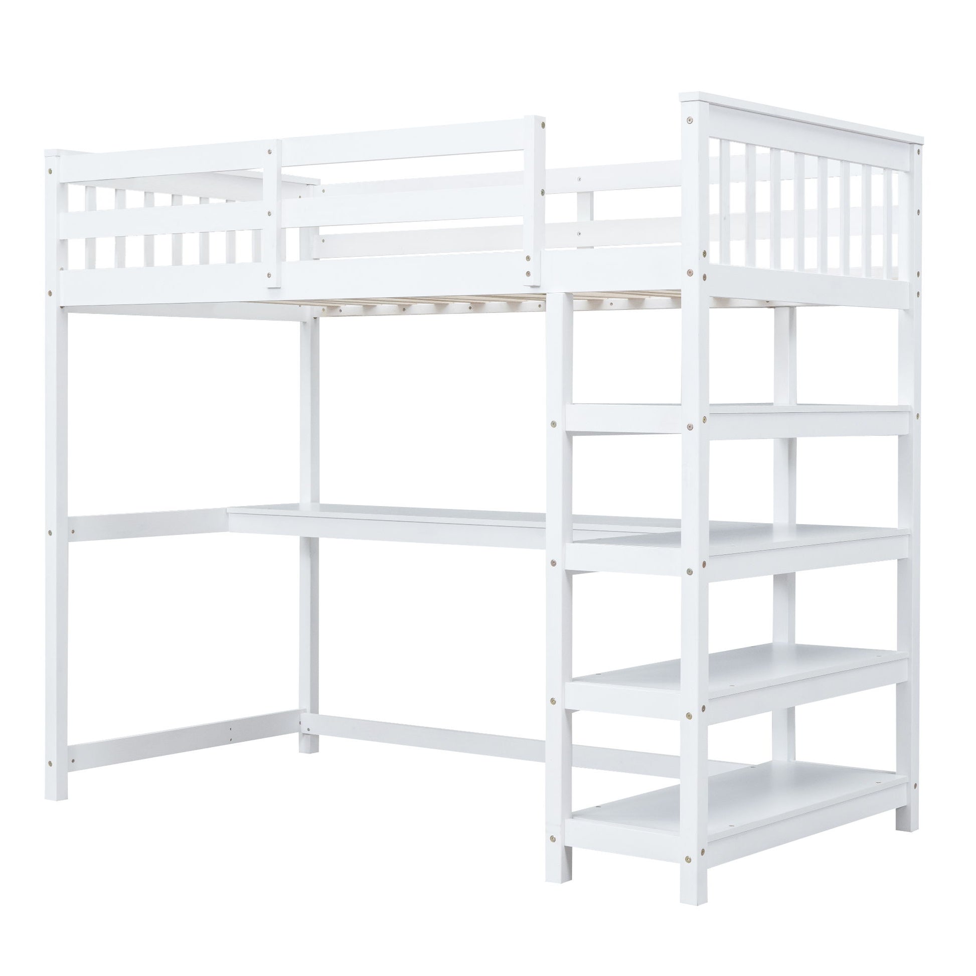 Twin Size Loft Bed With Storage Shelves And Under Bed Desk - White