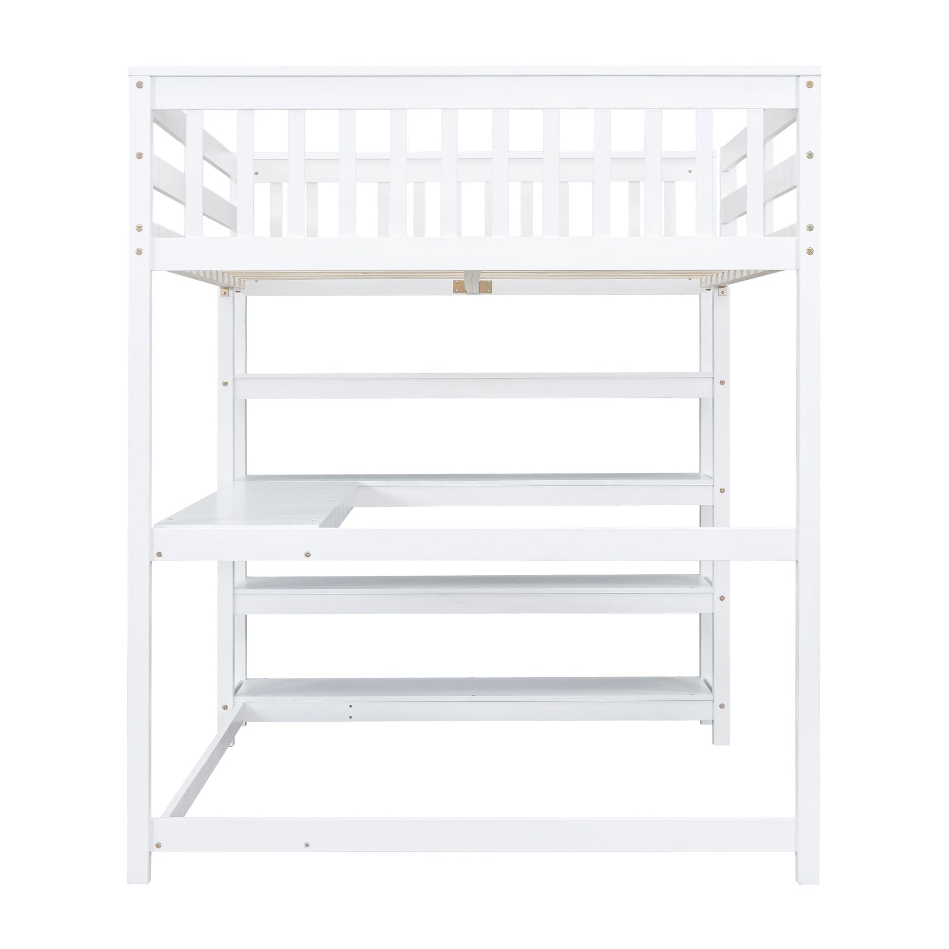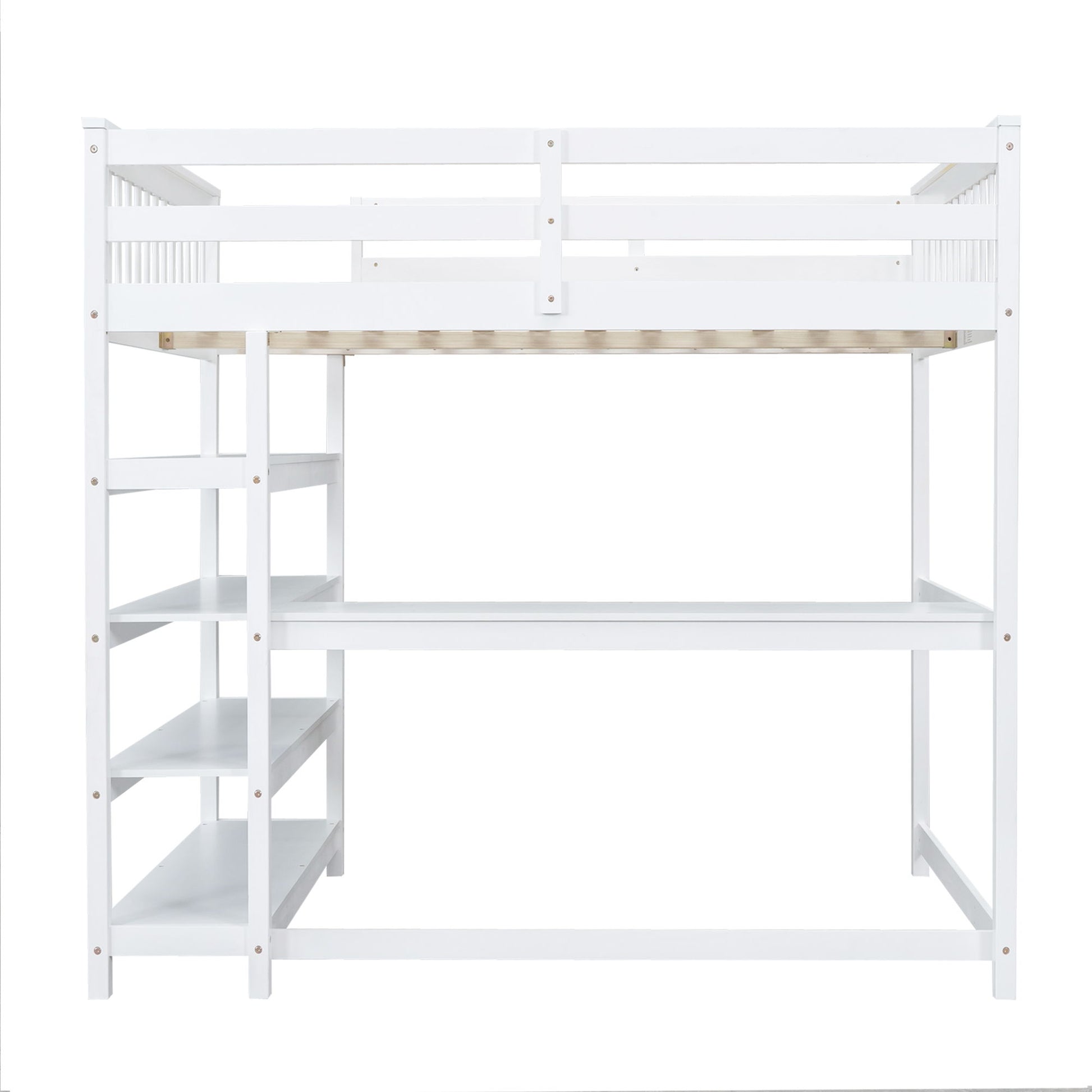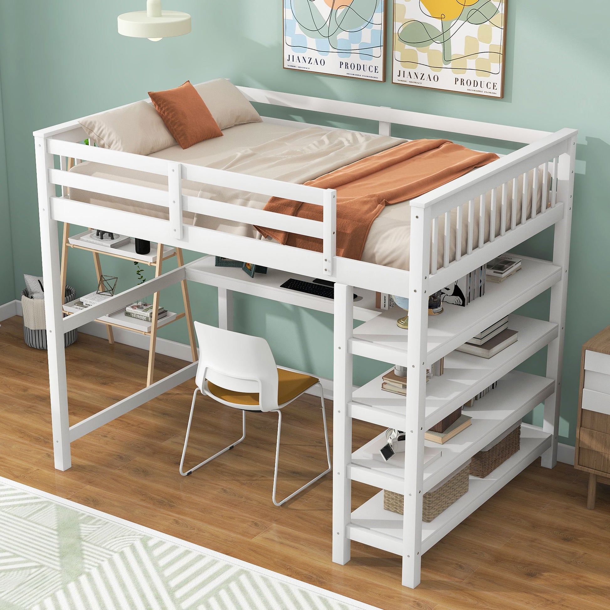 Full Size Loft Bed With Storage Shelves And Under Bed Desk - White
