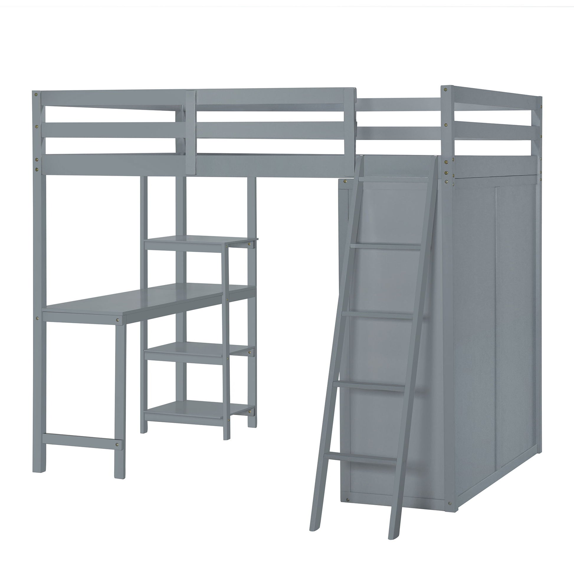 Full Size Loft Bed With Wardrobe And Desk And Shelves - Gray
