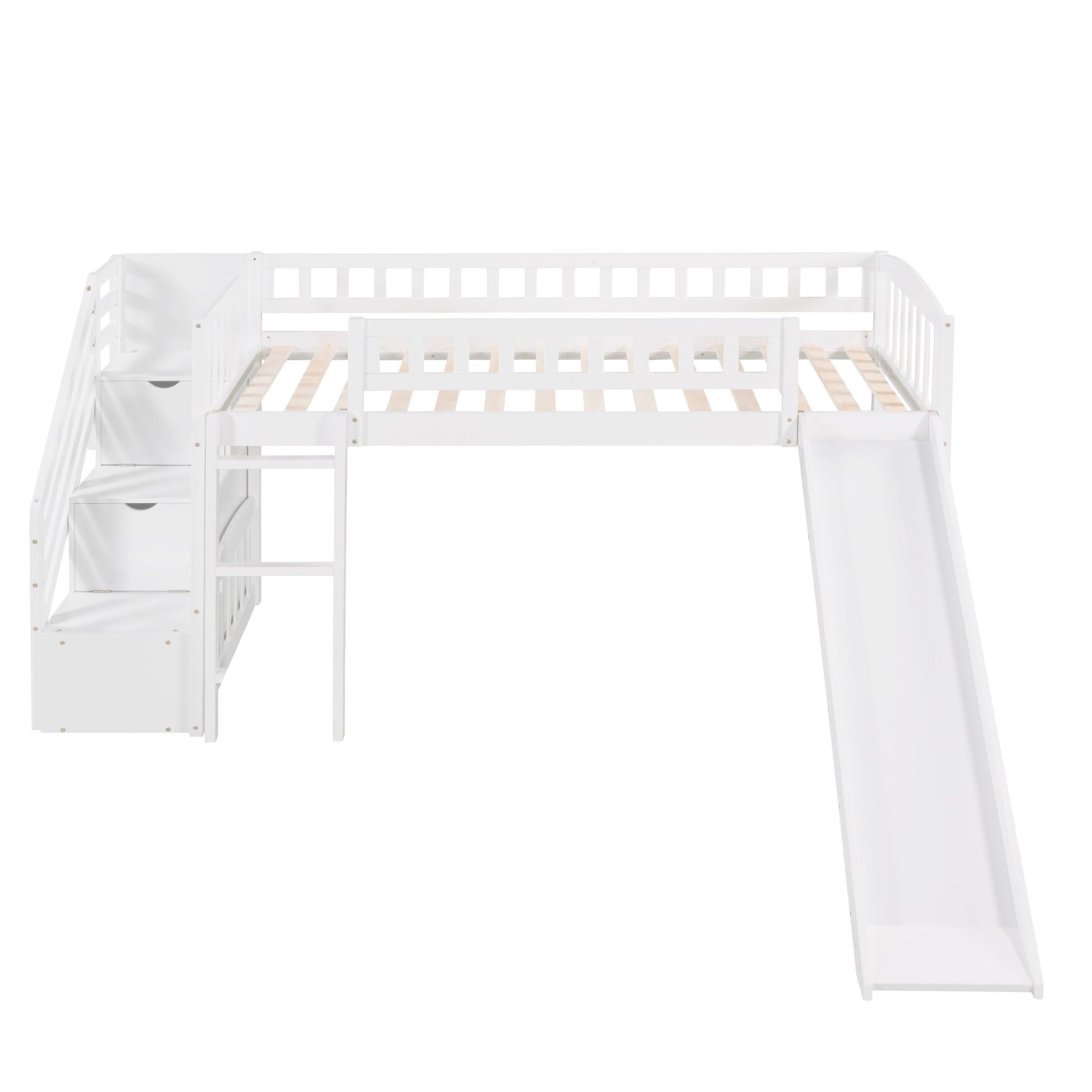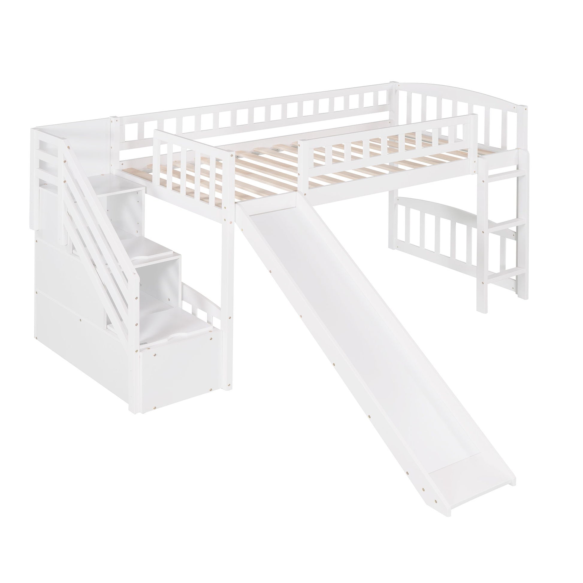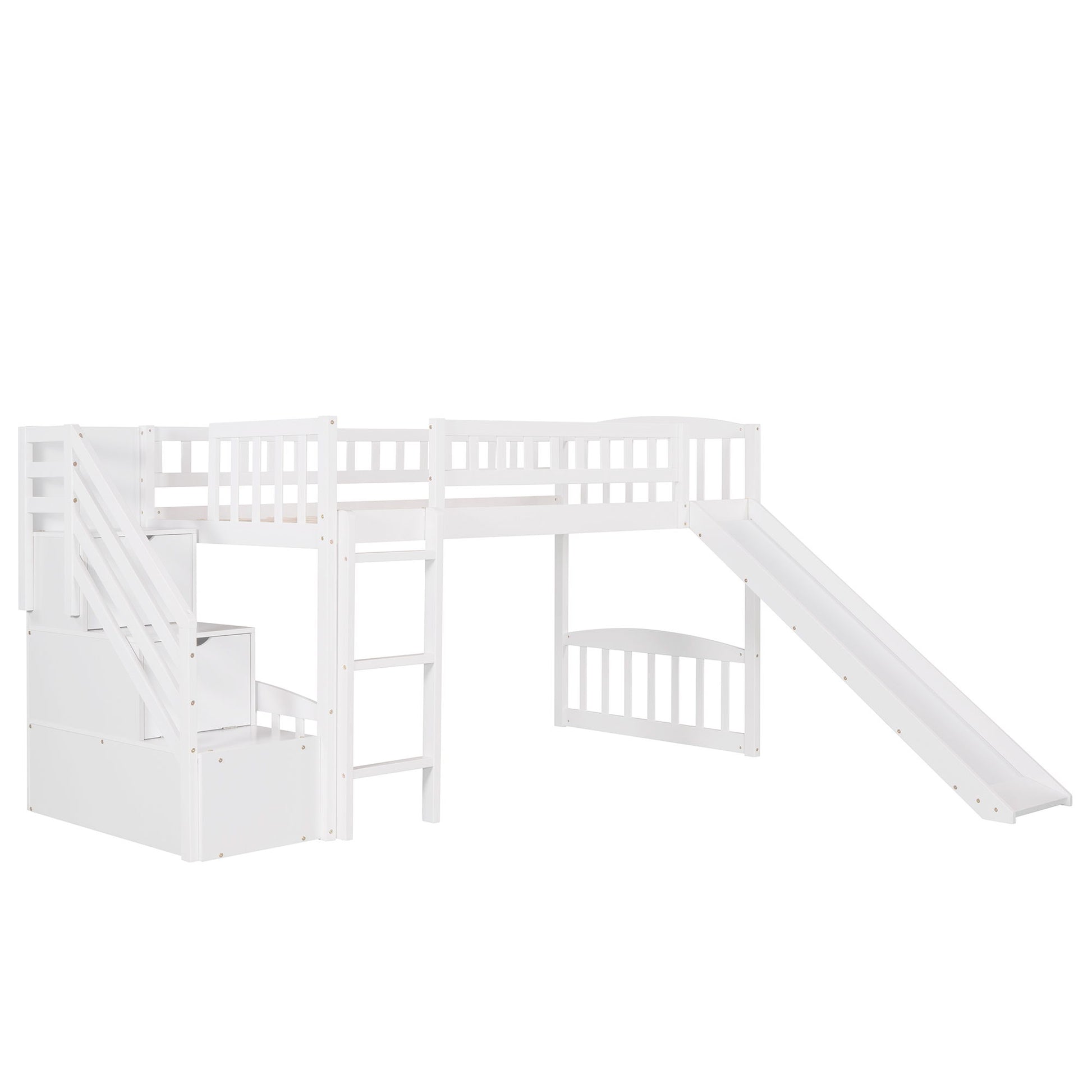 Twin Size Loft Bed Stairway With 2 Drawers And Slide - White