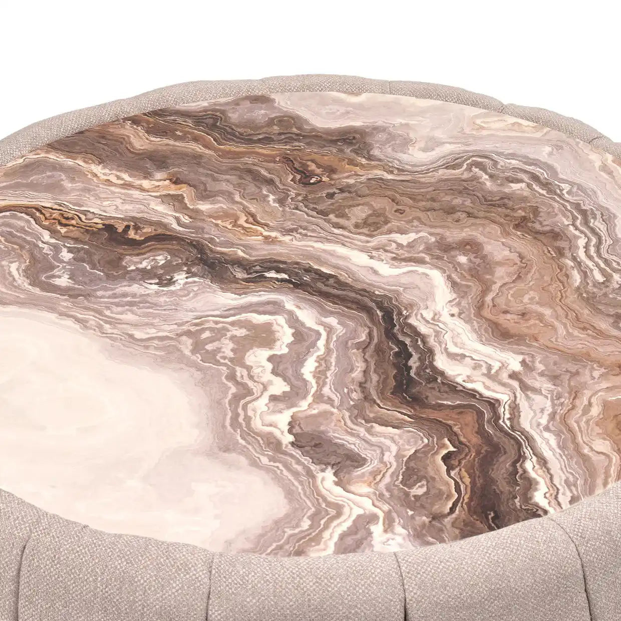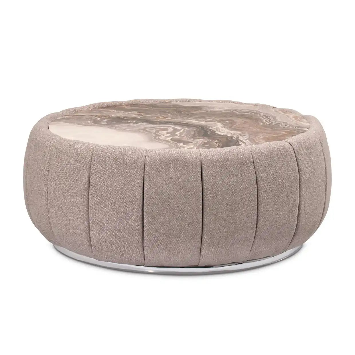 The Lucca Cocktail Table exudes understated luxury. Its round silhouette is elegantly dressed in a soft, channeled woven fabric, creating a warm juxtaposition with the sleek faux marble top. Nestled on a narrow silver base, it's a striking conversation starter, serving sophistication with every pour.