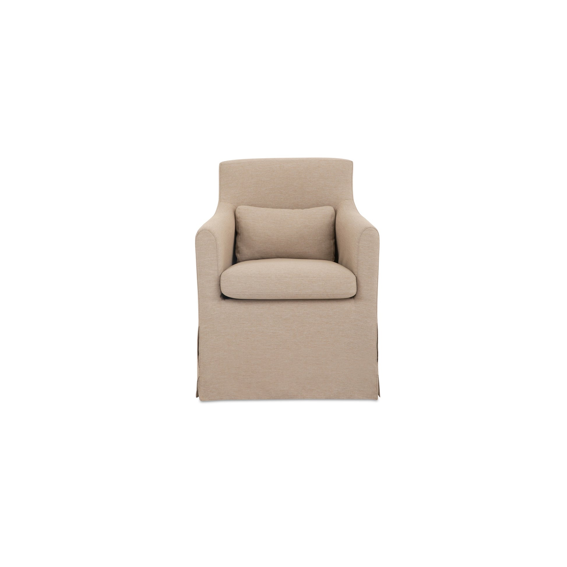 Make every outdoor meal feel considered. Lydia combines curved armrests with a light brown slipcover detailed by inverted pleats. Upholstered in recycled performance fabric, it�s supported by quick-dry cushions and an aluminum frame. A lumbar pillow adds comfort, while optional rollers allow for flexibility. A traditional profile built with smart outdoor materials, Lydia balances style and function in equal measure.