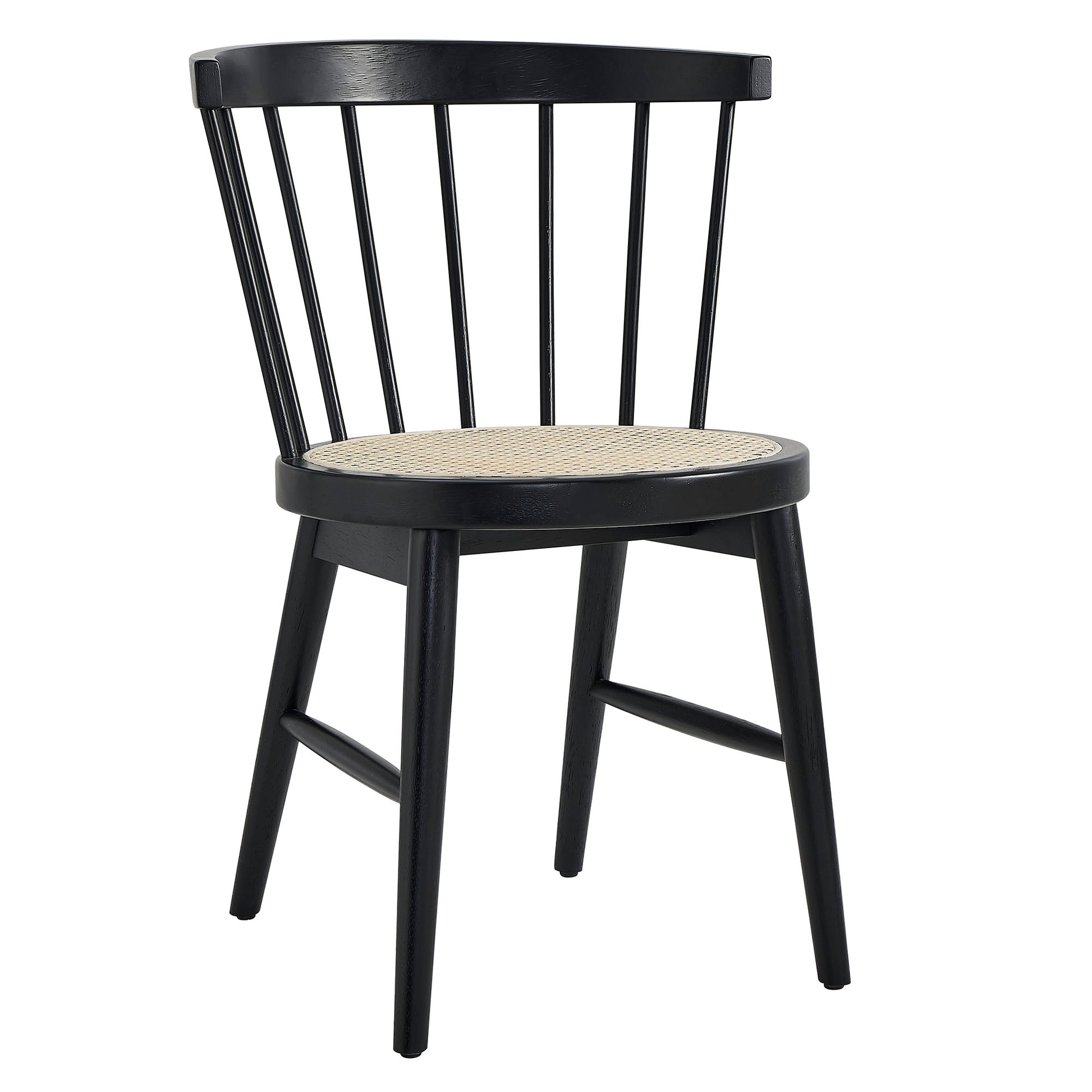 A refined take on the classic Windsor chair silhouette, the Lykke Dining Chairs bring timeless charm and updated materials to modern dining spaces. Crafted with a rubberwood frame, this dining chair set of 2 features gently curved backrests, slender spindle supports, and subtly tapered legs for a balanced, mid-century-meets-farmhouse aesthetic. The round seat is topped with a woven synthetic rattan cane inset, offering a light, breathable surface with natural texture and visual warmth. Whether styled as a pair around a breakfast table or mixed into a more eclectic dining setup, the Lykke Dining Chairs make a comfortable, design-forward addition to kitchens, dining rooms, or breakfast nooks. Weight Capacity: 400 lbs.