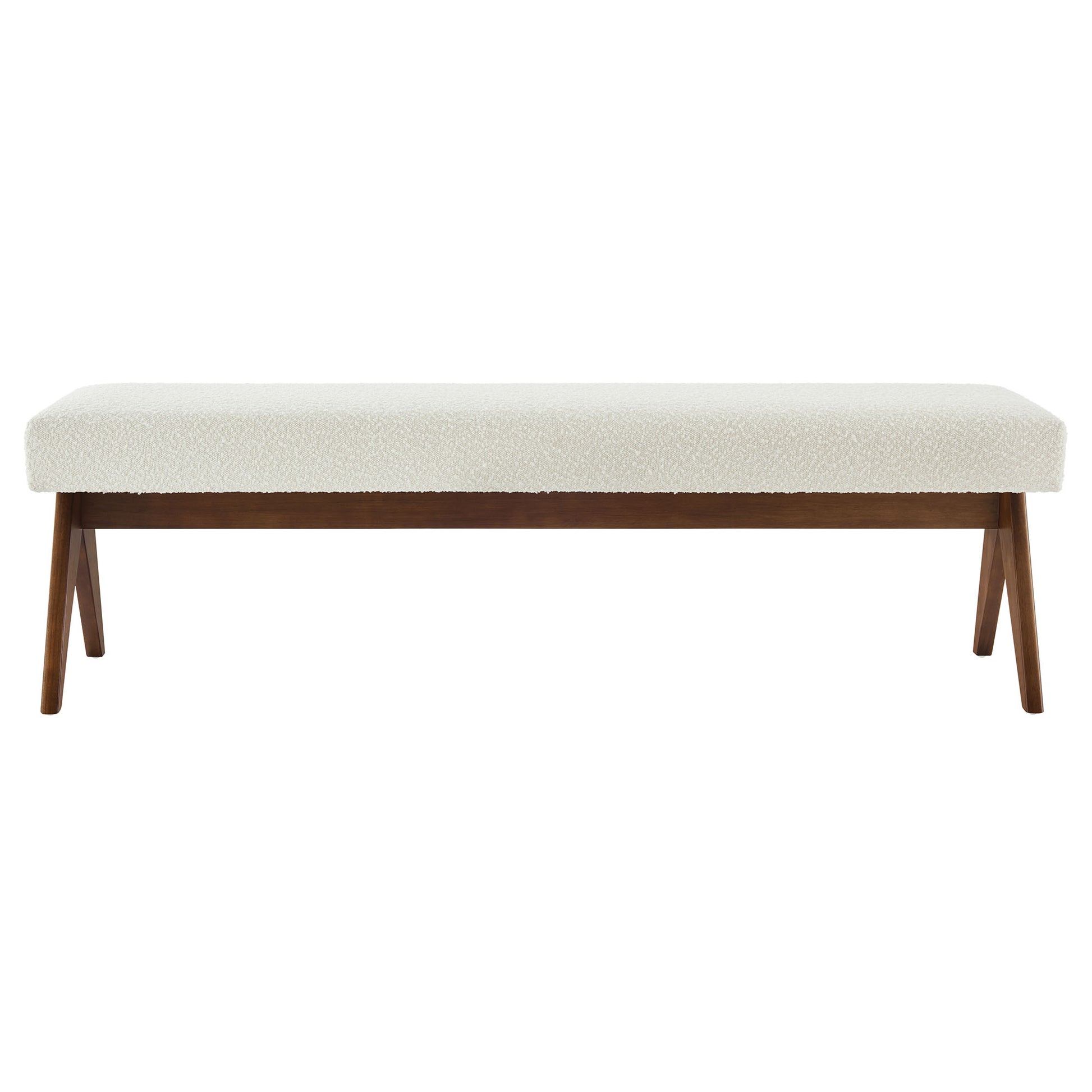Add comfort and style to your home with the Lyra Boucle Fabric Upholstered Bench. This 63 inch accent bench is chic and luxurious, featuring a softly contoured design with a plush padded seat. Lyra comes upholstered in boucle fabric, providing a versatile and trendy seating option whether used as a sitting bench, entryway bench, or even as additional seating in a breakfast nook. With a sturdy plywood frame, splayed rubberwood legs, and dense foam padding, this boucle bench seat offers both stability and style, enhancing living room, bedroom, or hallways. Positioned at the end of your bed or used as a window seat, the Lyra decorative bench effortlessly adds a touch of elegance wherever it's placed. Includes non-marking feet. Assembly Required. Weight Capacity: 992 lbs.