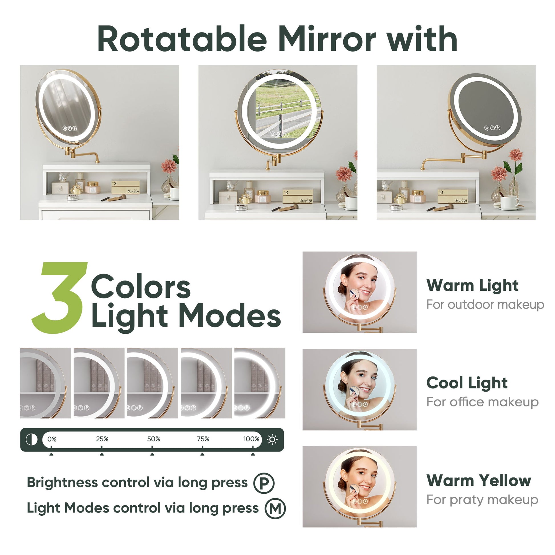 - 360° Rotated Mirror: Features adjustable lighting and 3 color settings for precise makeup application.