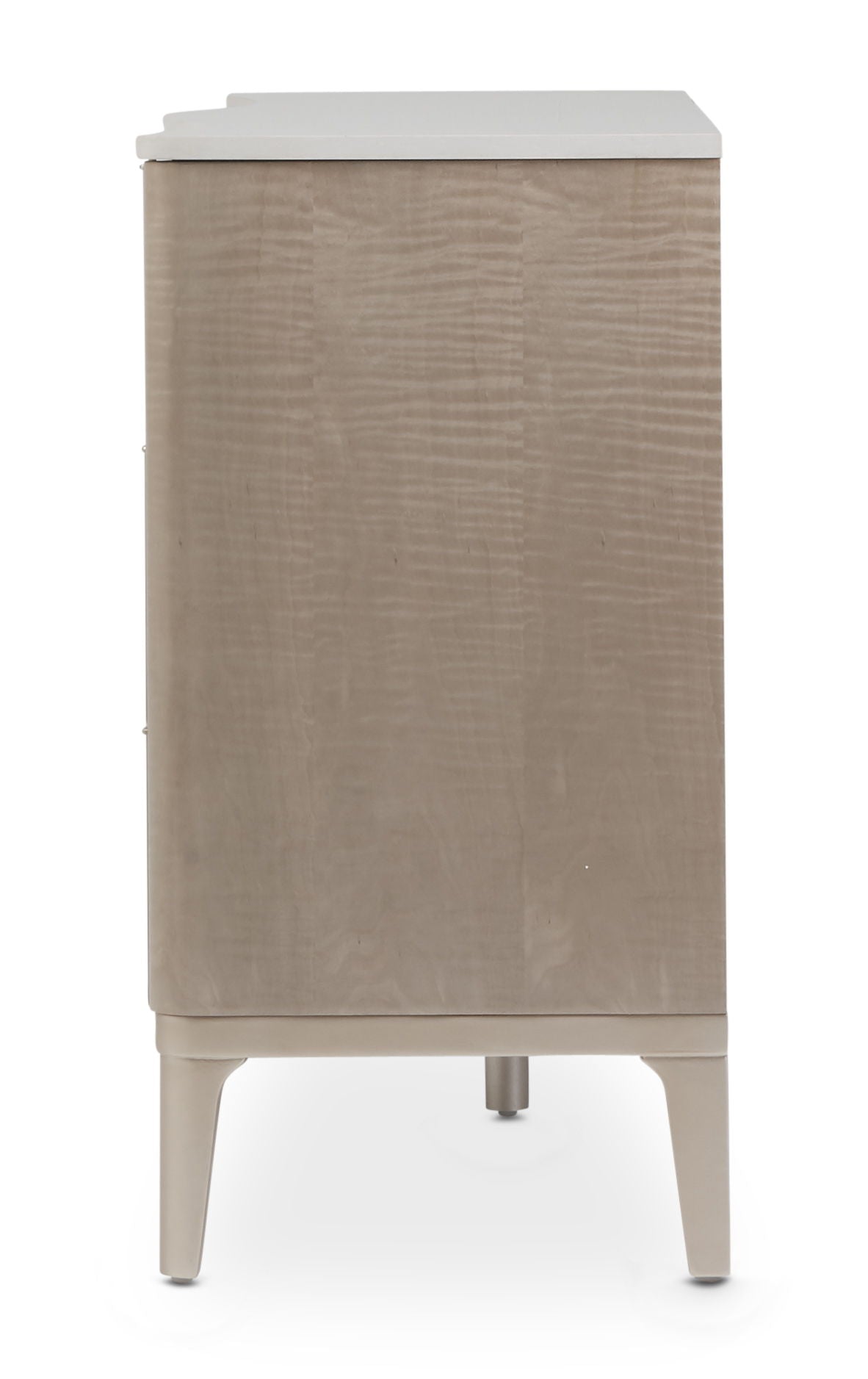 The Malibu Crest Dresser is the picture of modern class. Everything speaks to beauty and quality, like the dresser’s scalloped shaped front, the Maple veneer and graceful waterfall handles. Crafted with hardwood solids and pearl toned cultured marble, and featuring a false-bottom hidden storage compartment, this Dresser is certain to match your chic taste.