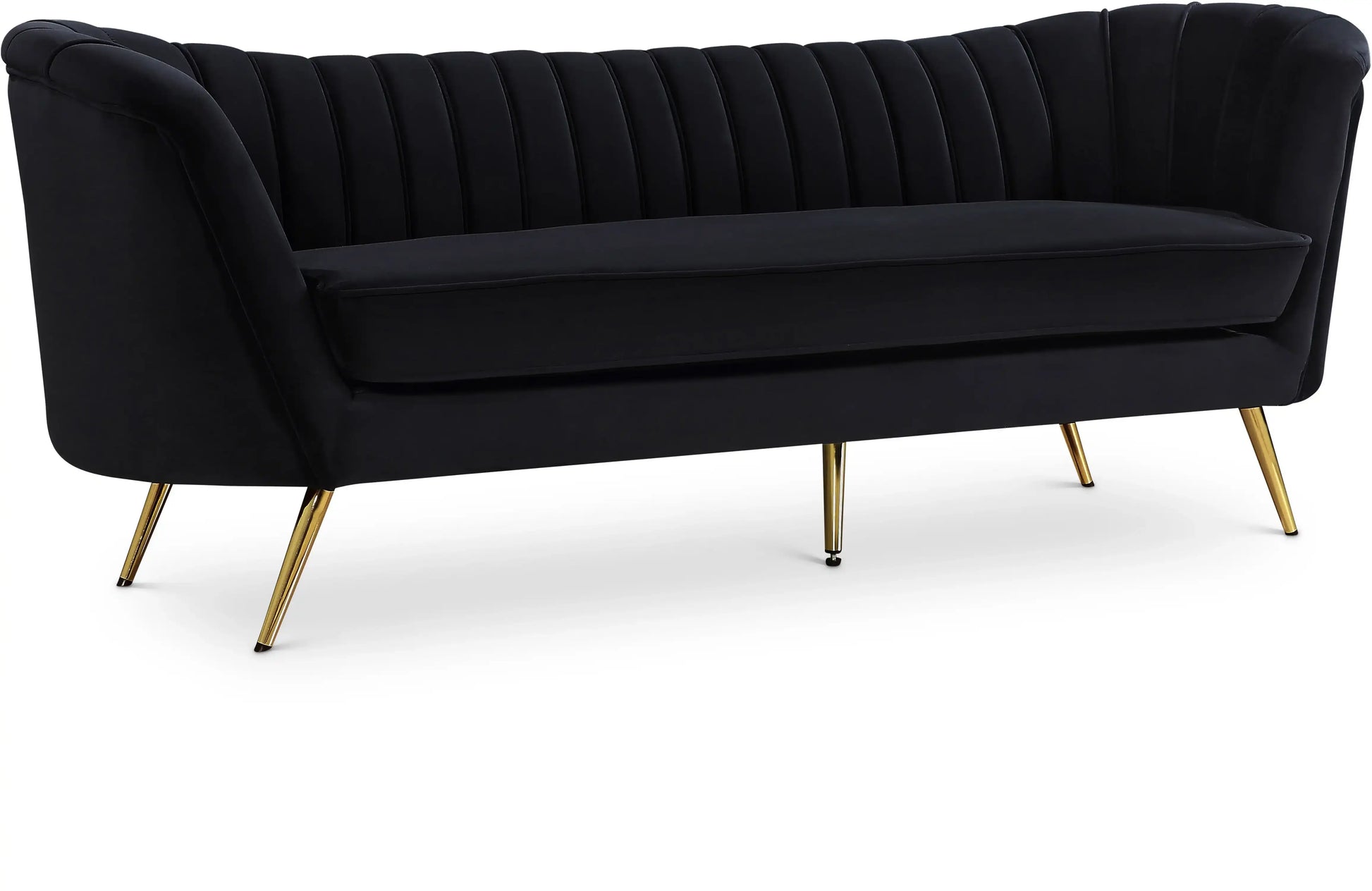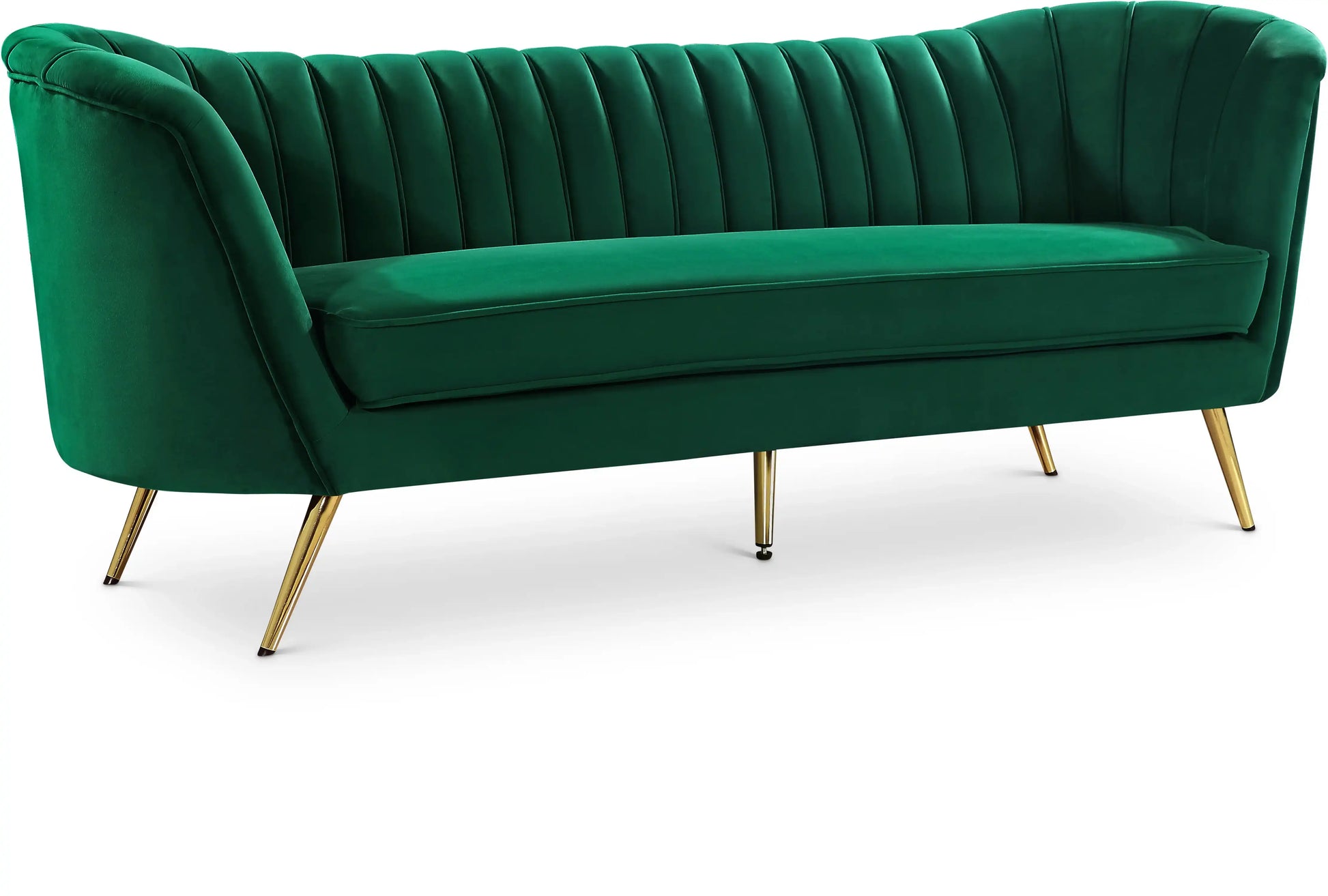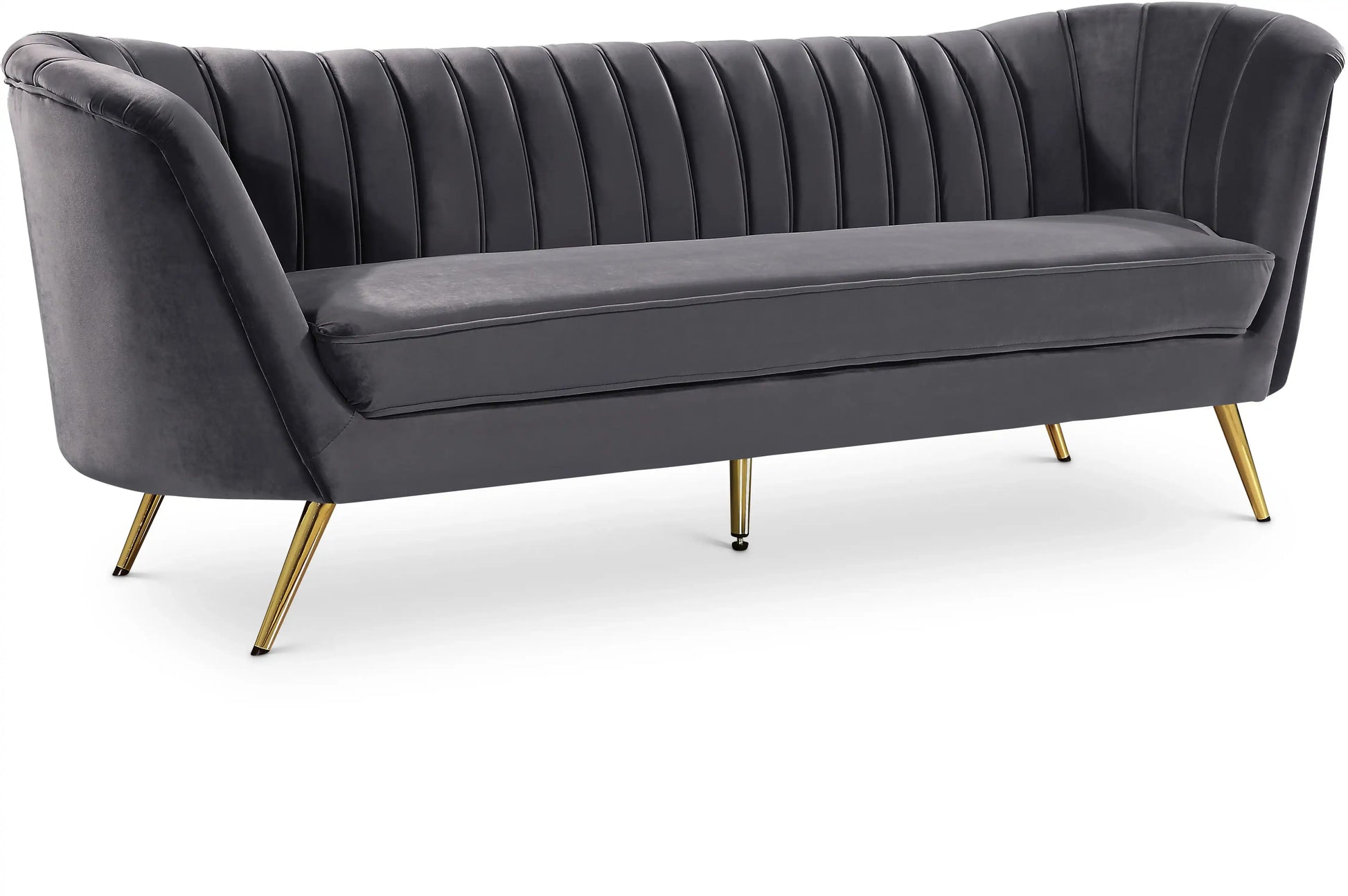 Lean back and lounge in luxurious style on this stunning Margo velvet sofa by Meridian Furniture. This contemporary sofa features plush velvet upholstery that is both classy and sumptuous against your skin, a single seat cushion and rounded arms that curve into a low, rounded back, creating a perfect, modern piece for your home. stainless steel legs support this sofa and provide stunning contrast to the sofa's plush, fabric.