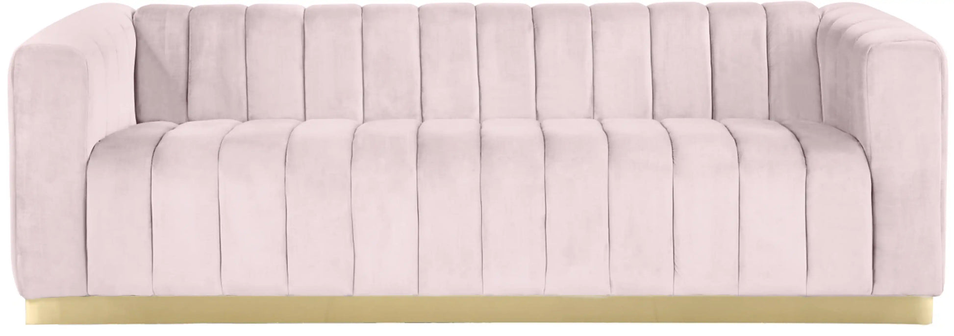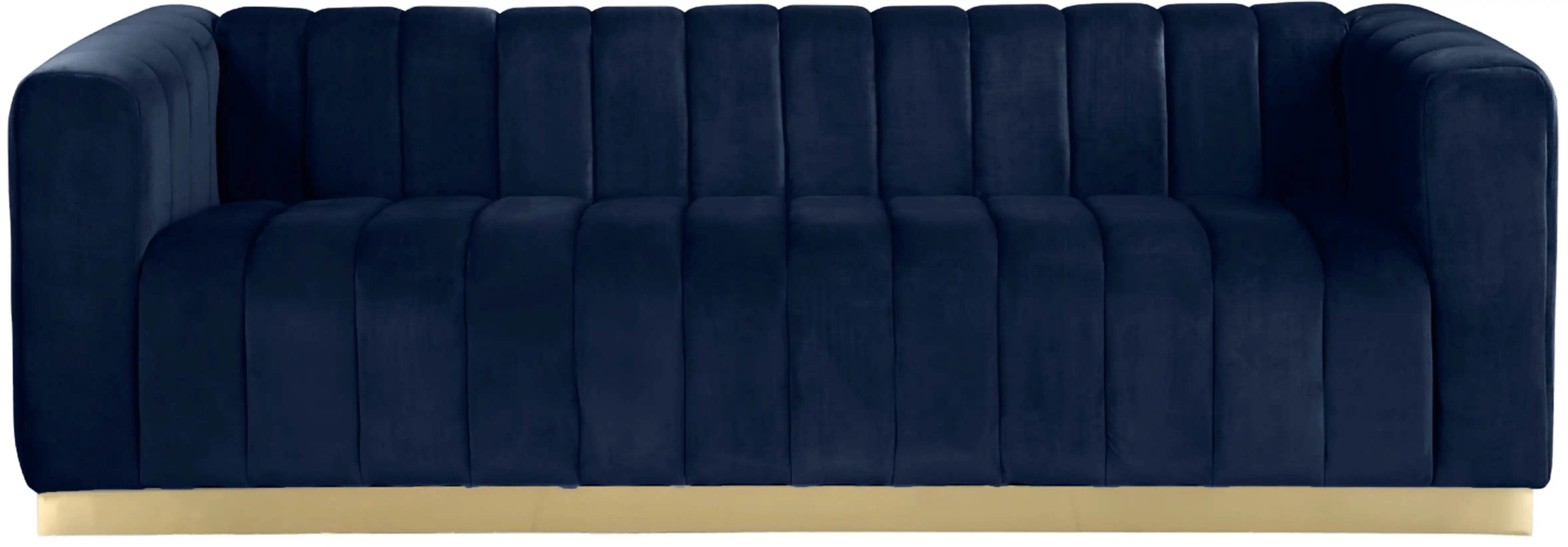 Seat guests in the epitome of comfort and style with this Marlon velvet sofa. This piece is just the thing to showcase your modish style while ensuring total enjoyment from all who are lucky enough to relax on its channel tufted seats. The soft velvet upholstery adds a beautiful touch to your space and feels great against your skin while the brushed gold stainless steel base lends it a contemporary finish.