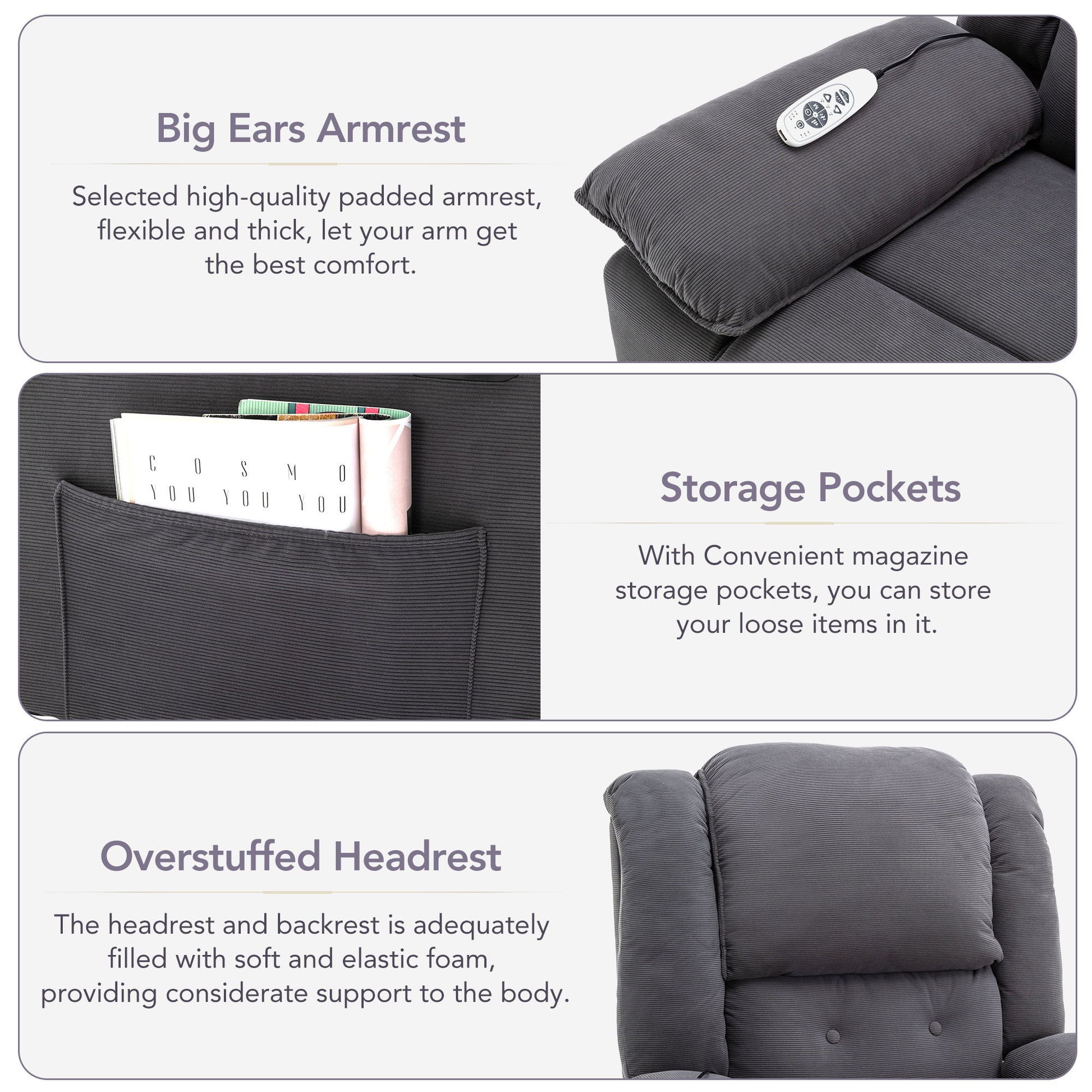 - Lift Assistance: The chair features an innovative lifting mechanism that provides smooth and powerful assistance from a seated to a standing position, making it ideal for the elderly or individuals with mobility challenges.