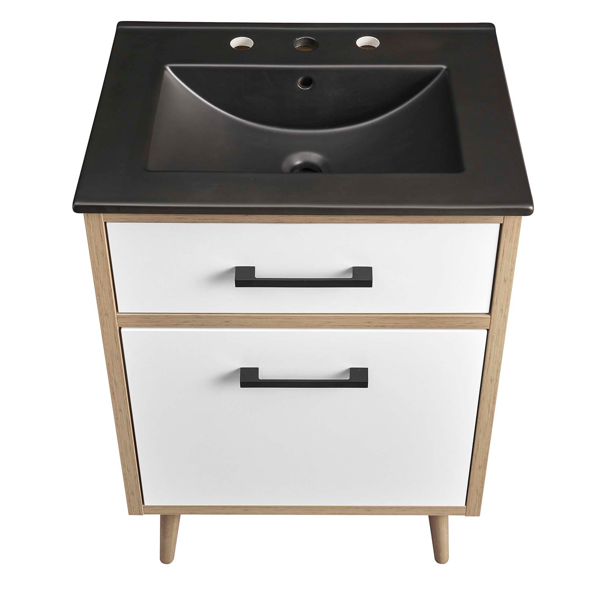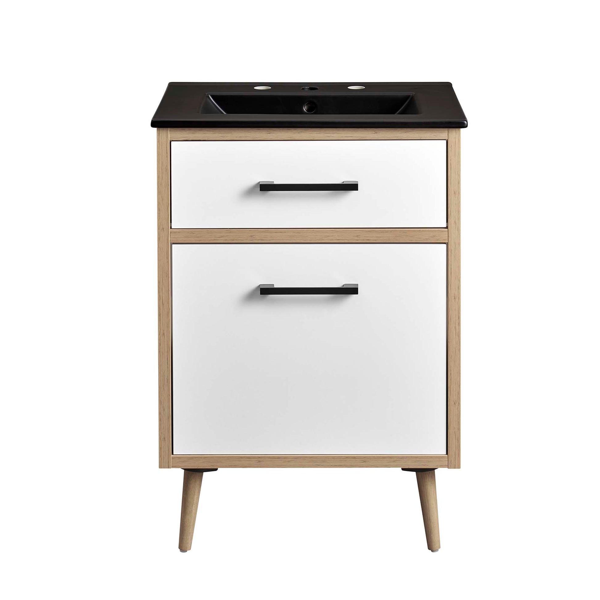 The Maverick 24" Bathroom Vanity is the perfect blend of modern style and convenience. Crafted with particleboard and melamine, the simple yet elegant design is enhanced by modern metal handle pulls and tapered and splayed rubberwood legs. The spacious full-glide bottom drawer provides plenty of storage space for all your bathroom essentials, while the fixed top drawer adds complementing style. This bathroom vanity cabinet features a ceramic sink basin with an integrated countertop and 8" widespread faucet holes. This bathroom vanity instantly transforms your space, creating a beautiful, modern look that will last for years. Includes non-marking foot glides to protect flooring. Assembly required. Fixtures not included.