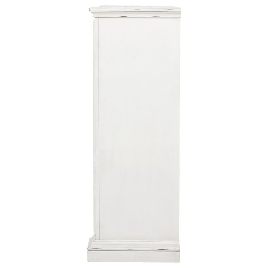 Timeless in spirit and refined in detail, this five-drawer chest evokes quiet charm and lasting beauty. A vintage white finish softens its stately frame, while molded edges and antique bronze ring pulls add character and depth. Designed with thoughtful craftsmanship, it offers spacious storage and smooth functionality. Built from poplar, engineered wood, and veneer, it brings elegance and purpose to the bedroom.