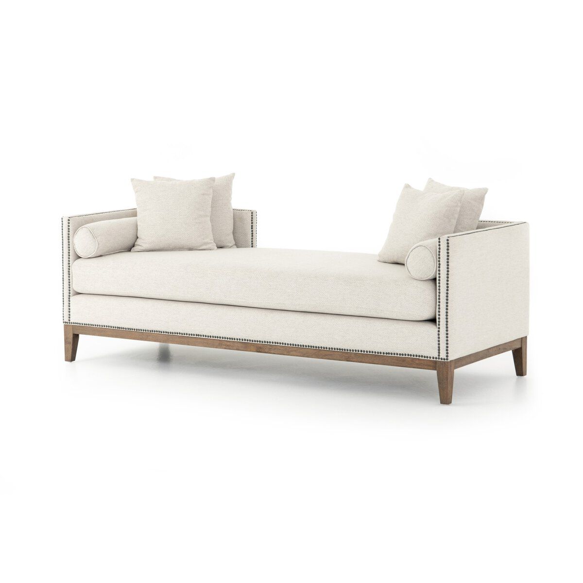 Designed to stand apart, the Mercury Double Chaise by Four Hands brings a sculptural presence to the room through its open chaise silhouette and layered materials. Low-slung proportions are grounded by parawood legs wrapped in a neutral stone covering, creating a refined contrast that feels both architectural and inviting. Aged brass nailheads trace the form with subtle luster, reinforcing the piece’s tailored character.