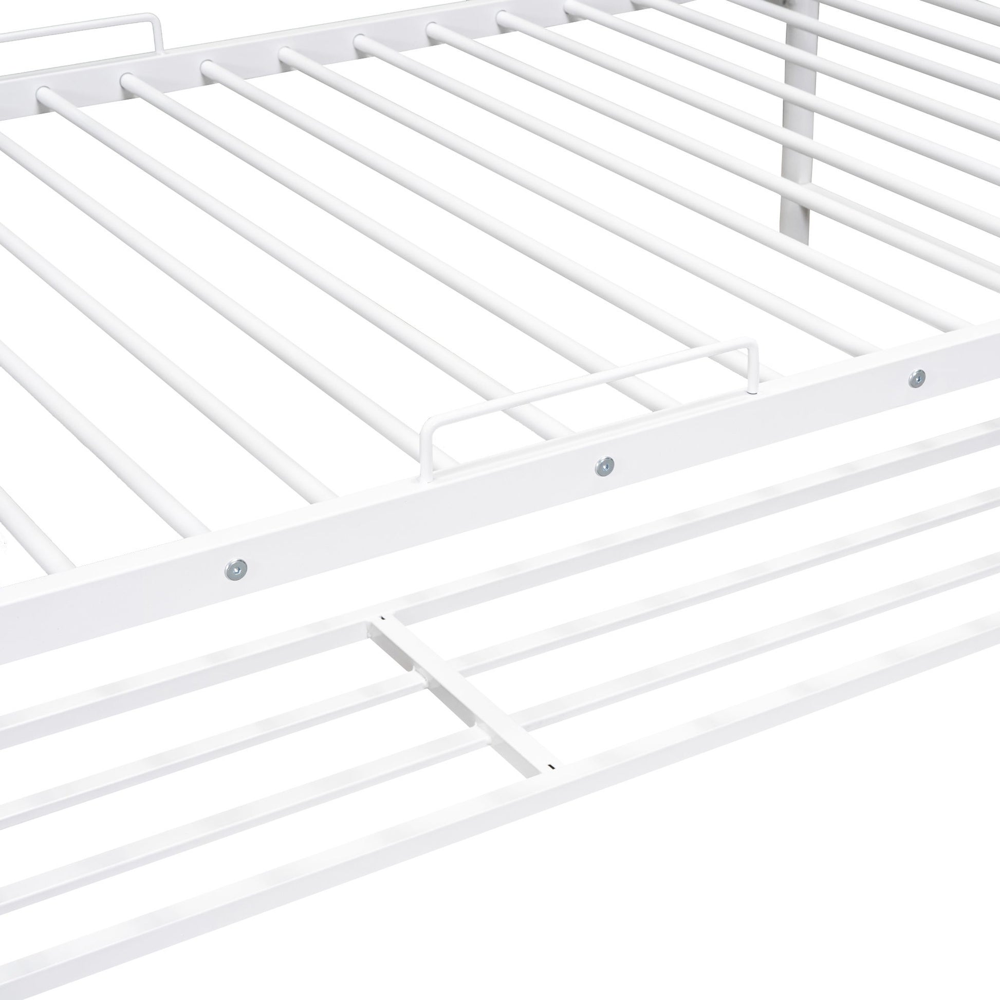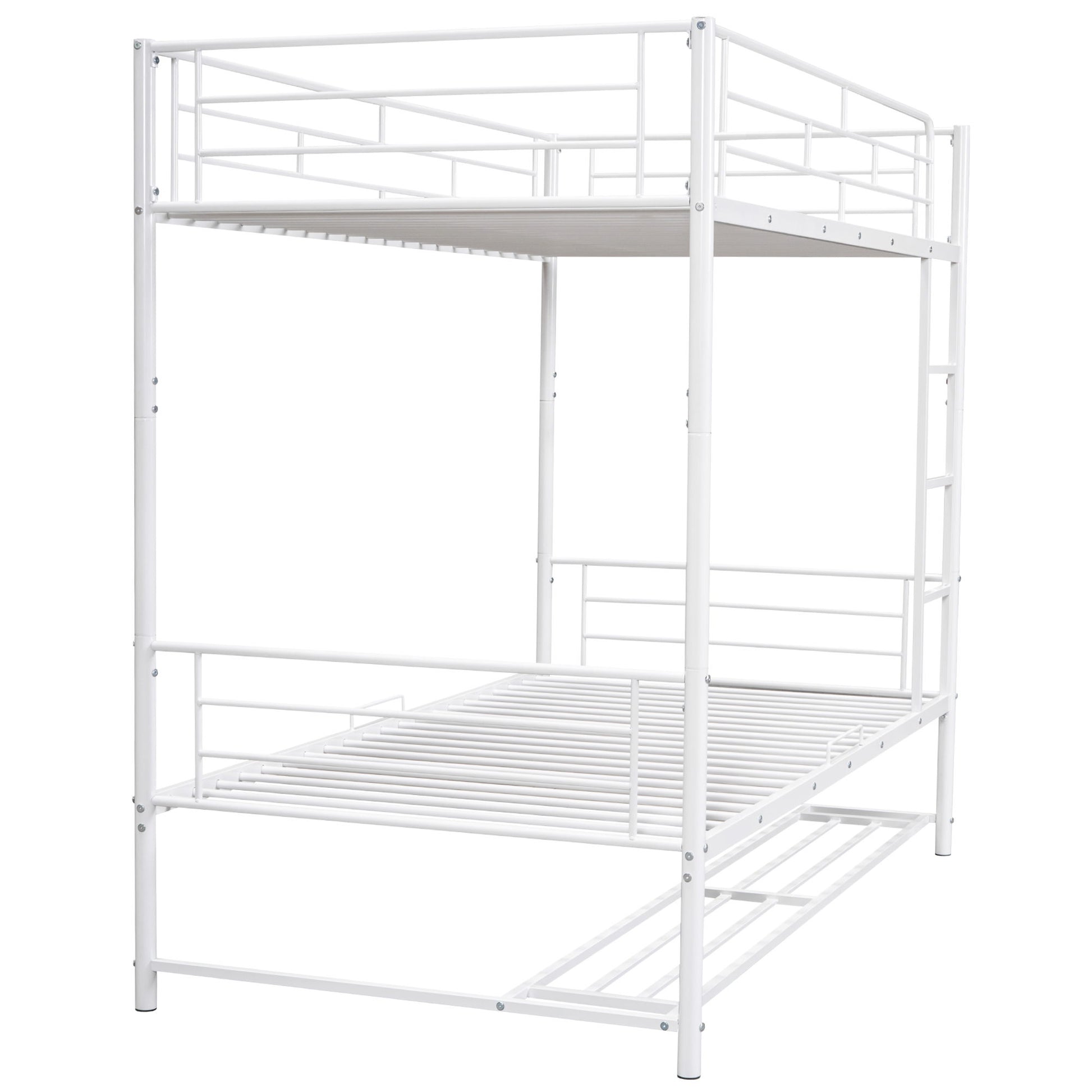 This metal bunk bed is made with sturdy metal and has a clean-cut silhouette that can be matched with any room decor. Designed with safety in mind, this bunk bed comes with a ladder integrated into the frame that is easy to climb up and down. With a practical design, this versatile bunk bed can be separated into two beds to meet your different needs.The shelf underneath the bunk bed creates extra space for you to stock shoes, boxes, toys or any small items you like. Some assembly is required, and the bed will definitely be assembled conveniently.