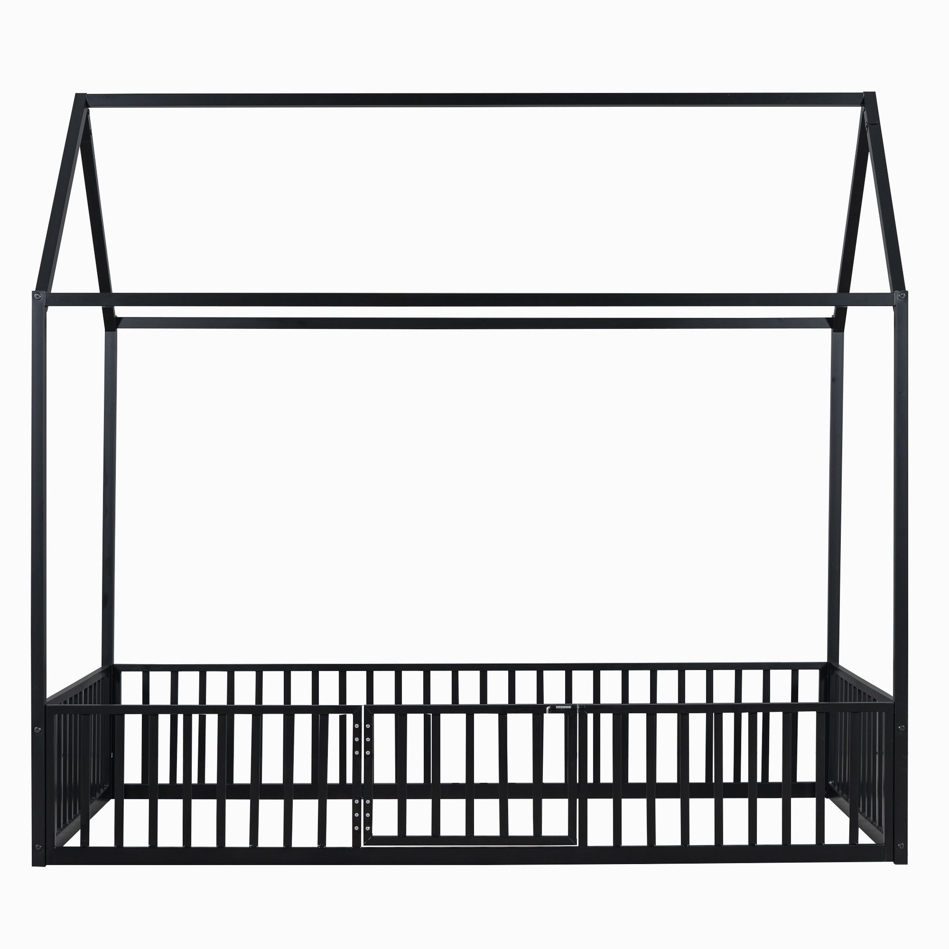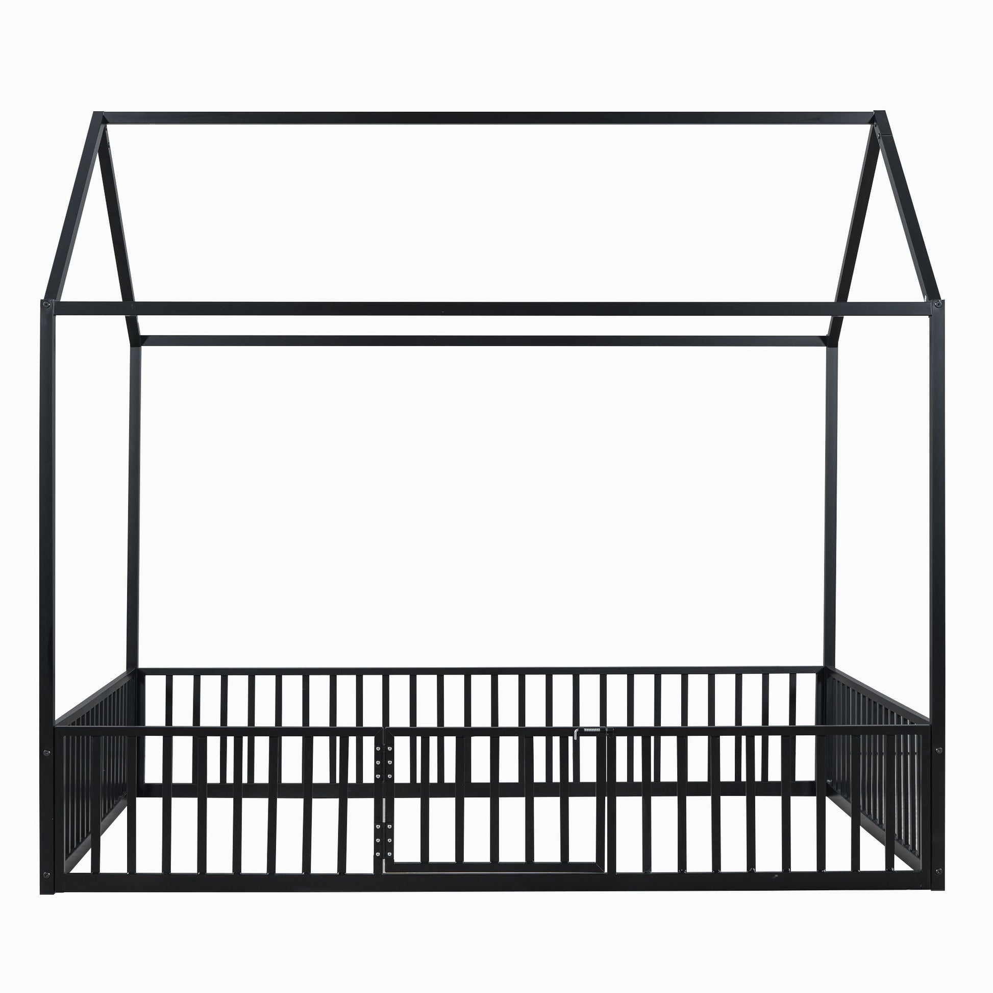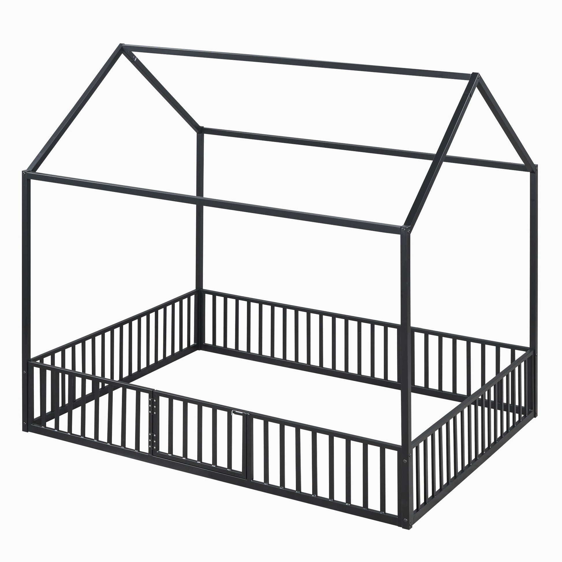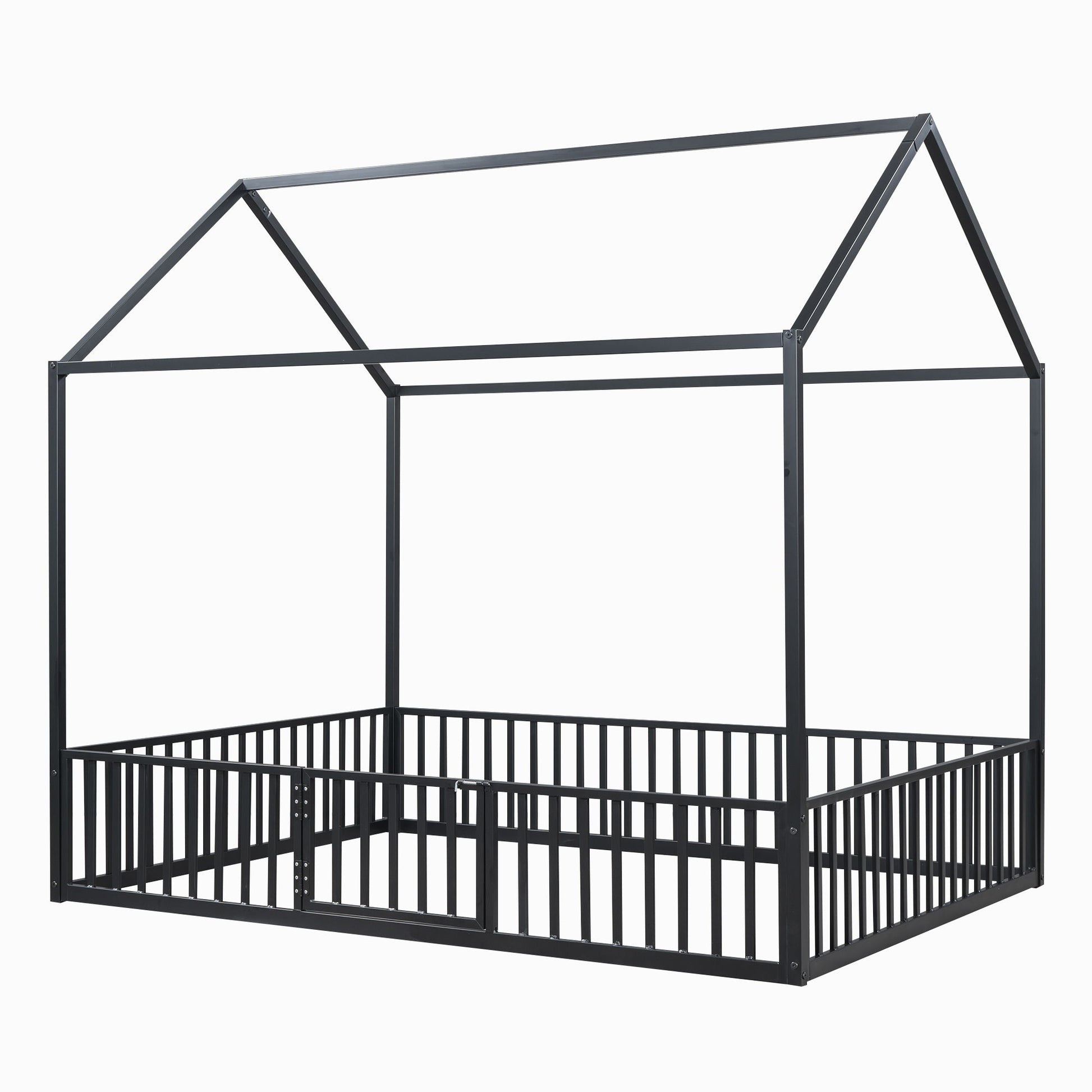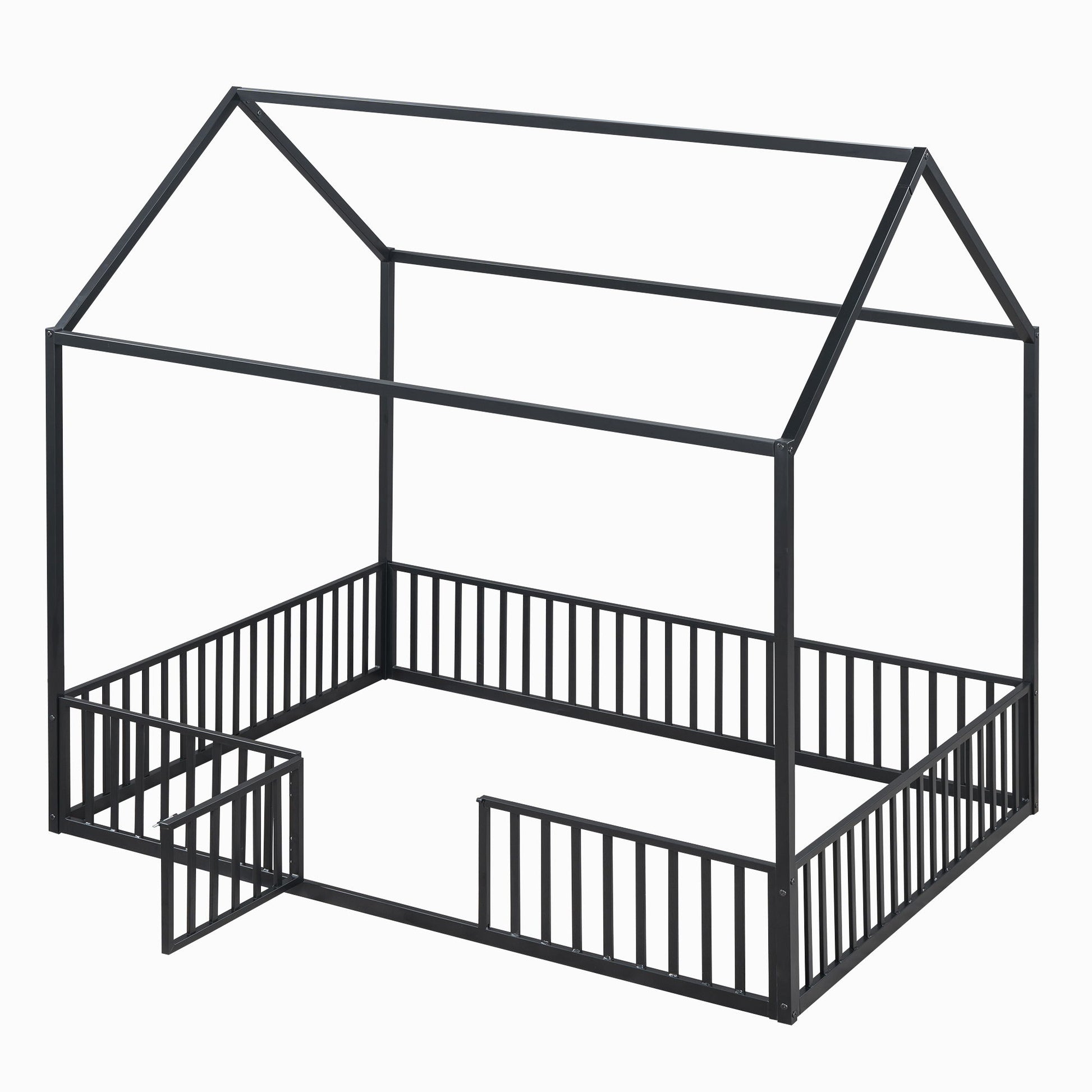 Full Size Metal House Bed With Fence And Door - Black