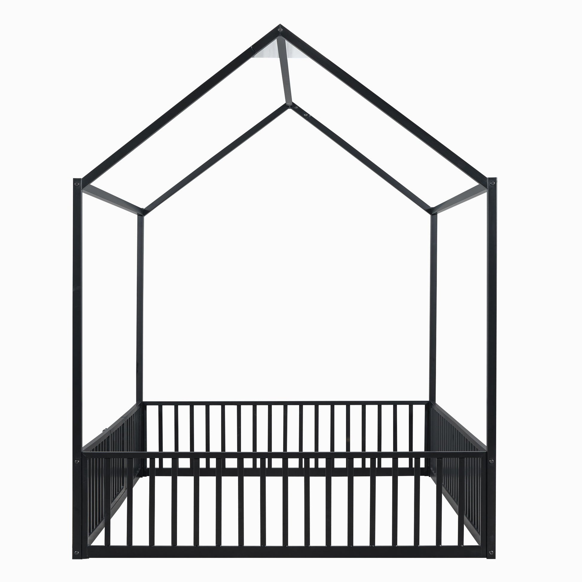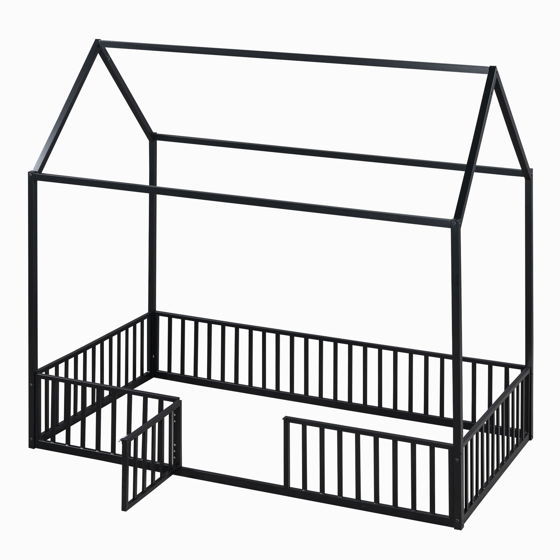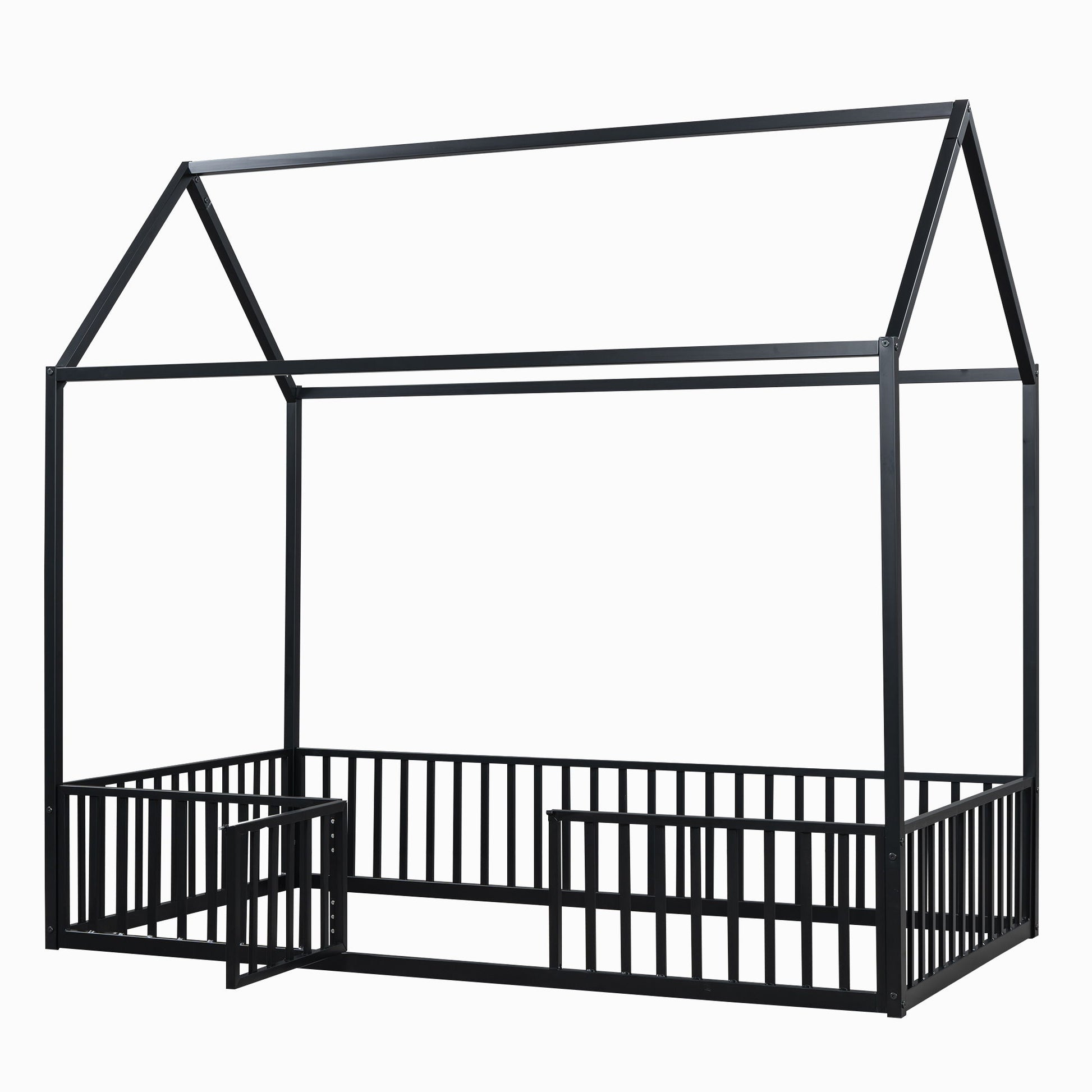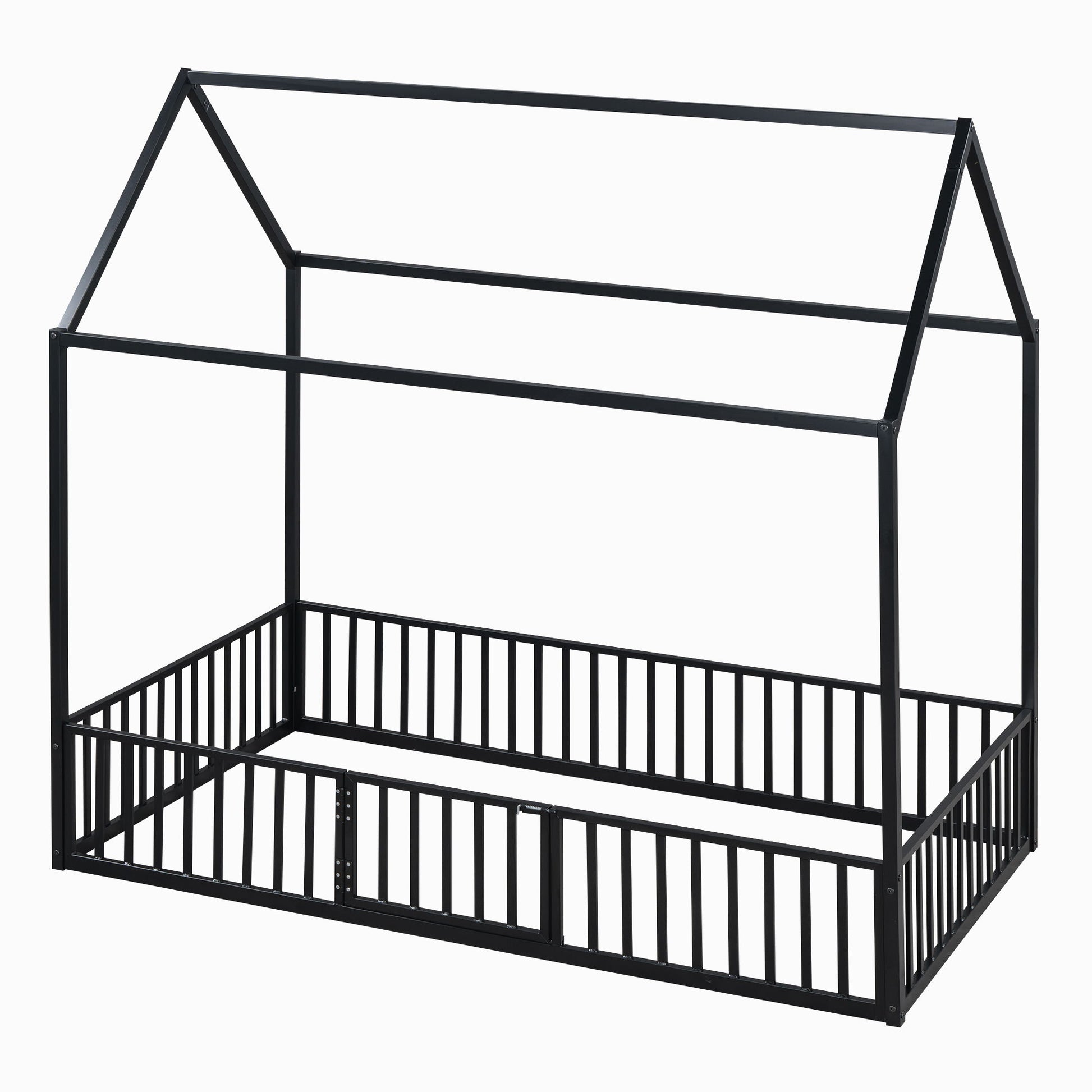 Full Size Metal House Bed With Fence And Door - Black