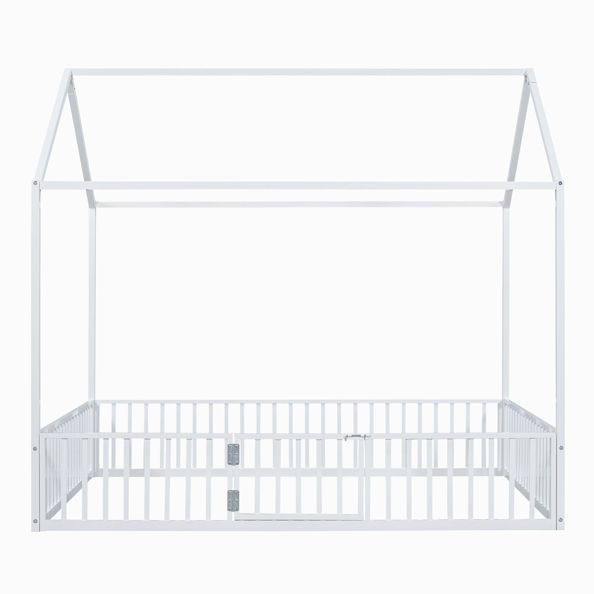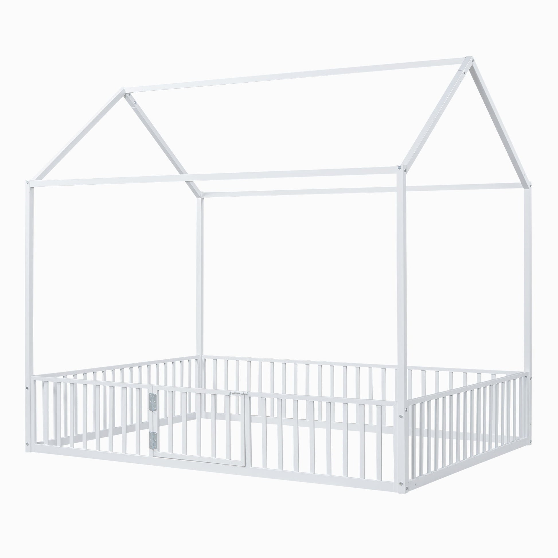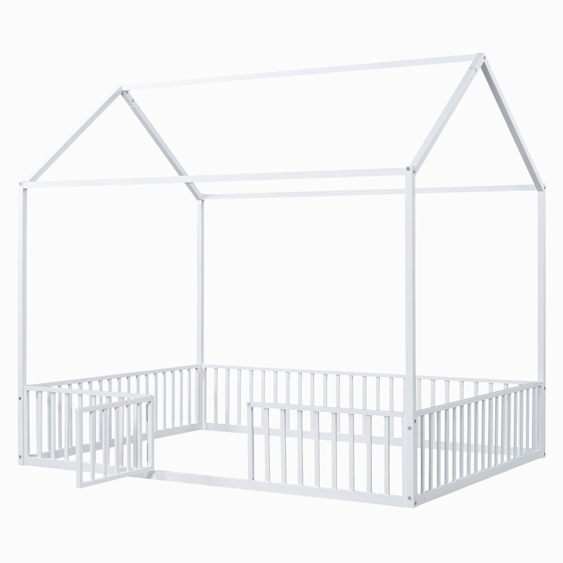 Full Size Metal House Bed With Fence And Door - White