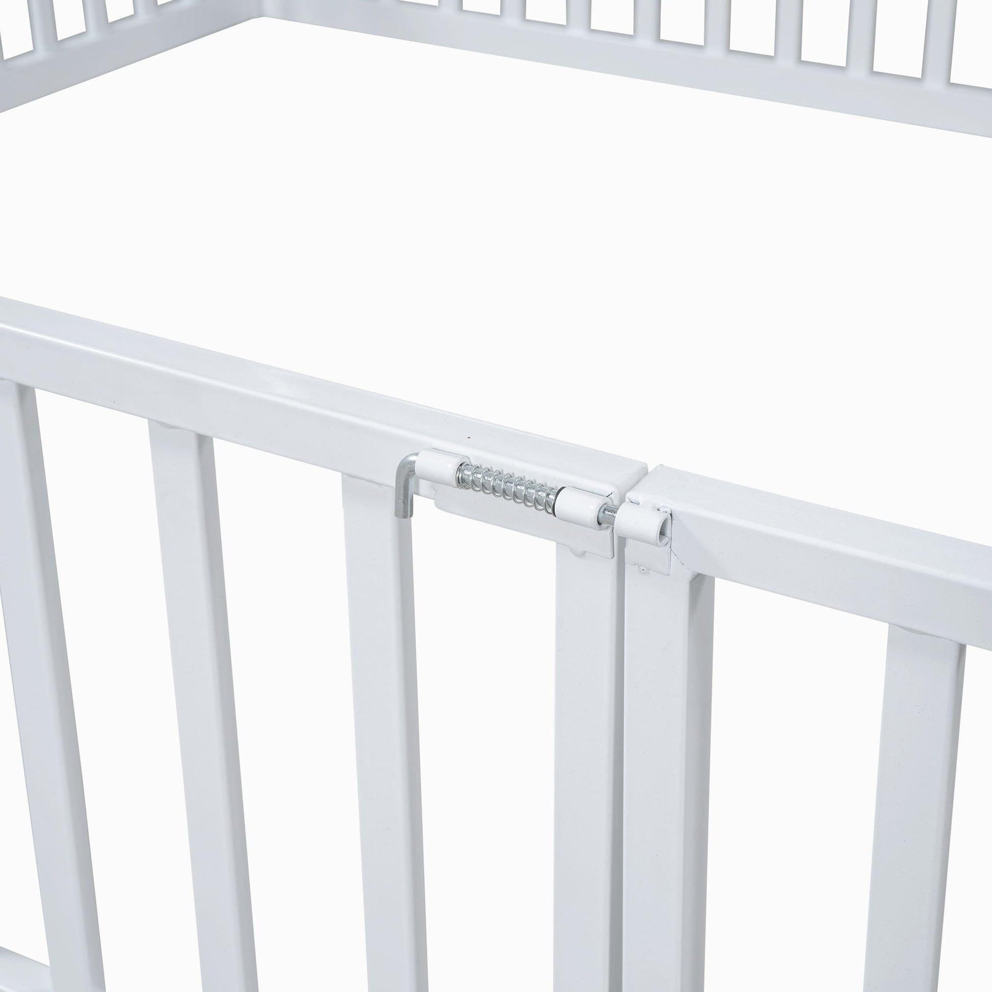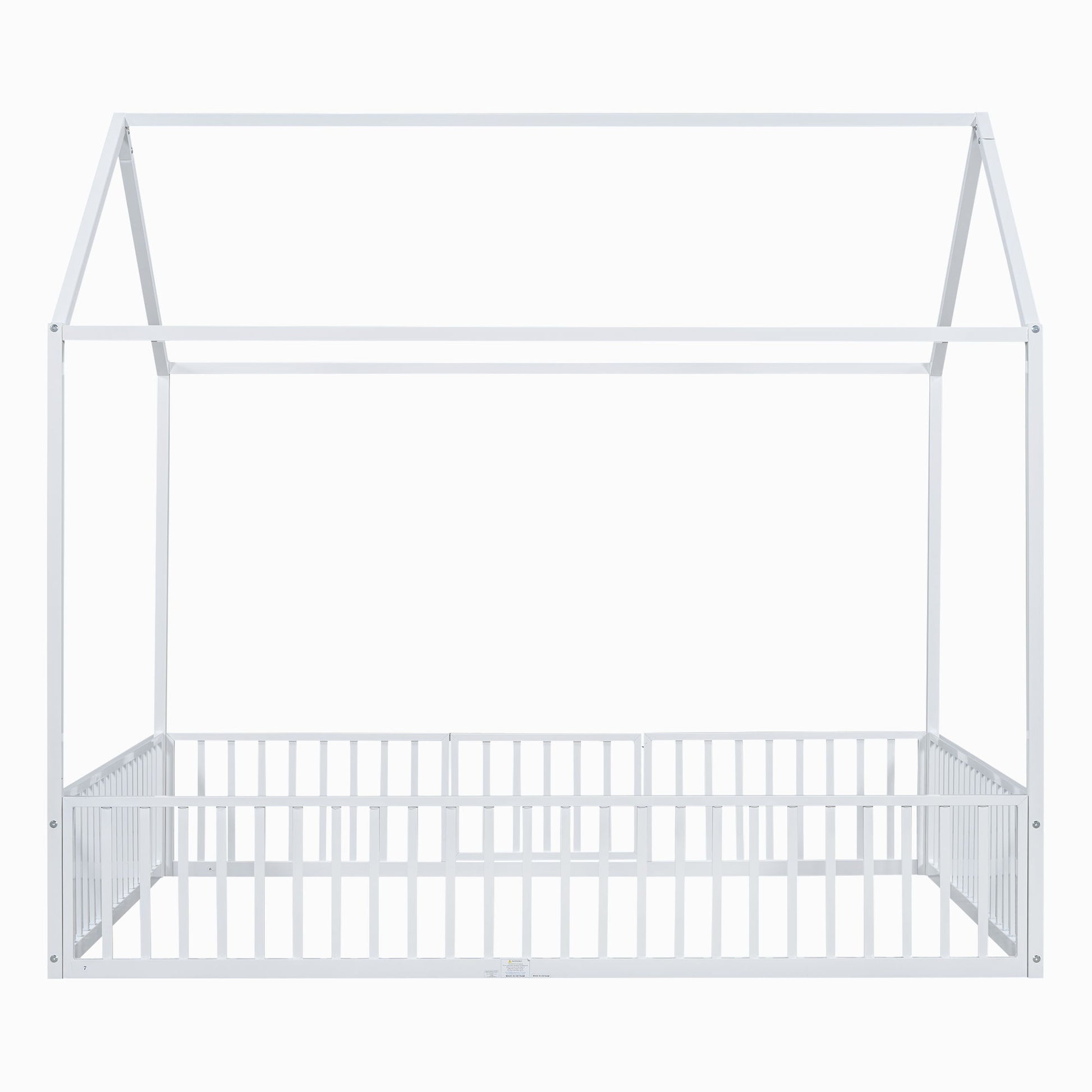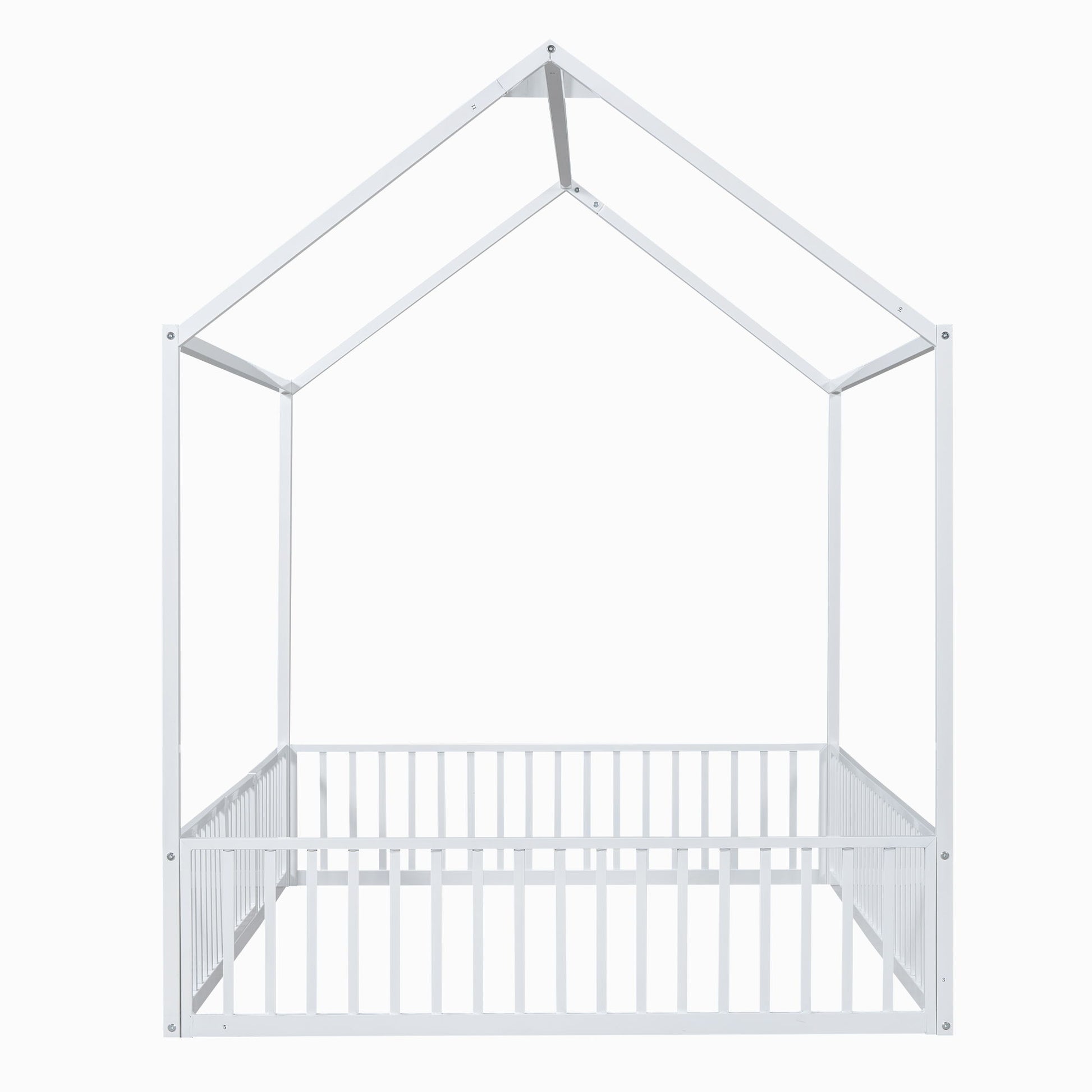 Full Size Metal House Bed With Fence And Door - White