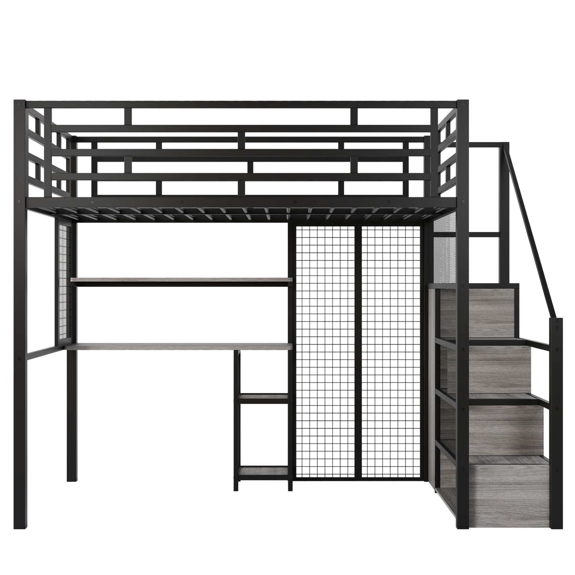 Full Size Metal Loft Bed With Wardrobe, Desk, Storage Shelves - Black